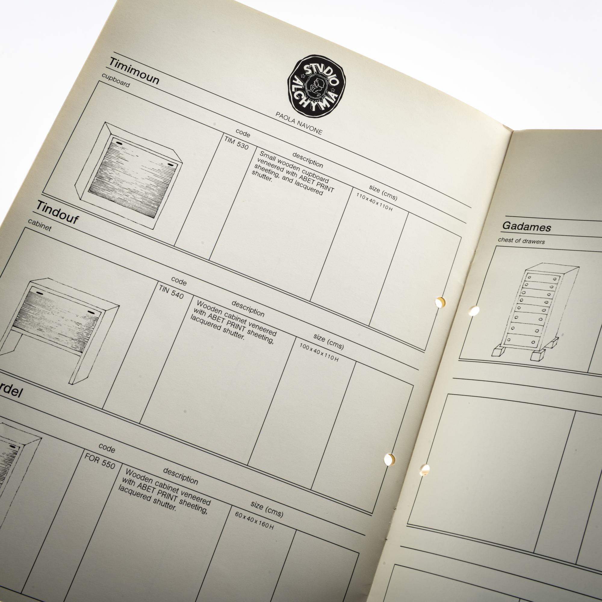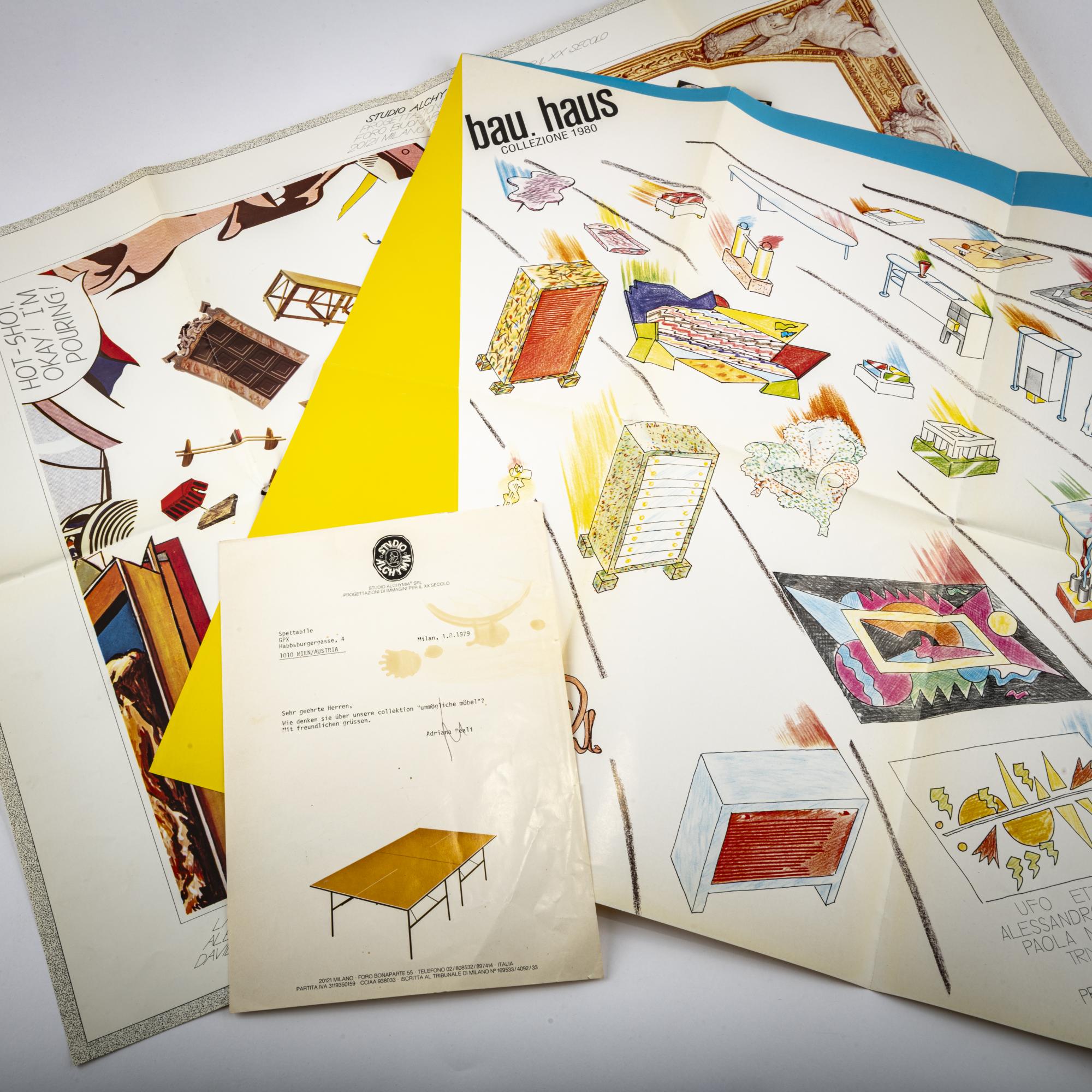 Studio Alchymia: Technical catalogue, edition 1980. bau.haus. art collection, Mailand 1980, dabei: Poster bau.haus collezione 1980, H. 61 x 84,5 cm.; Studio Alchymia: Technische Unterlagen 1979, Mailand 1979, dabei: Poster, H. 61 x 84,5 cm.; Anschreiben "unmögliche Möbel", August 1979.