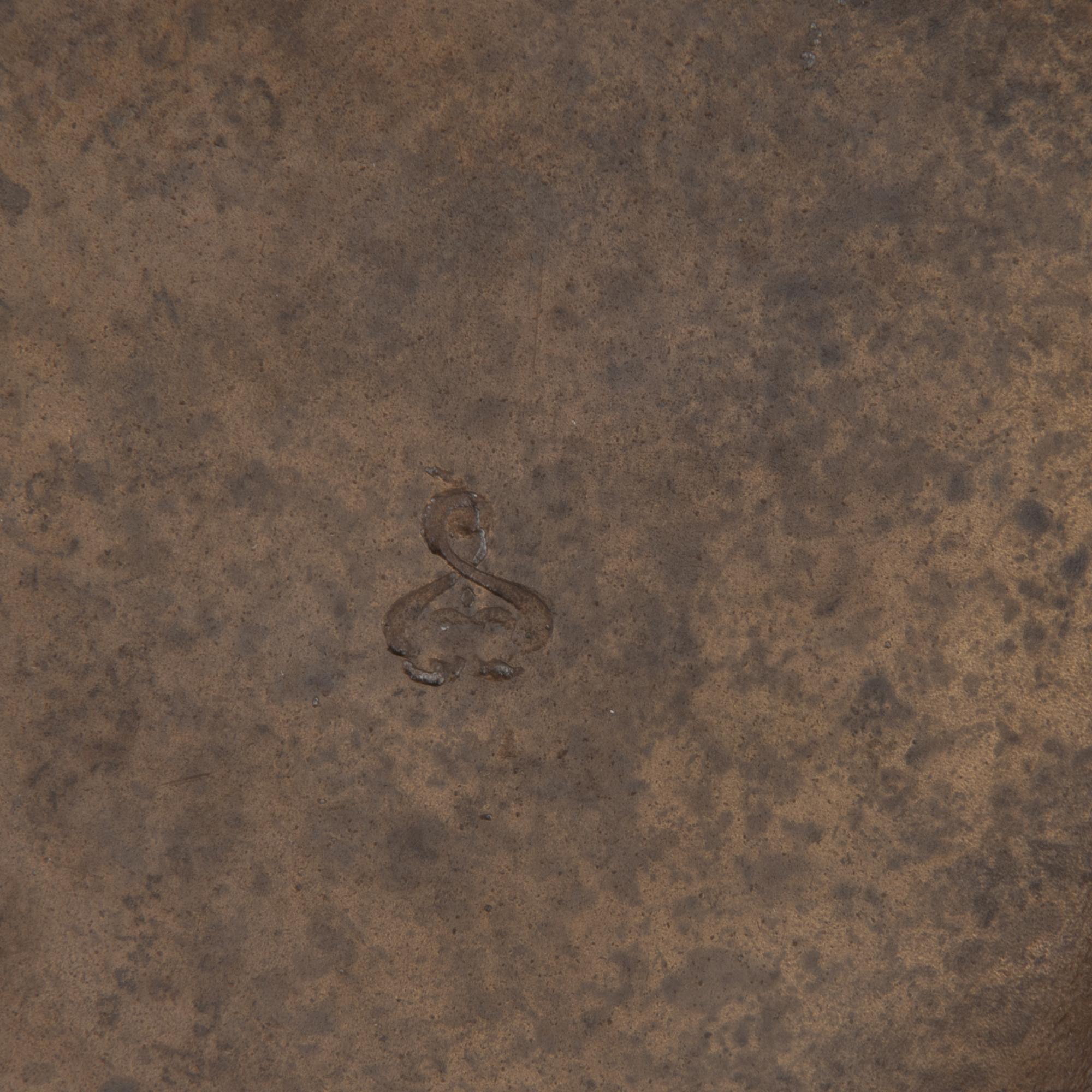 Blattform mit stengelartig gebogenem Griff. H. 2,2 cm, 15,5 x 12,5 cm. Bronze. Sign.: Künstlersignet.
