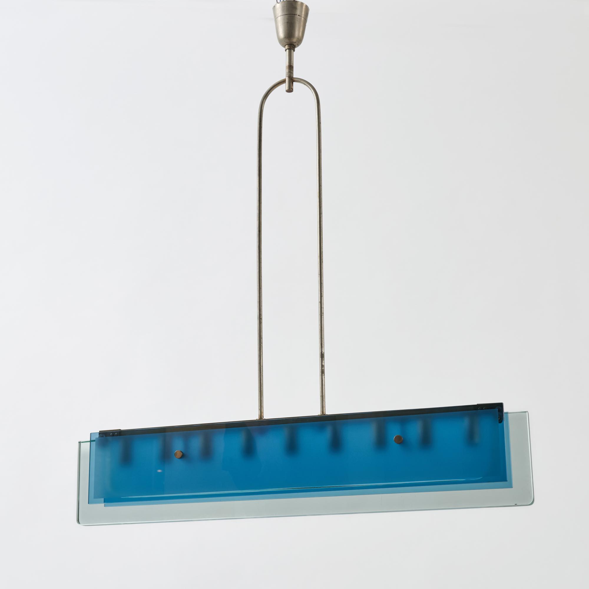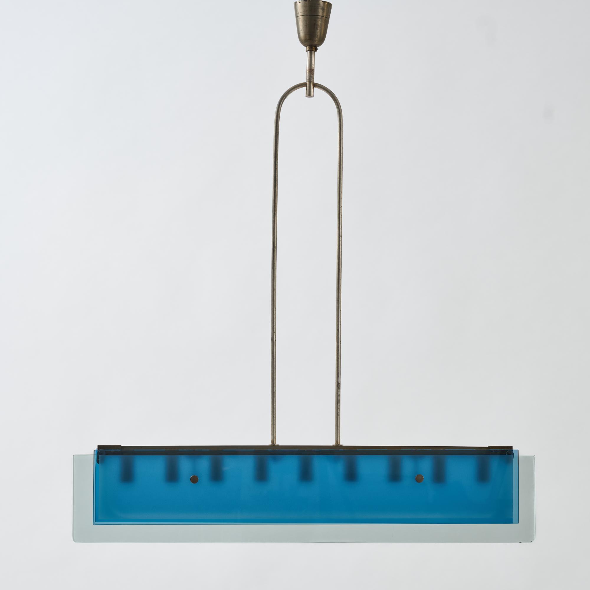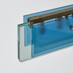 Glasblock, farblos, blau, einseitig mattiert, Messingrohr, Messingblech.