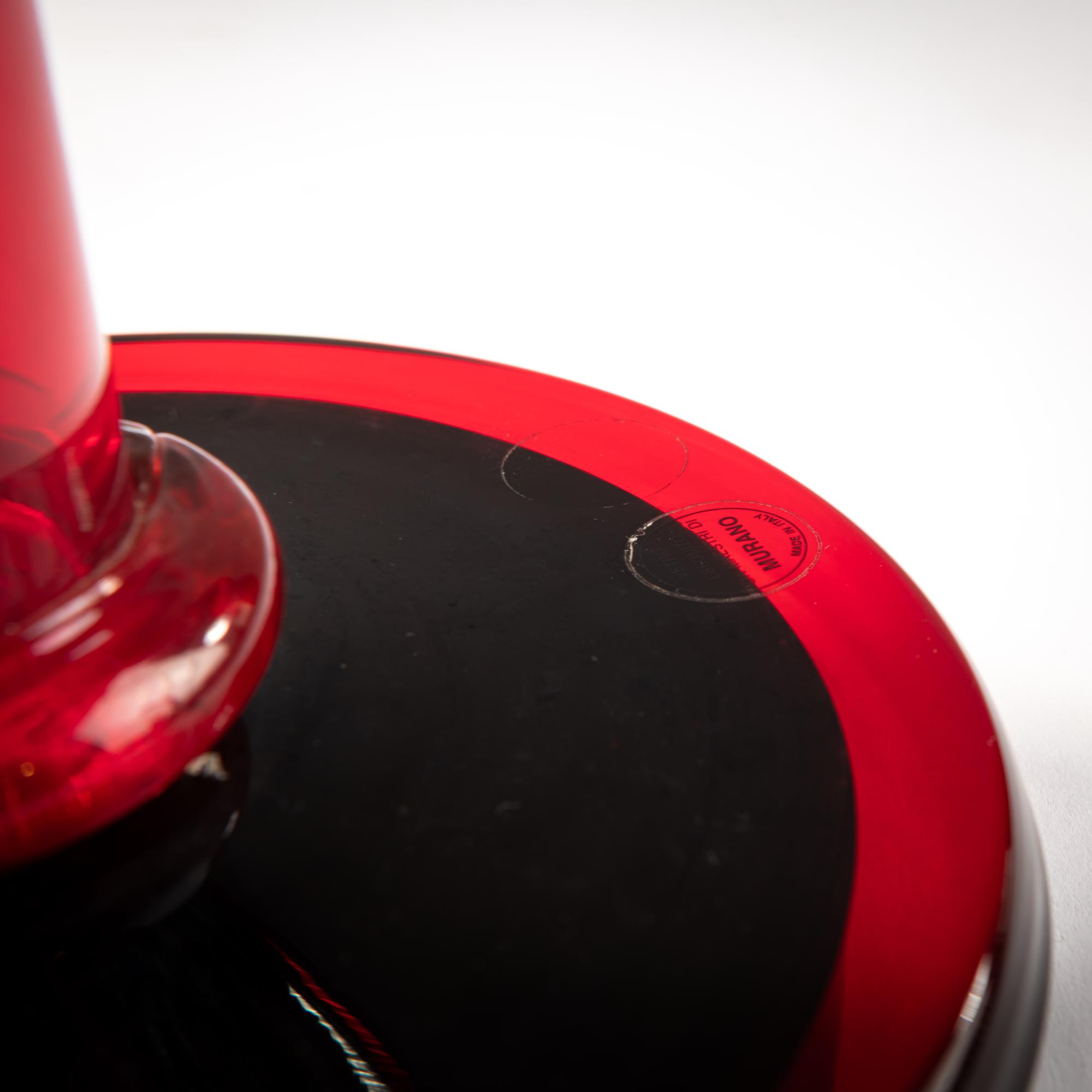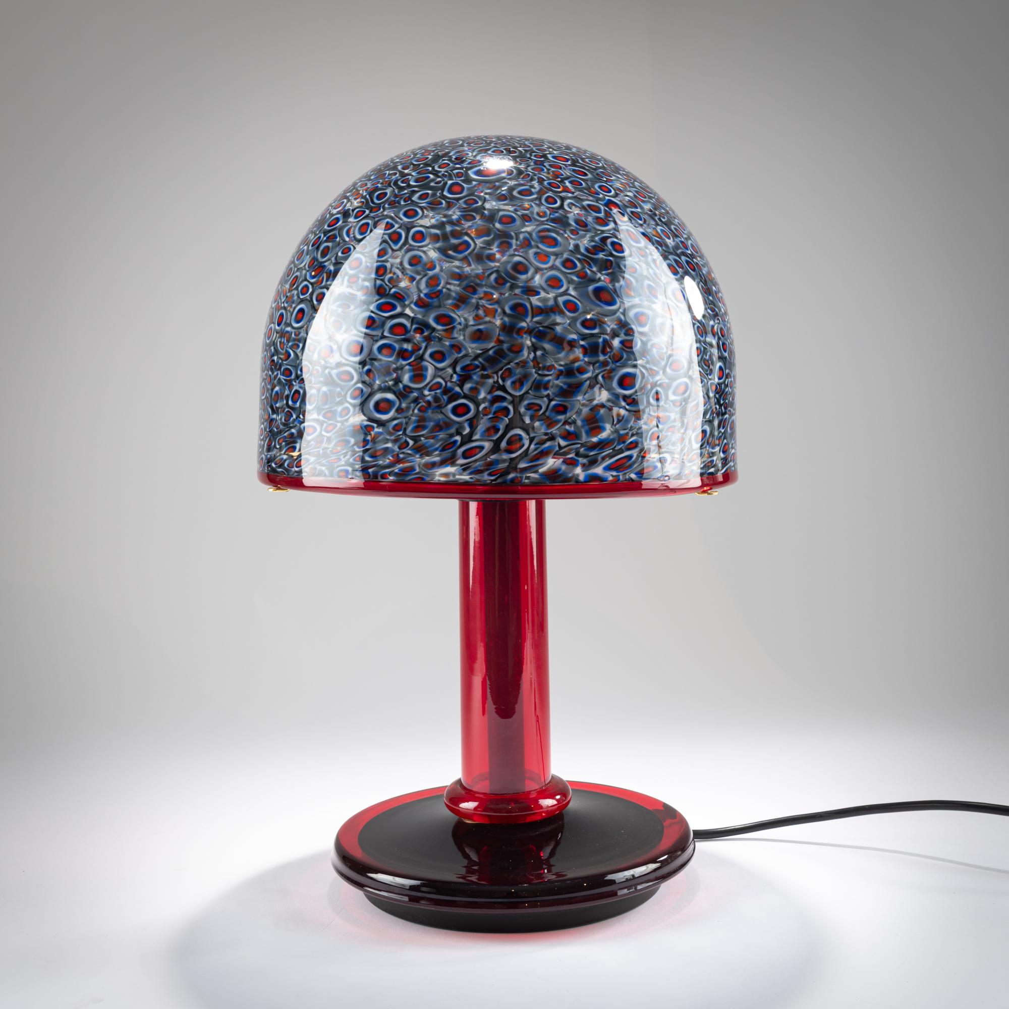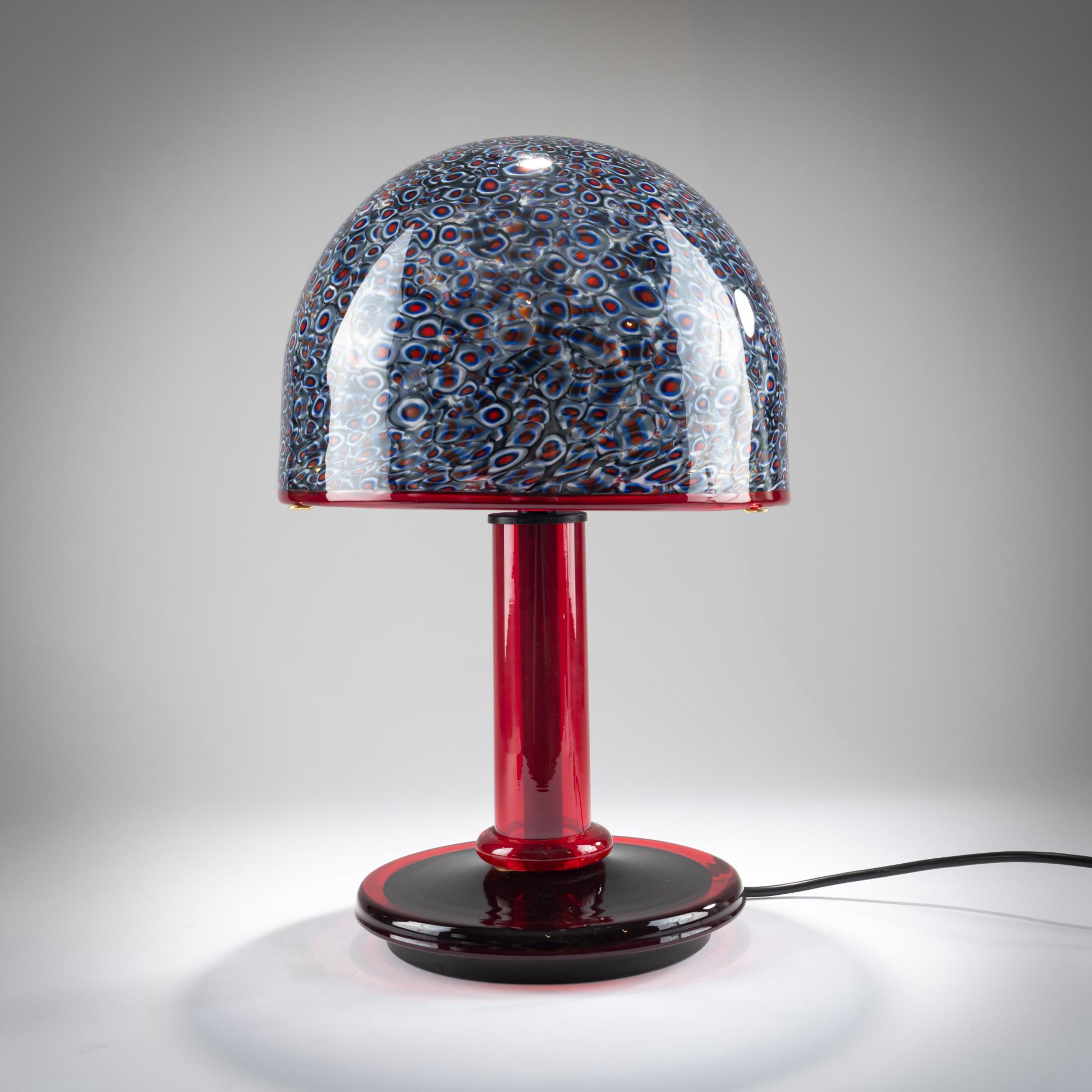 Metallfuß, schwarz lackiert, bzw. Messing, rotes Glas. Schirm aus farblosem Glas mit eingeschmolzenen Murrinen, rot blau und weiß, rot umschmolzener Rand.