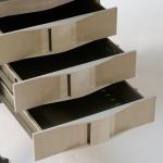 Metallblech, Metallprofile, schwarz bzw. grau lackiert, Holzimitat, grauer Kunststoff.
