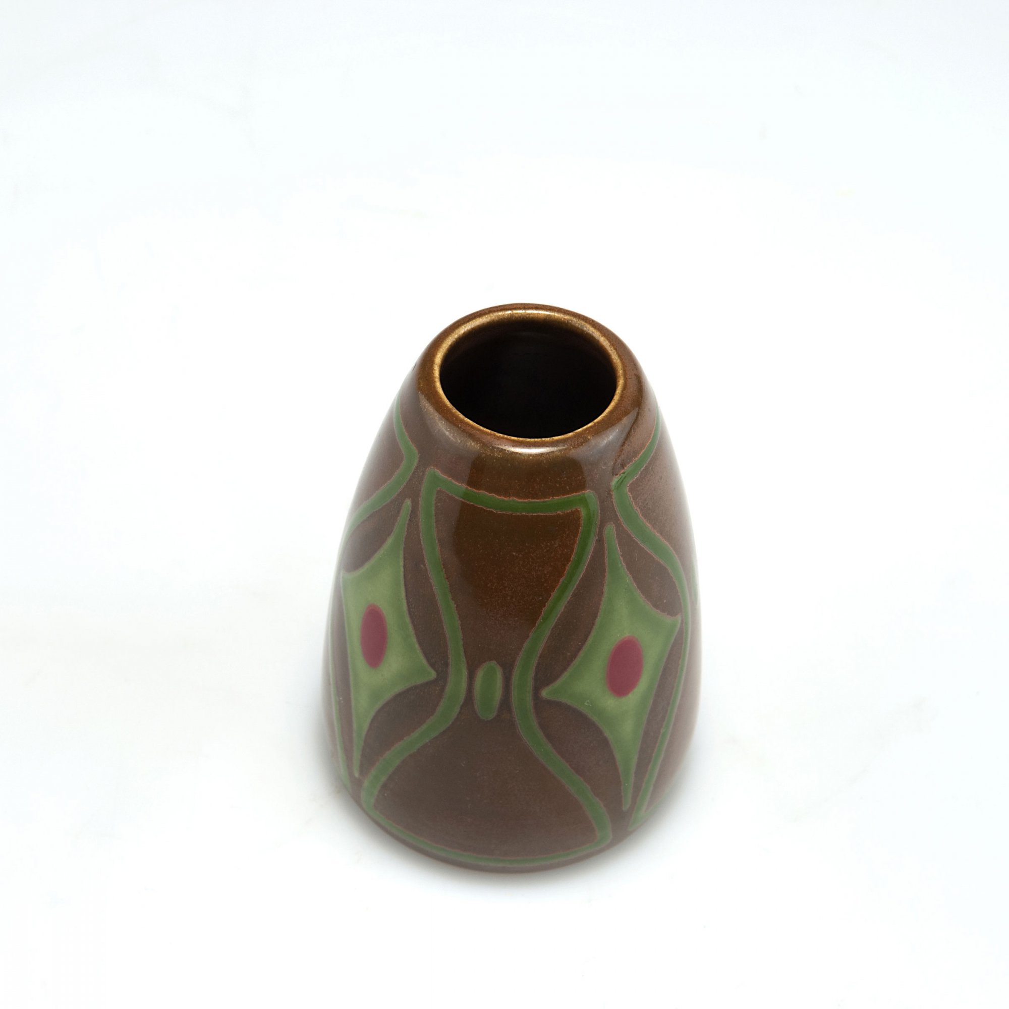 H. 7,8 cm. Entwurf: Christian Neureuther. Fayencescherben, braun, grün und rot glasiert. Bez.: Kunstabteilungsmarke, Bindenschild (Glasurstempel), 3406 (geprägt).