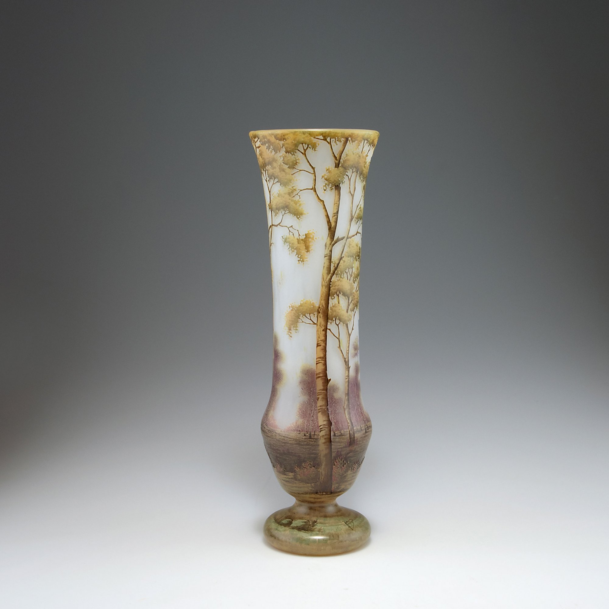 Gefußter, balusterartiger Kelch. H, 39,1 cm. Überfangglas, farblos, milchige Pulvereinschlüsse. Geätzter und fein emaillierter Dekor in grünlichen und gelblichen Tönen, partiell dunkelviolett und rotbraun. Atmosphärische Darstellung einer Heidelandschaft mit Birken. Am Fuß signiert: DAUM NANCY, Lothringer Kreuz (emaillierter Schriftzug).