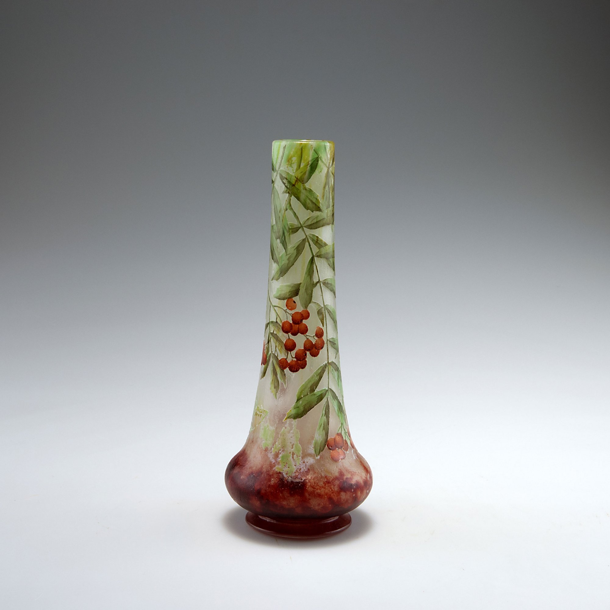 Auf abgesetztem Fuß sich vorwölbender Korpus mit langem Hals, sich zur Mündung verjüngend. H. 22 cm. Entwurf: Henri Bergé (zugeschrieben). Überfangglas, milchig weißliche, grüngelbe und ochsenblutrote Pulvereinschlüsse, Emailaufschmelzungen in Weiß und Grün. Mit Email gehöhtes Motiv mit Vogelbeere. An der Wandung signiert: DAUM NANCY, Lothringer Kreuz (hochgeätzter Schriftzug).