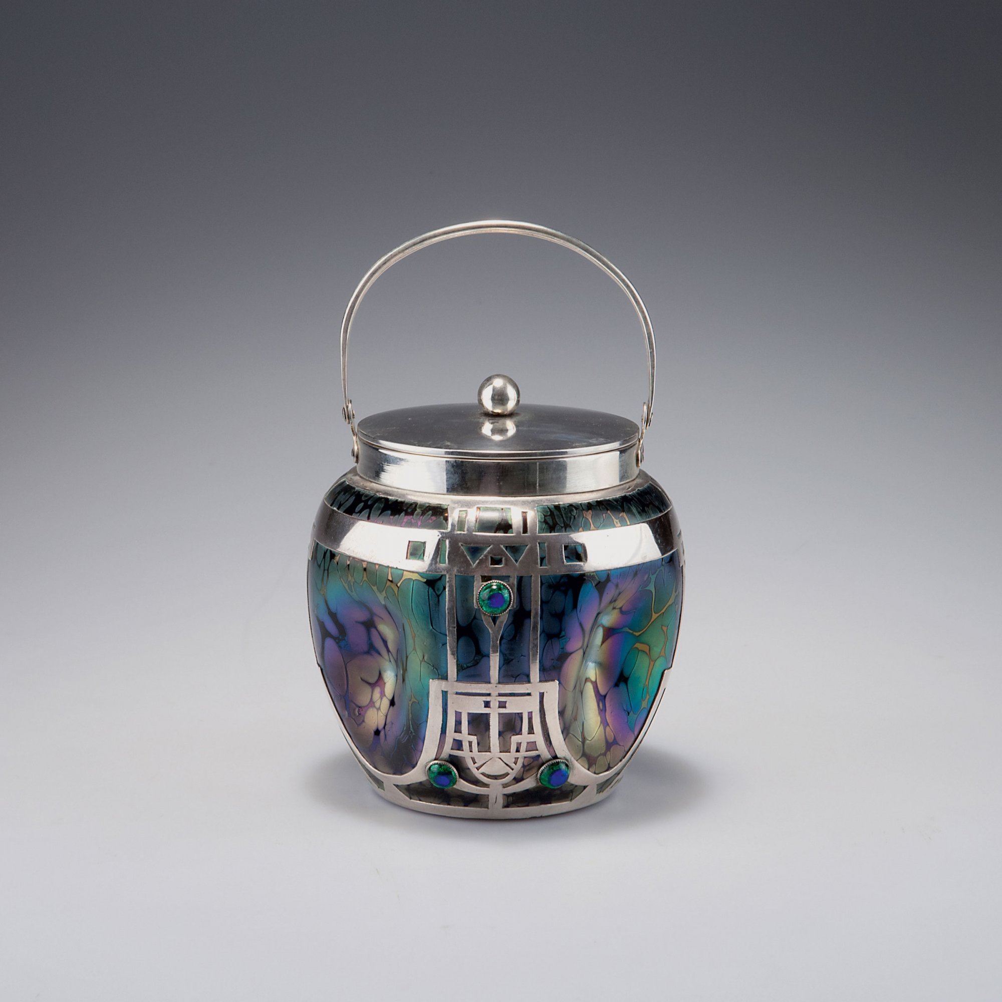 Vierfach eingedellte Rundform. H. 23 cm. Violett getöntes Glas, silbergelbe Kröselaufschmelzungen, stark petrolfarben lüstriert; geometrische Silberauflage mit drei folienunterlegten Glascabochons; versilberte Metallmontierung.