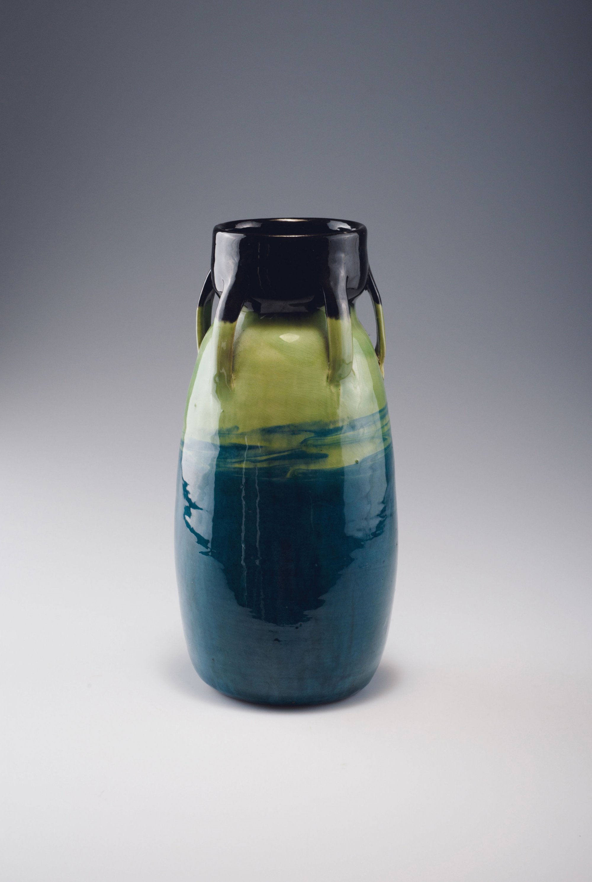 Hohe Ovalform, eingezogener Hals mit ausgebauchtem Mündungsbereich. Vier flache Henkel. H. 29,4 cm. Majolikascherben, weiß engobiert, anthrazit, hell- und dunkelgrün glasiert. Bez.: MLK GESETZL. GESCHZT, MUSTER GESETZL. GESCHTZT, 174, weiteres Zeichen (geprägt).