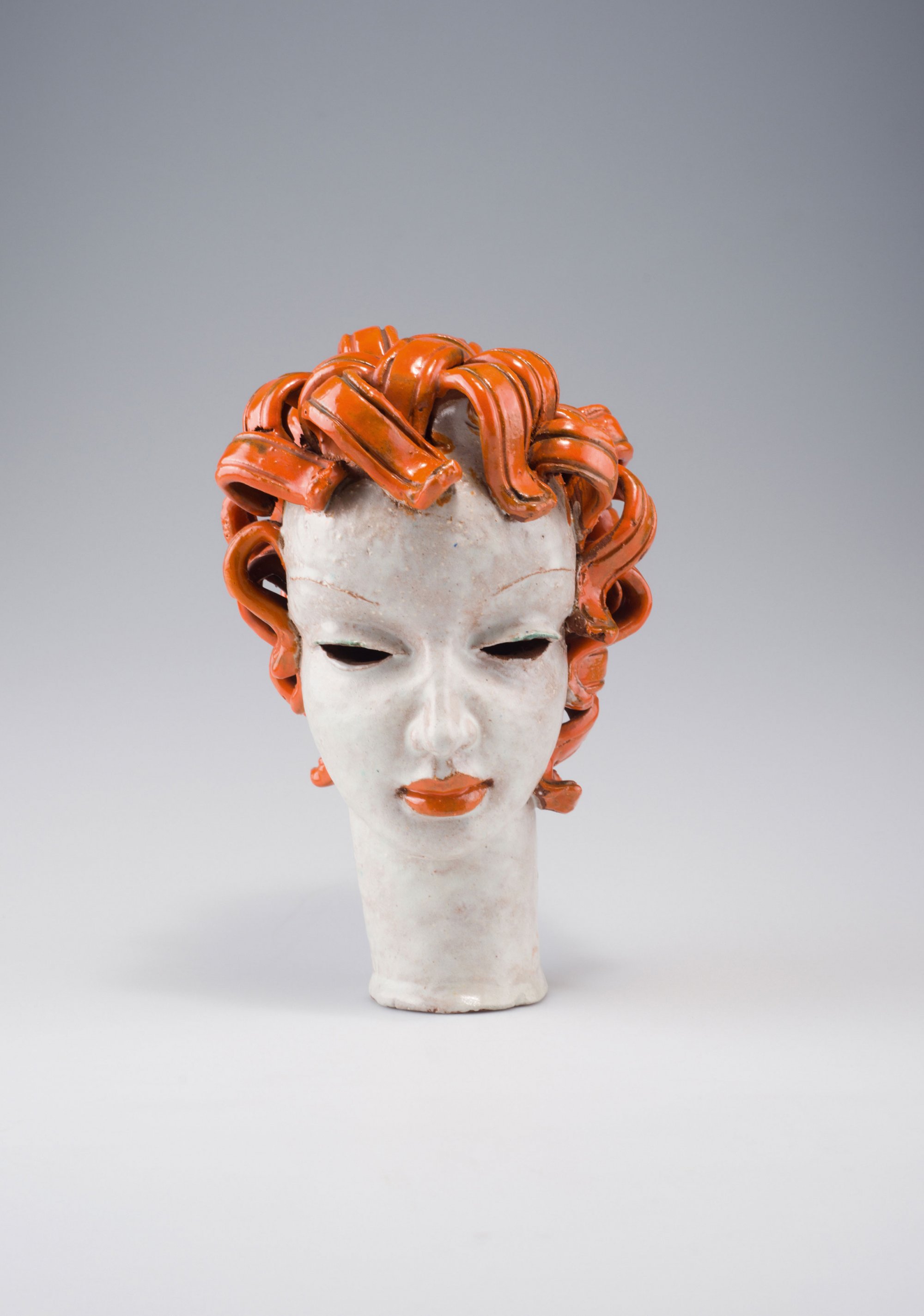 Mit wilden Locken, Blick gesenkt. H. 24,5 cm. Majolikascherben, orangerot und weiß glasiert. Hals bez.: R. KNÖRLEIN (vertieft).