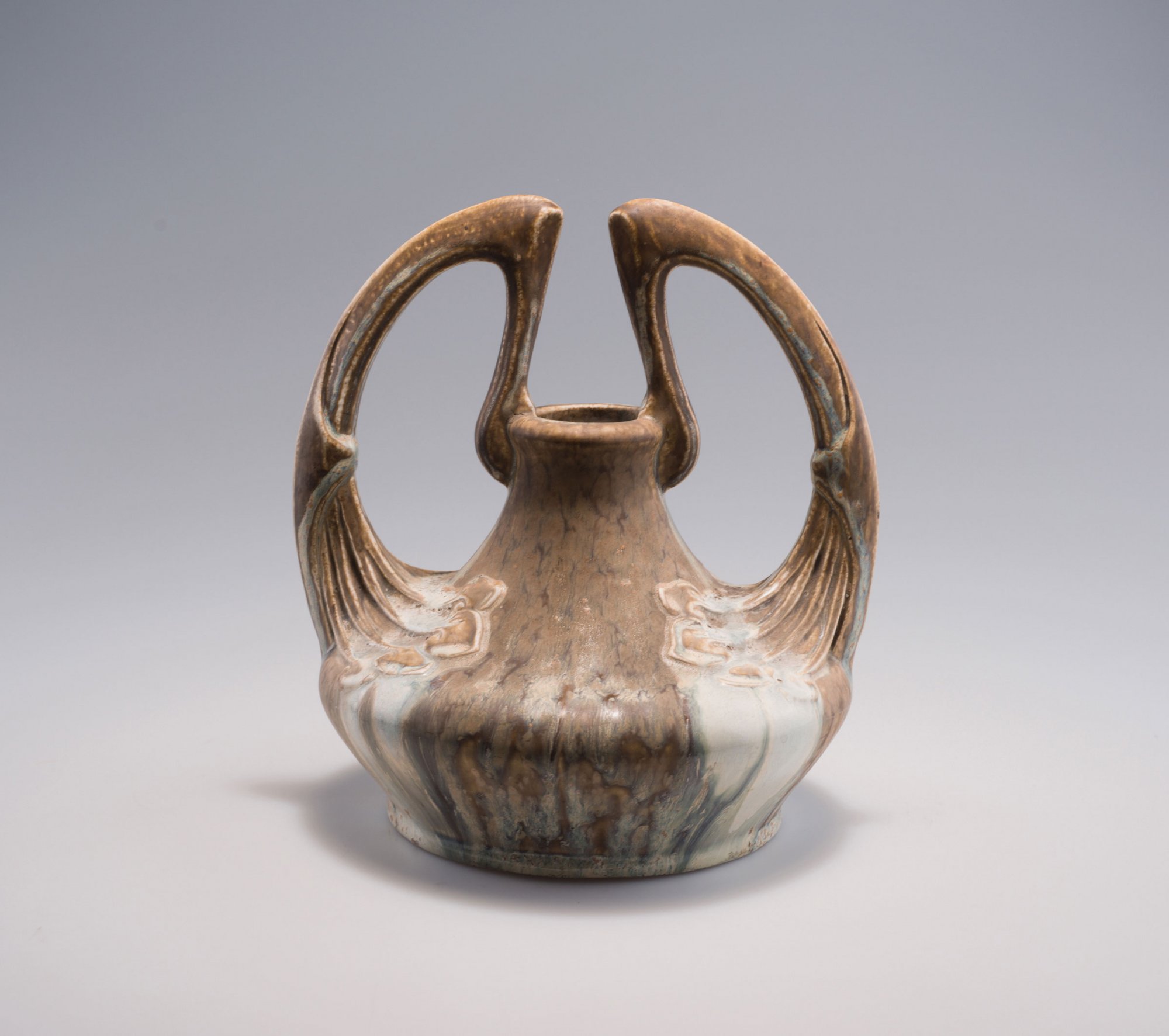 H. 23,7 cm. Steingutscherben, wolkigbraun glasiert über heller Engobe. Bez.: Manufakturmarke J.v.S. mit der Nürnberger Burg, NORISTA, 53 (geprägt).