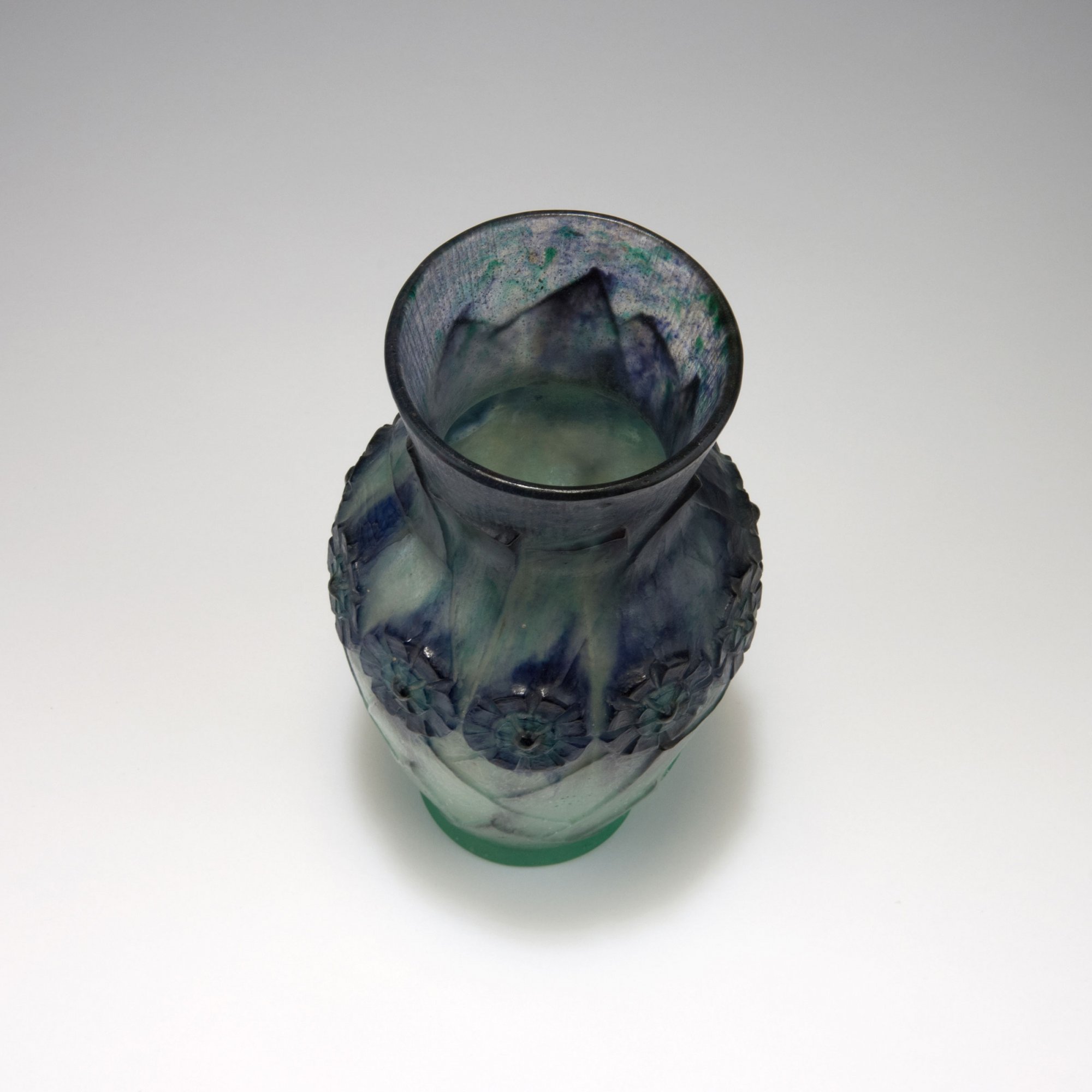 Ovoider Korpus mit trichterförmiger Mündung. H. 22 cm. Pâte de verre, transluzide Glasmasse, grüne und blaue Farbeinschlüsse, reliefierter Dekor, dreieckige Blätter und umlaufender Fries aus Blütenrosetten. Signiert: G. ARGY-ROUSSEAU (geprägt).