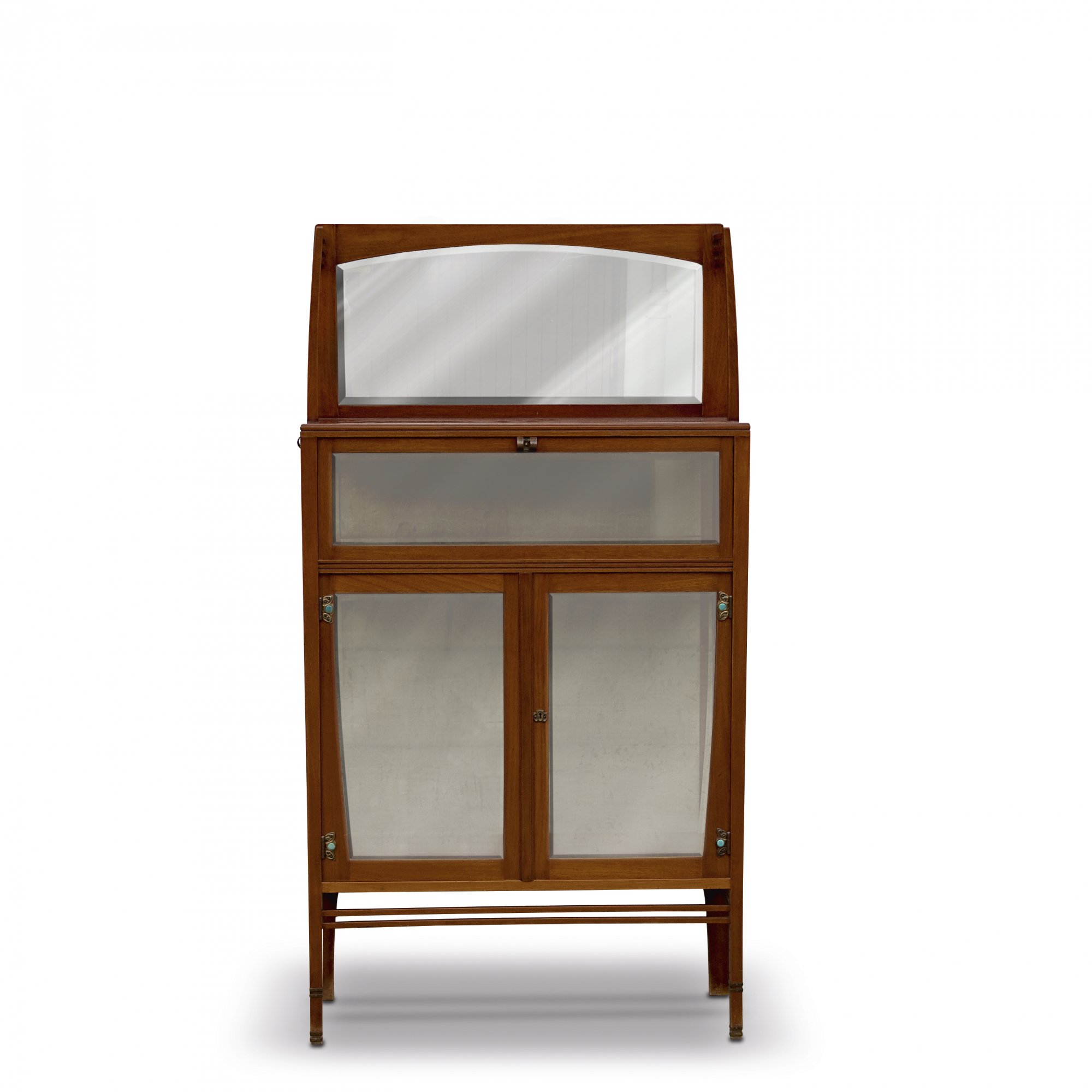 Auf leicht konischen Pfostenbeinen dreistöckiger Aufbau, zweitürige Front, darüber dreiseitiges Fach mit klappbaren Türen, zurückgesetzter Spiegelaufsatz. H. 186 cm; 99 x 35 cm. Mahagoni, Messingbeschläge, türkise Cabochons. Scheiben und Spiegel facettiert. Schlüssel bez.: SERRURIER BOVY.
