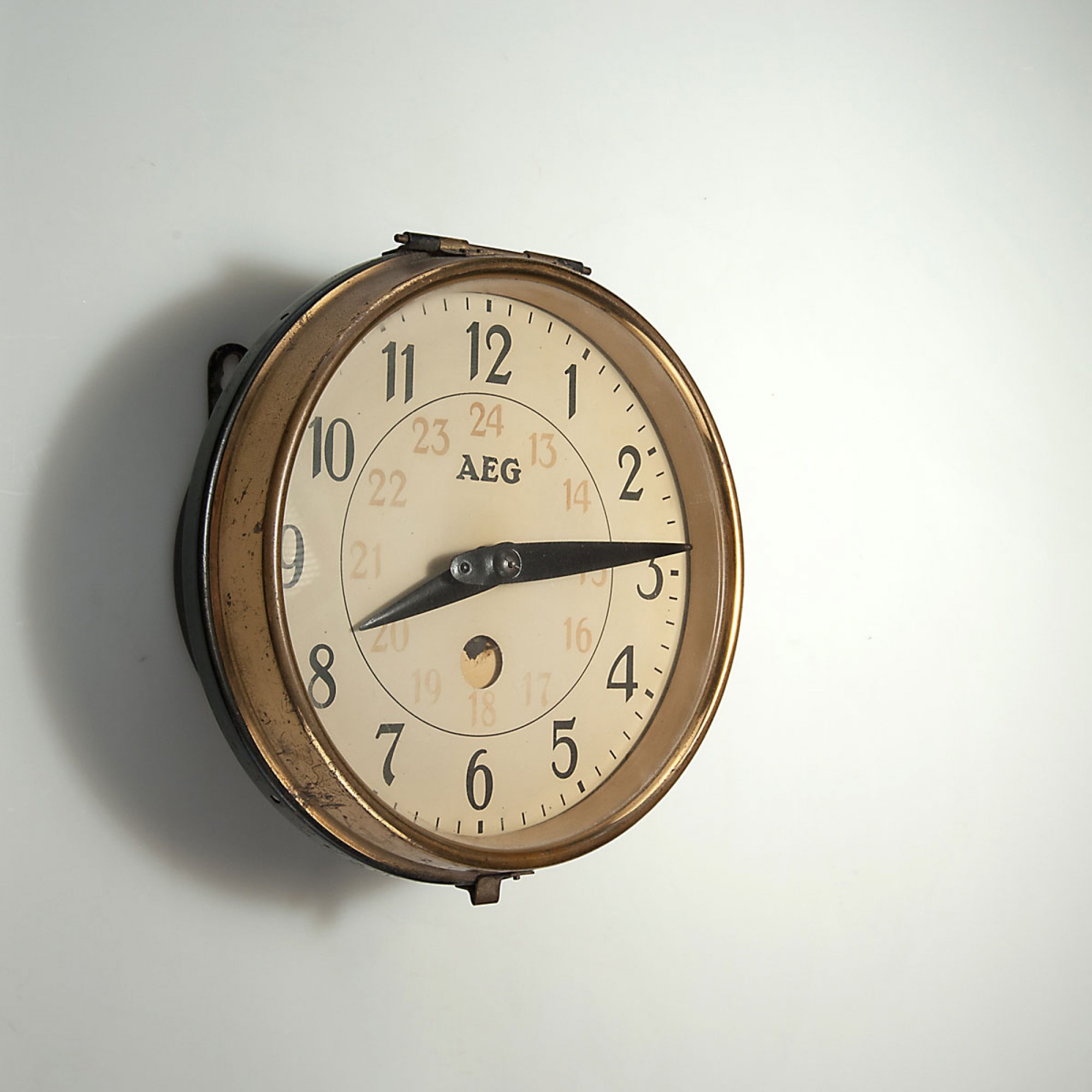 Metallblech, dunkel patiniert, Messing, farbloses Glas, weißes Zifferblatt mit schwarzen und roten Zahlen, schwarz lackierte Zeiger.