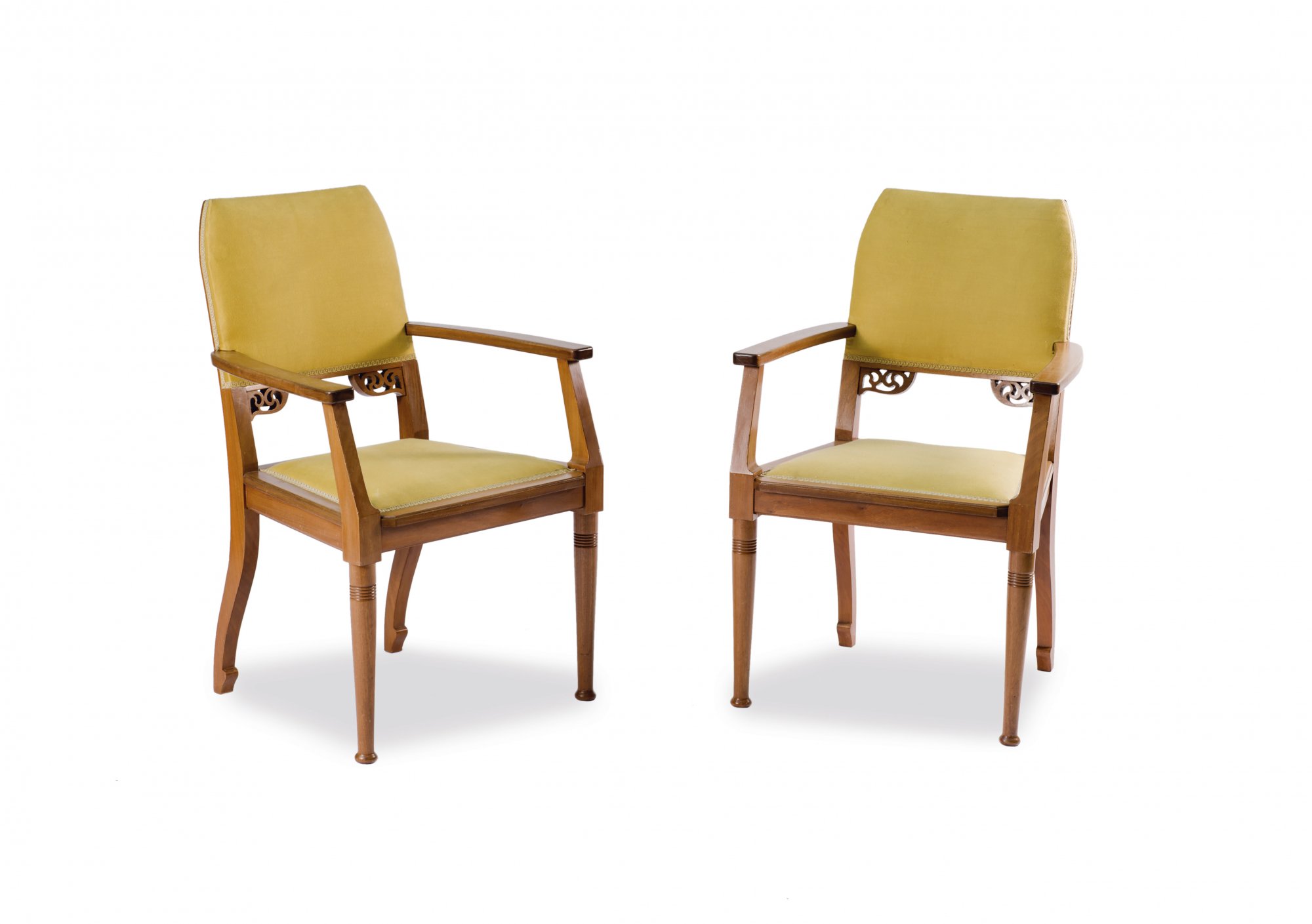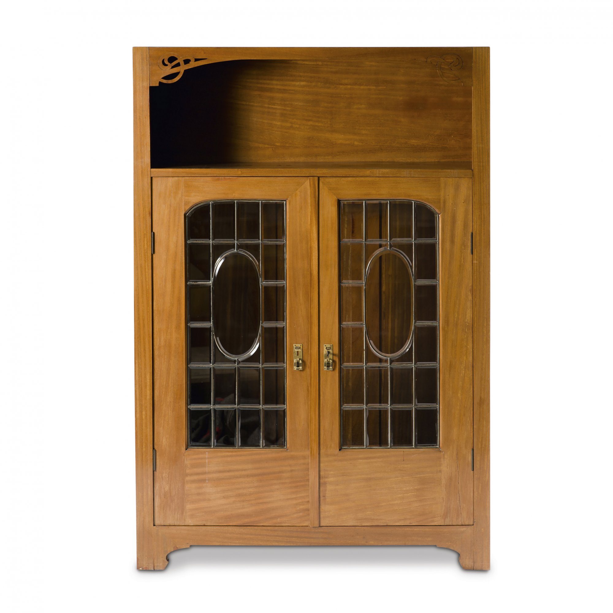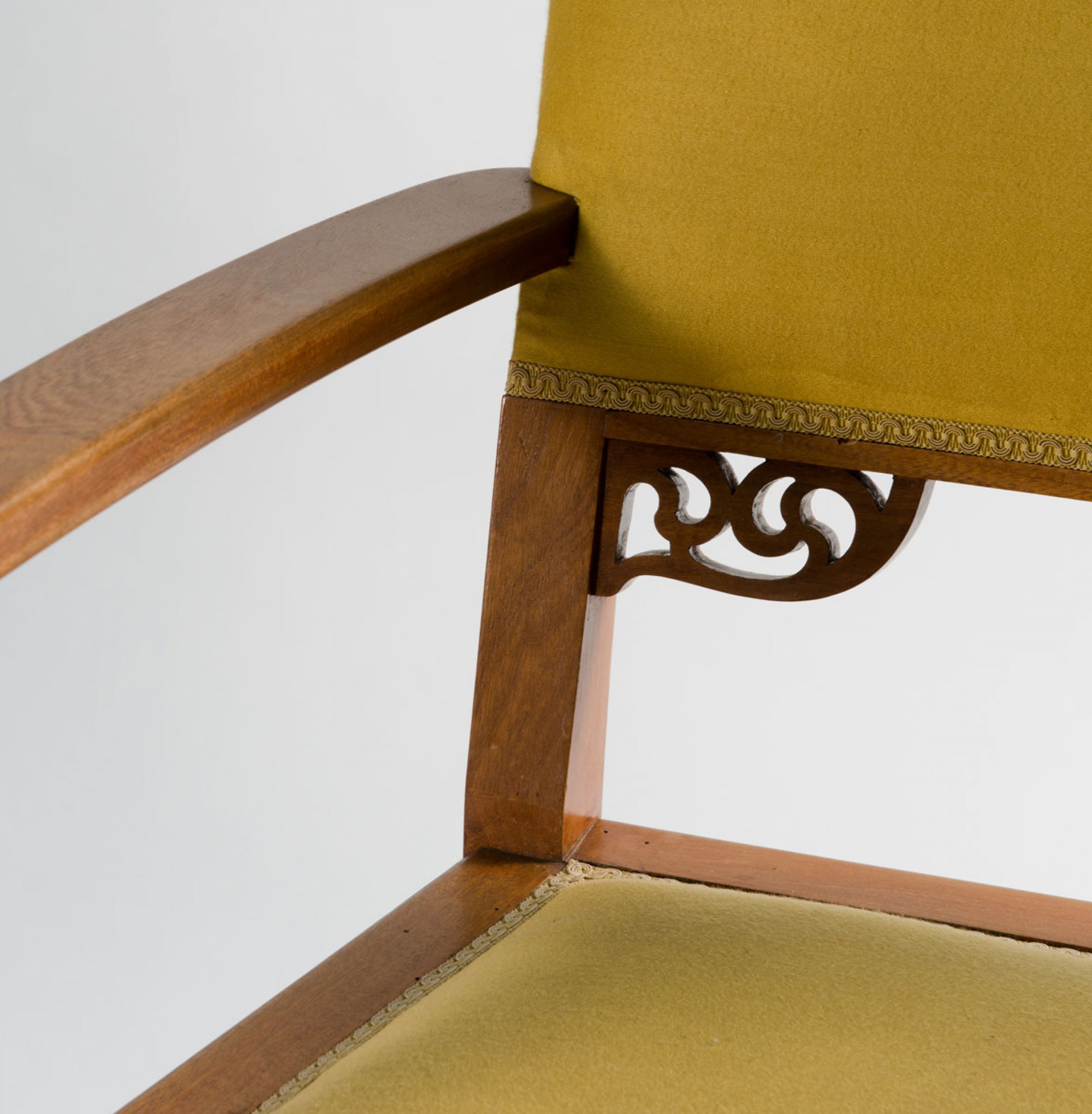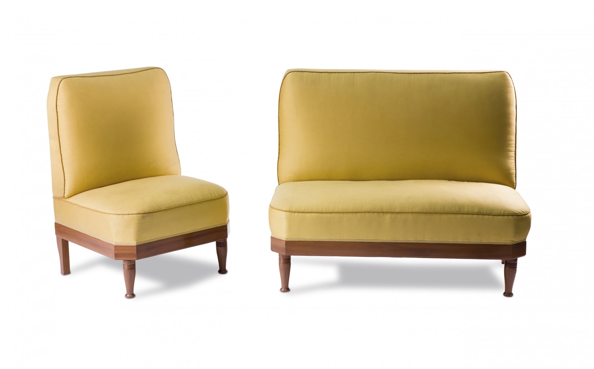 Neun Teile. 2 Armlehnstühle, H. 95,5 cm; 63 x 63,5 cm; Sessel, H. 106 cm; 75 x 70 cm; Sofa: H. 106 cm; 127 x 70 cm; Beistelltisch: H. 78 cm; 50 x 50 cm; Tisch, H. 78,5 cm; 113 x 72 cm; Eckschrank, H. 189,5 cm; 93 x 82 cm; Schrank, H. 162 cm; 108,5 x 35 cm; kleine Vitrine, H. 98 cm; 69,5 x 45 cm. Ausführung: Dresdner Werkstätten, Hellerau. Mahagoni, durchbrochene Rankenornamentik. Geschliffenes Spiegelglas, gelbe Samtpolsterung.(erneuert).