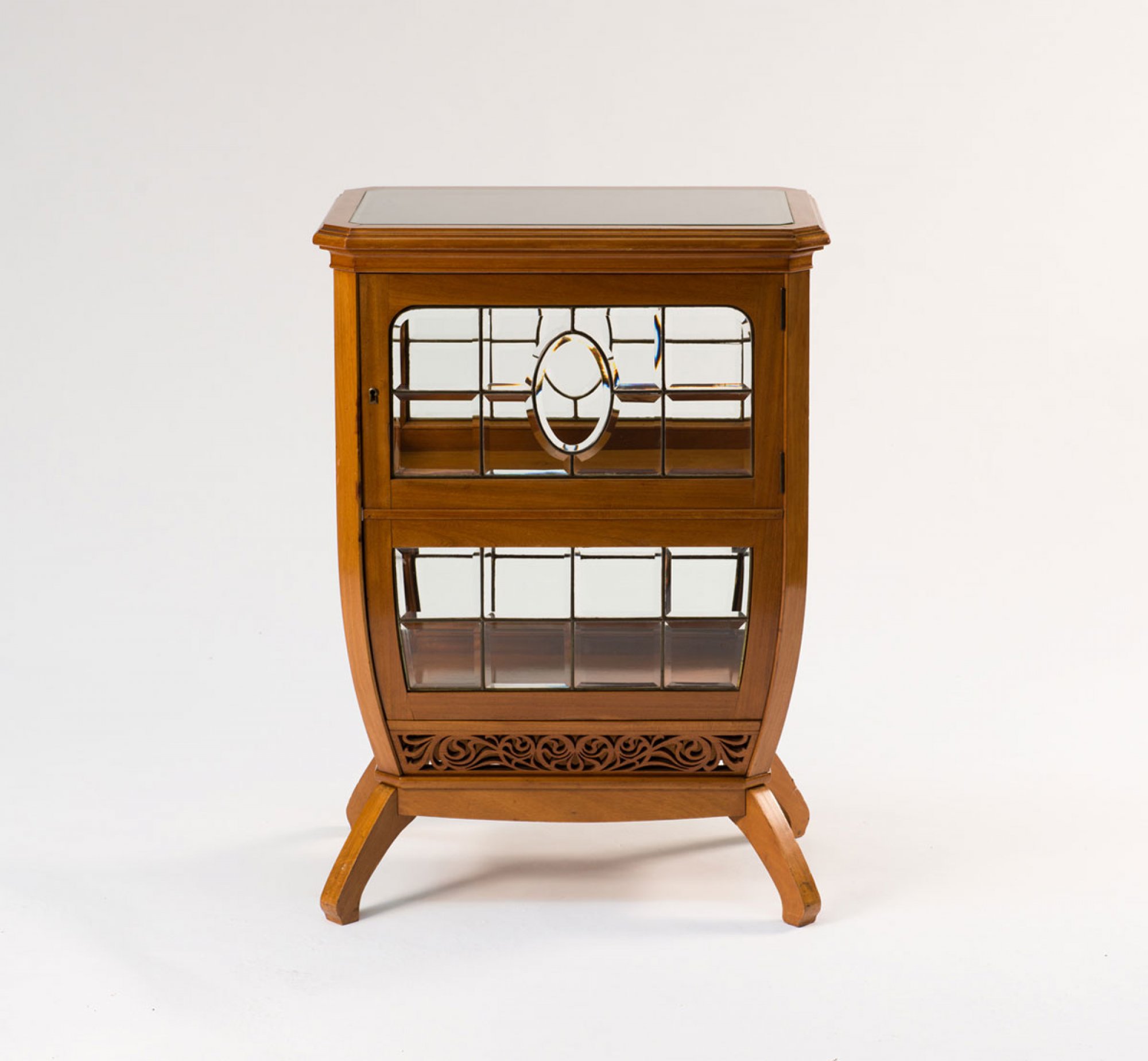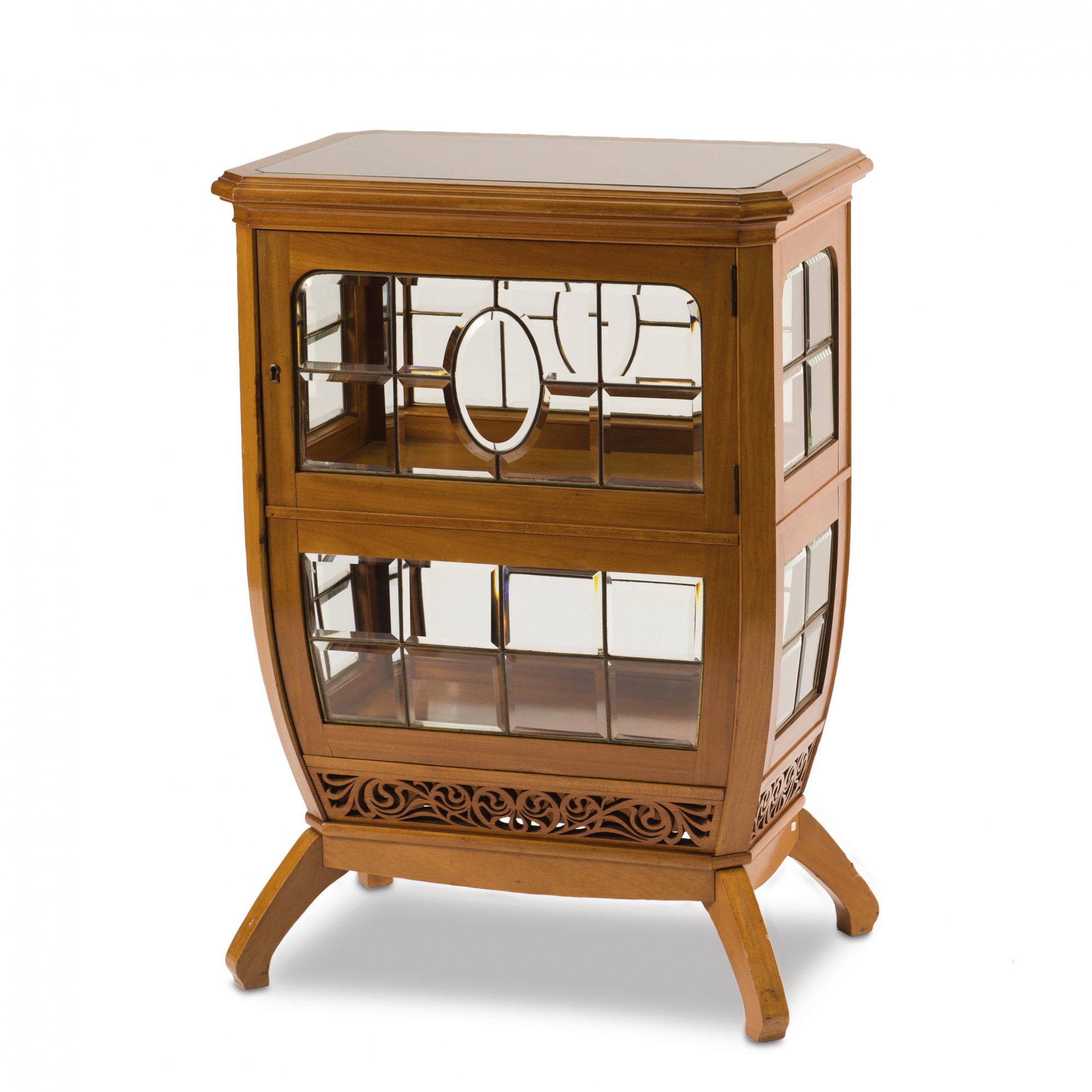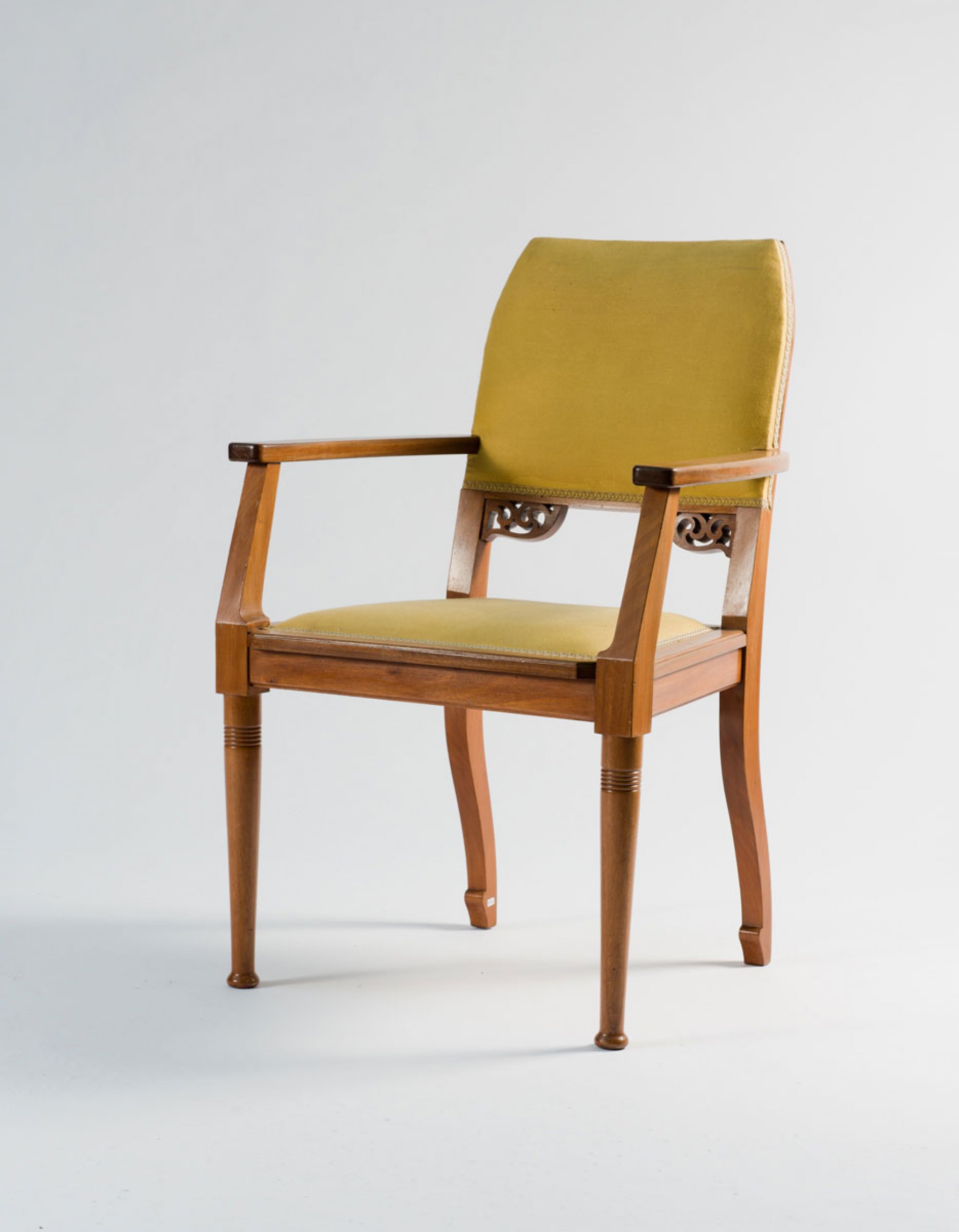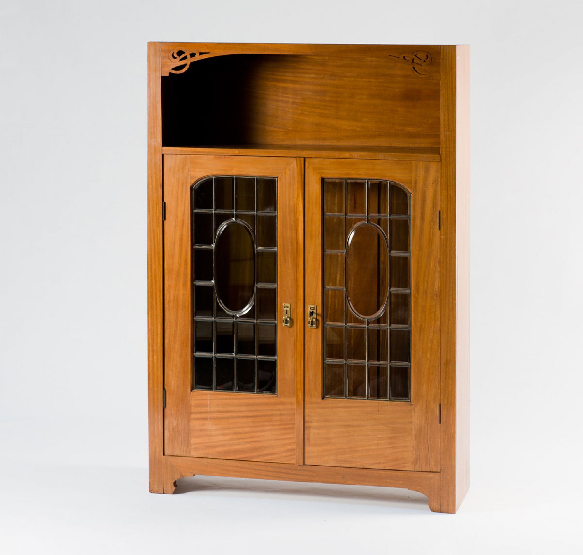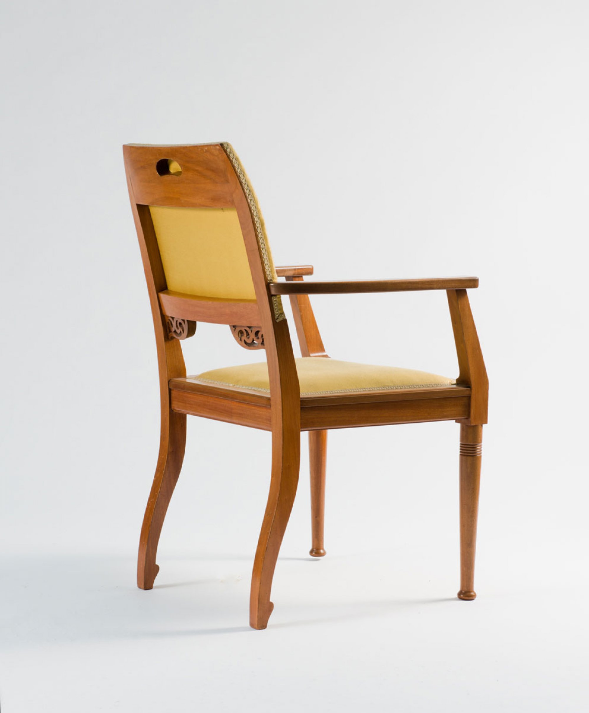 Neun Teile. 2 Armlehnstühle, H. 95,5 cm; 63 x 63,5 cm; Sessel, H. 106 cm; 75 x 70 cm; Sofa: H. 106 cm; 127 x 70 cm; Beistelltisch: H. 78 cm; 50 x 50 cm; Tisch, H. 78,5 cm; 113 x 72 cm; Eckschrank, H. 189,5 cm; 93 x 82 cm; Schrank, H. 162 cm; 108,5 x 35 cm; kleine Vitrine, H. 98 cm; 69,5 x 45 cm. Ausführung: Dresdner Werkstätten, Hellerau. Mahagoni, durchbrochene Rankenornamentik. Geschliffenes Spiegelglas, gelbe Samtpolsterung.(erneuert).