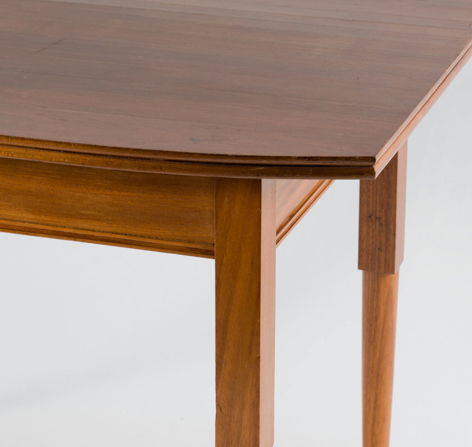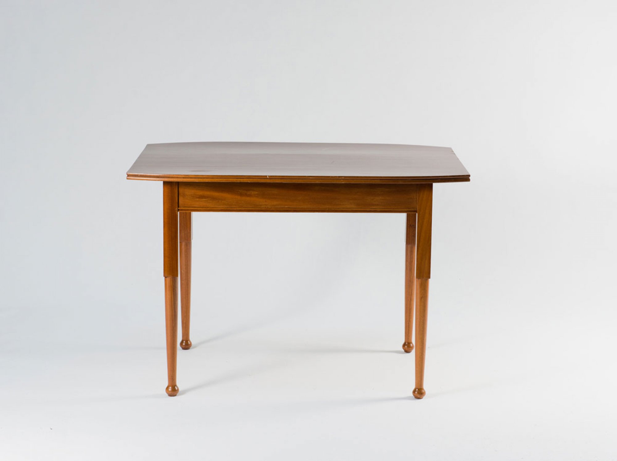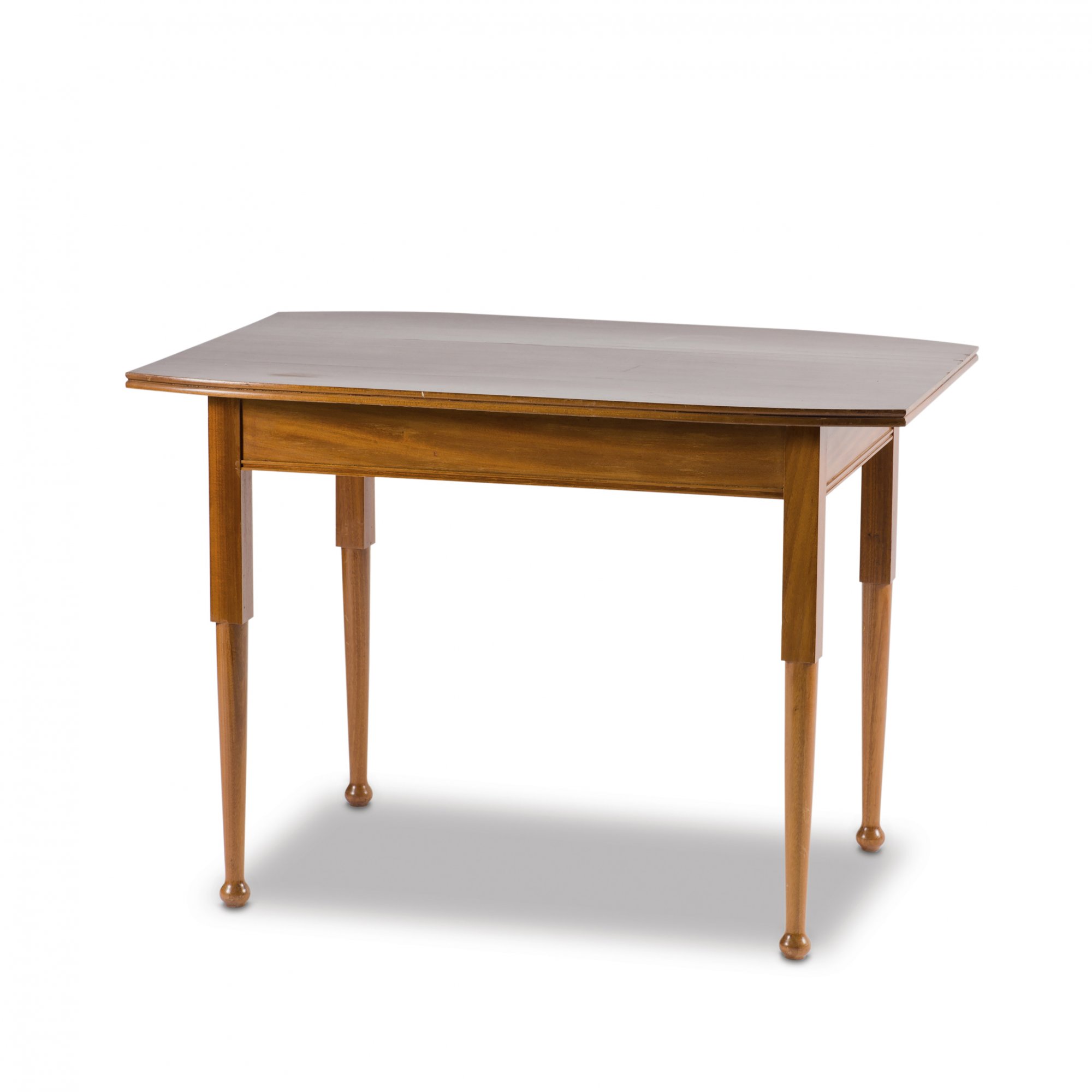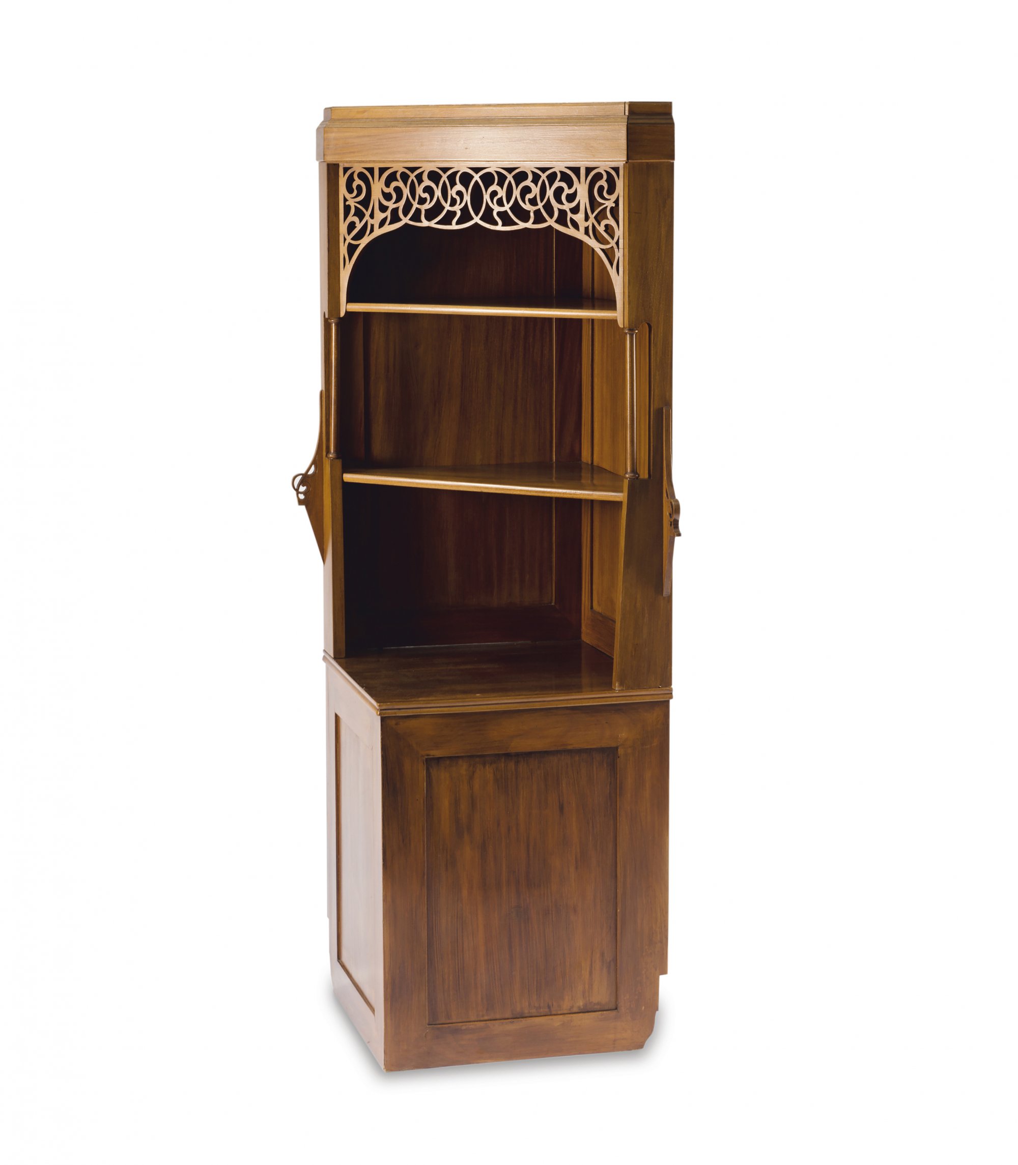 Neun Teile. 2 Armlehnstühle, H. 95,5 cm; 63 x 63,5 cm; Sessel, H. 106 cm; 75 x 70 cm; Sofa: H. 106 cm; 127 x 70 cm; Beistelltisch: H. 78 cm; 50 x 50 cm; Tisch, H. 78,5 cm; 113 x 72 cm; Eckschrank, H. 189,5 cm; 93 x 82 cm; Schrank, H. 162 cm; 108,5 x 35 cm; kleine Vitrine, H. 98 cm; 69,5 x 45 cm. Ausführung: Dresdner Werkstätten, Hellerau. Mahagoni, durchbrochene Rankenornamentik. Geschliffenes Spiegelglas, gelbe Samtpolsterung.(erneuert).