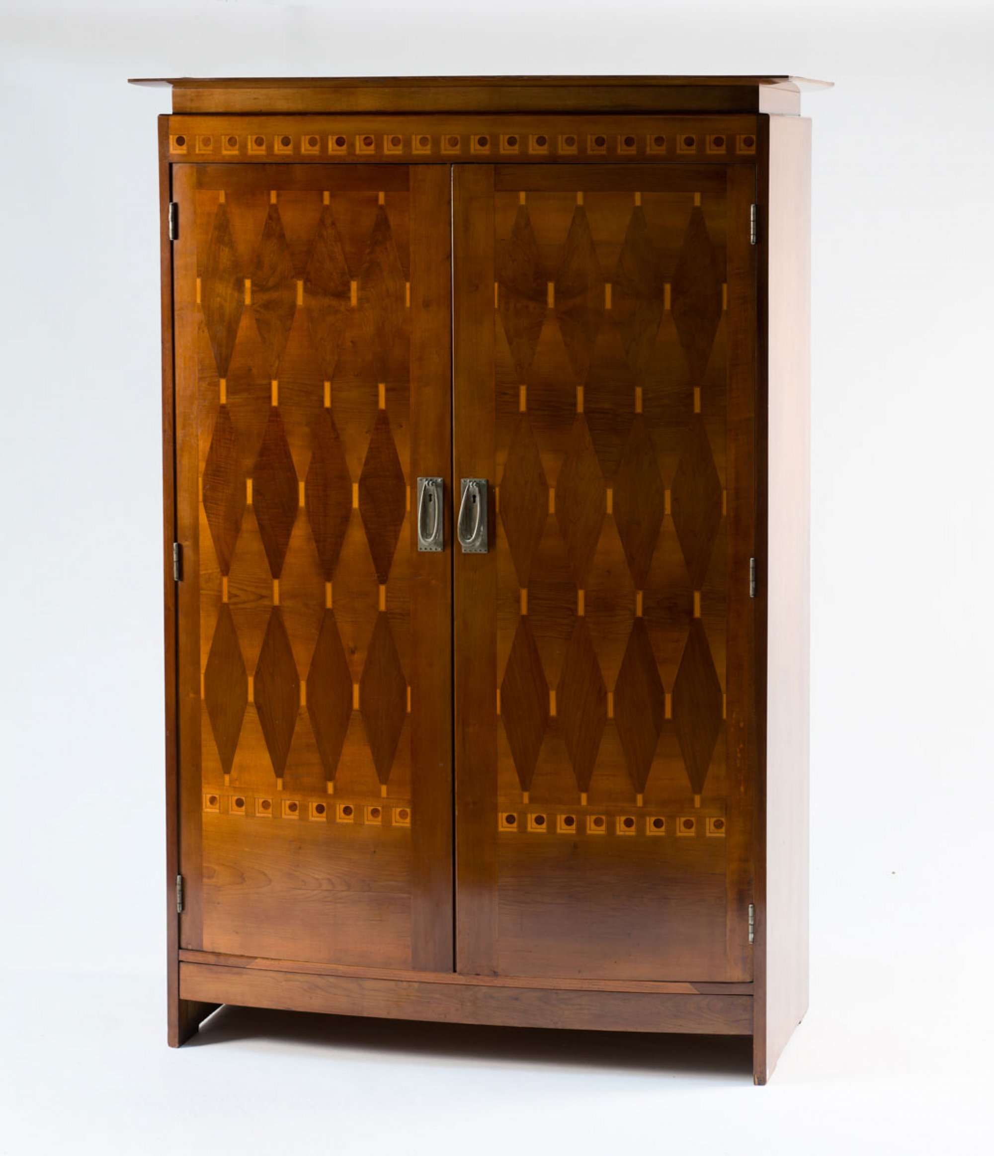 Rechteckiger zweitüriger Korpus mit bombierter Front. Überstehende, profilierte Deckplatte. H. 184,5 cm; 124 x 90 cm. Mahagoni mit unterschiedlichen Edelhölzern intarsiert. Rauten und andere geometrische Motive.