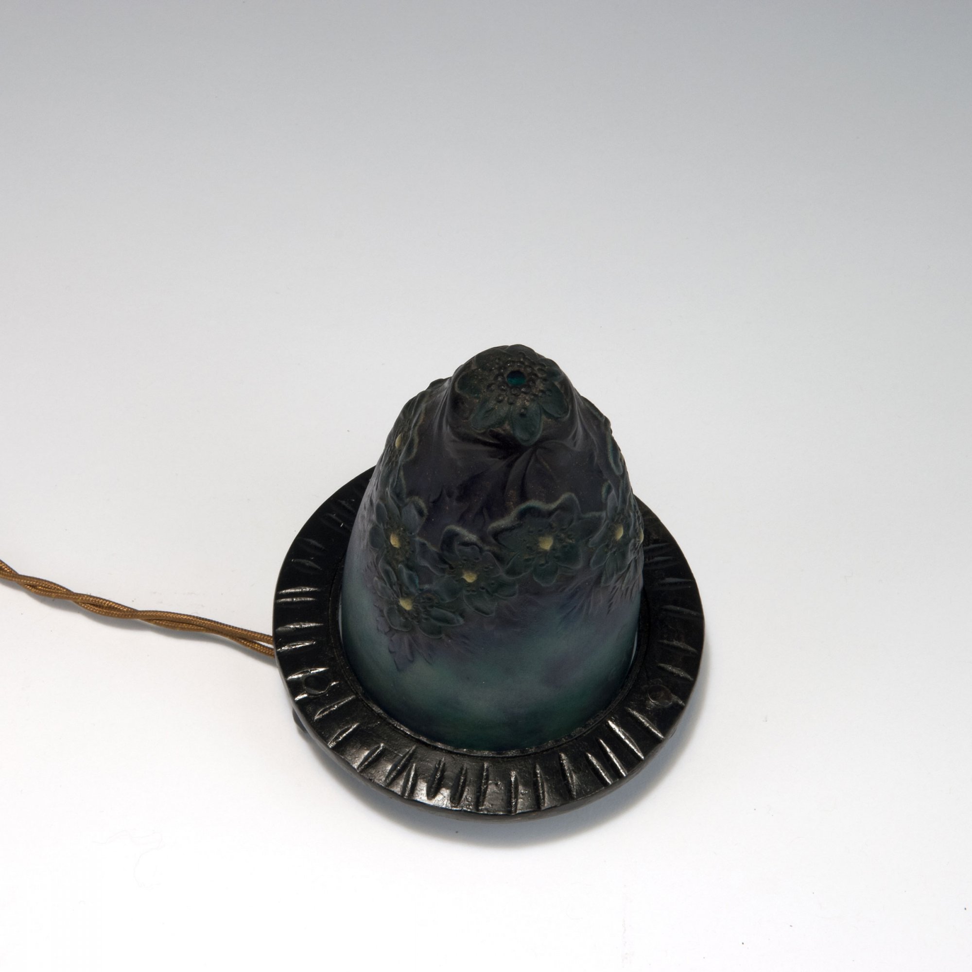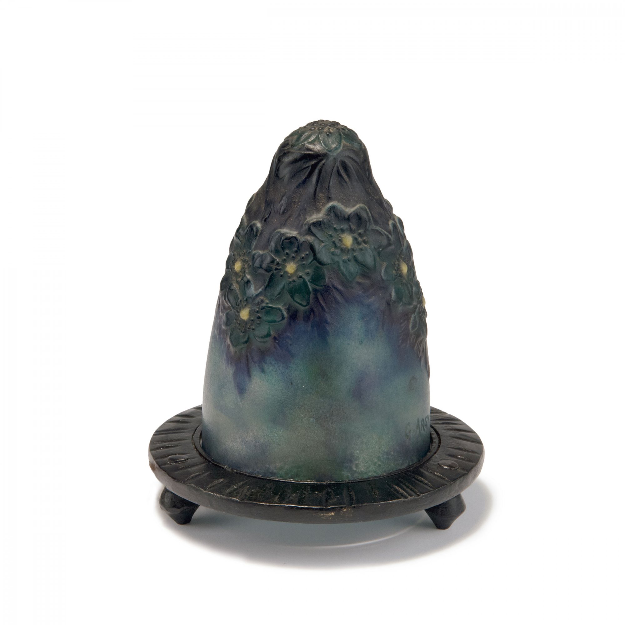 Spitzovoide Form. H. 13,7 cm. Pâte de verre, transluzide Glasmasse, vorwiegend bläulich. Reliefierter Blütendekor, dunkelgrün und gelb. Sign.: G.ARGY-ROUSSEAU und bez.: FRANCE (geprägt). Geschwärzte Montierung aus Schmiedeeisen.