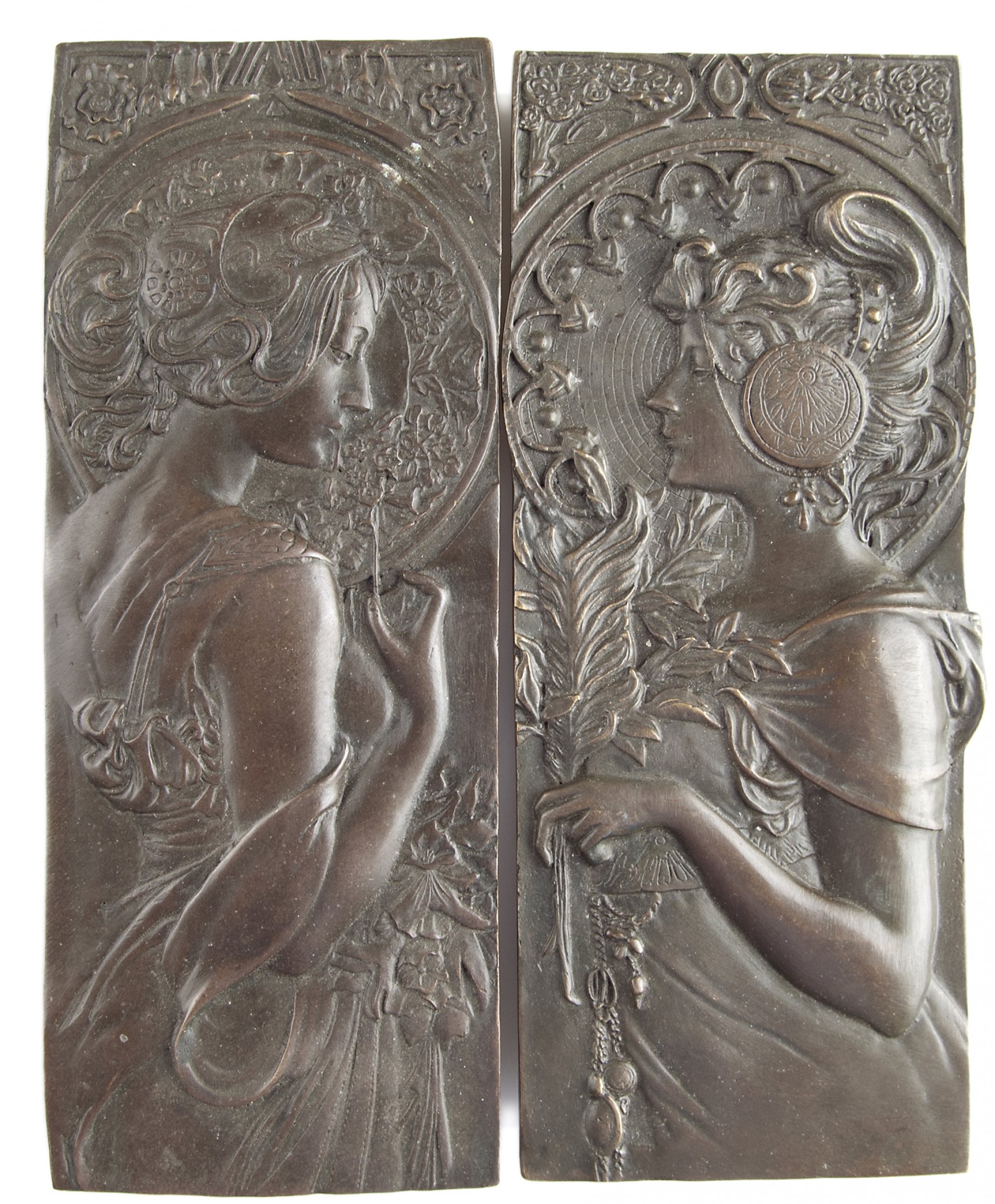 23,8 x 9,3 cm; 23,5 x 10 cm. Bronze, dunkelbraun patiniert. Seitl. bez.: mucha (bossiert).