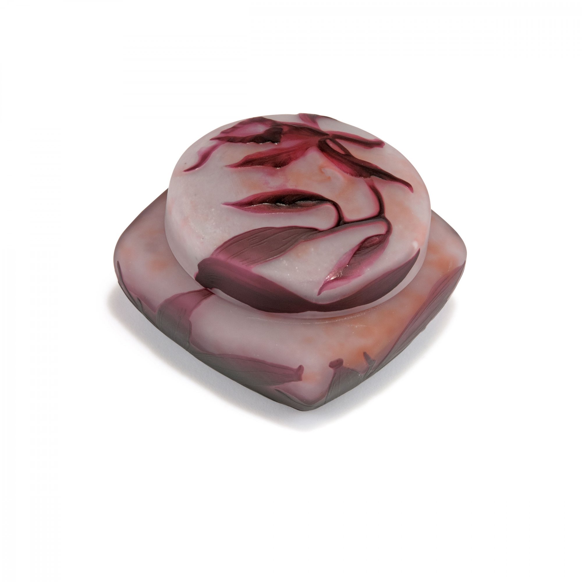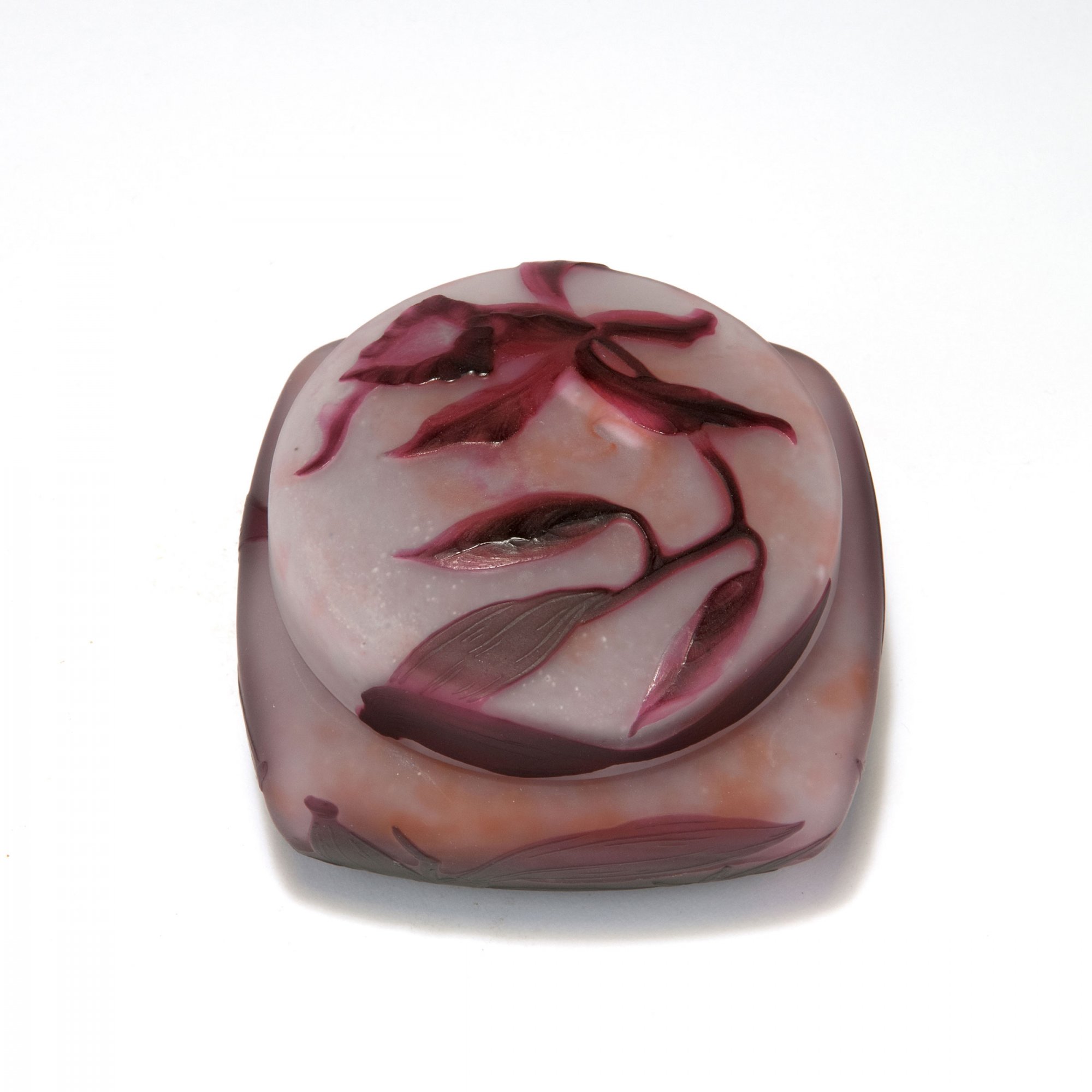 Sphärische Viereckform mit rundem Deckel. H. 6,3 cm. Überfangglas, weinrot und farblos, orangefarbene Pulvereinschlüsse, geätzter und mit dem Rad überarbeiteter Dekor, Motiv mit Orchideen. An der Standkante sign.: DAUM NANCY, Lothringer Kreuz (gravierter Schriftzug).