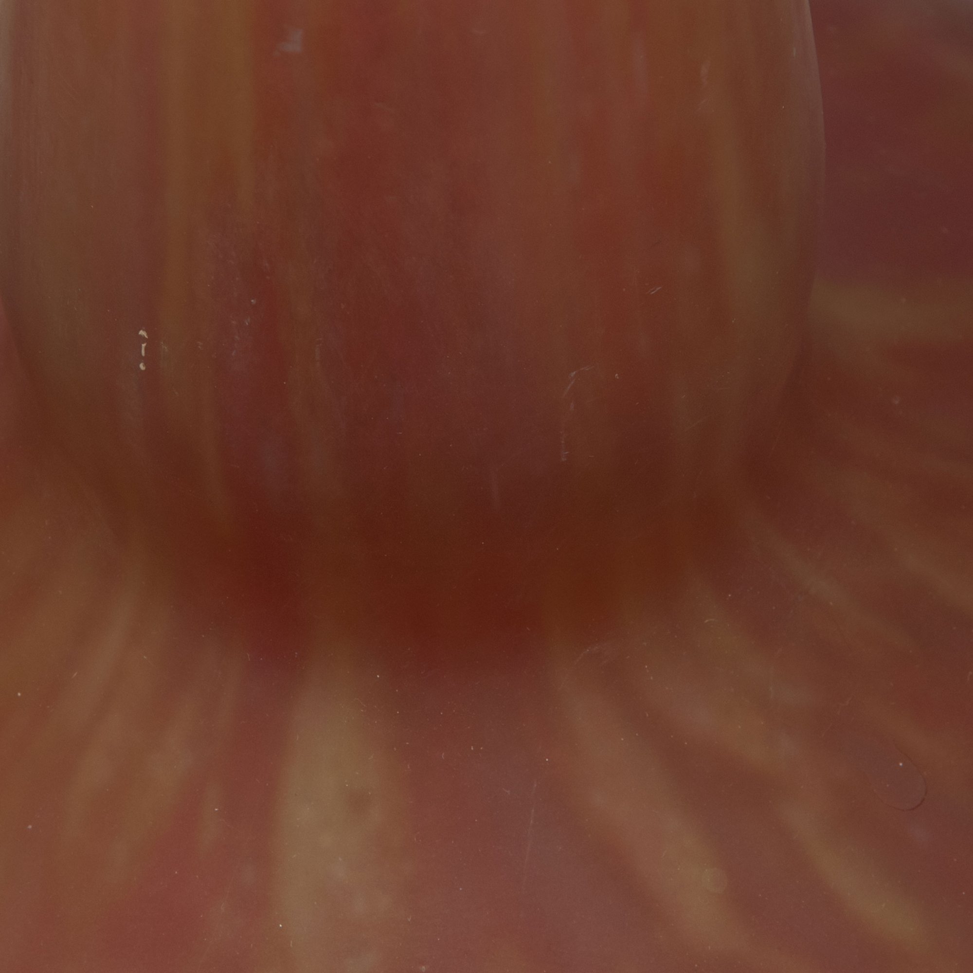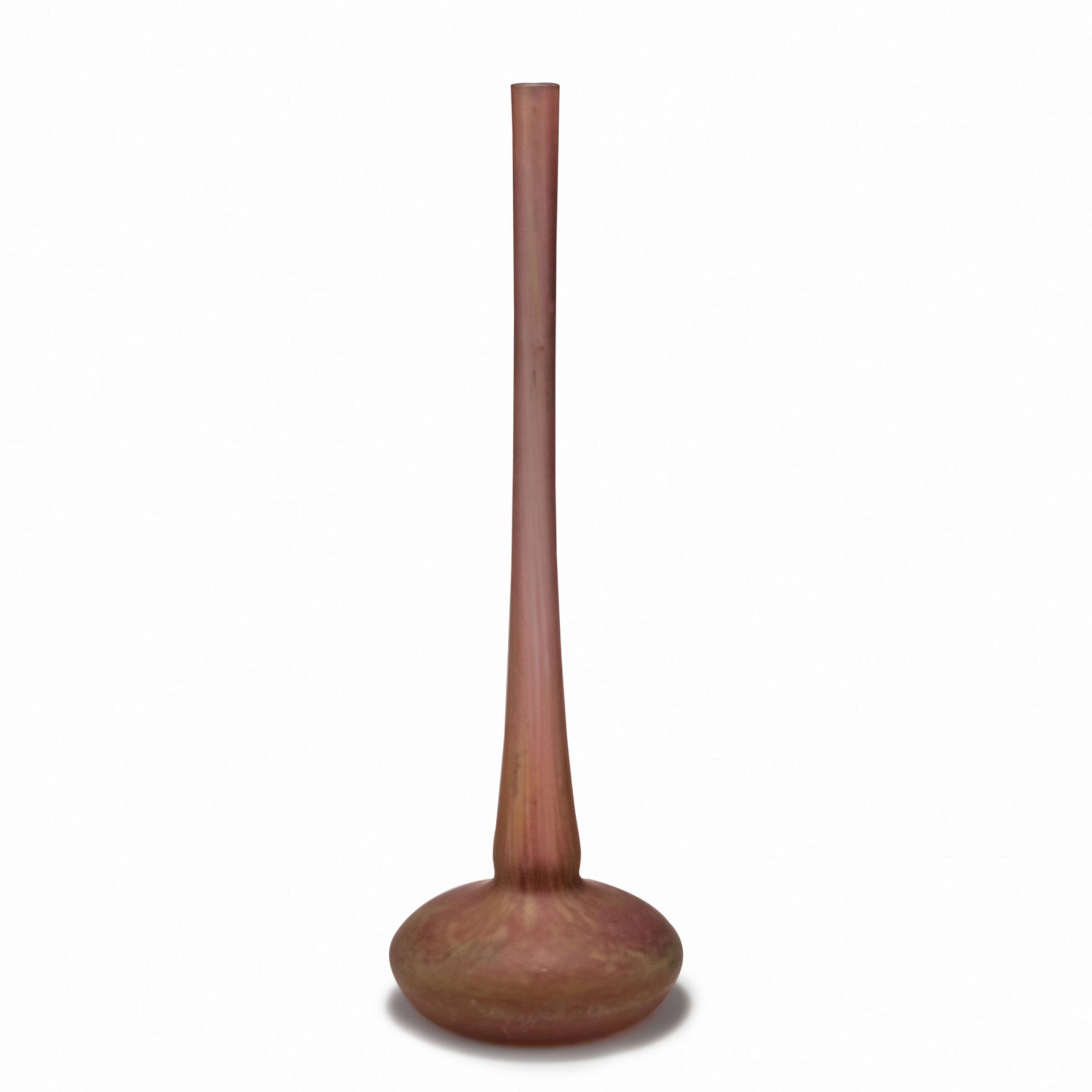 Gedrungener Korpus in Linsenform, schlanker, sich verjüngender Hals. H. 84 cm. Überfangglas, farblos, mit roten und gelben Pulvereinschlüssen, mattiert. An der Wandung sign.: DAUM NANCY FRANCE, Lothringer Kreuz (gravierter Schriftzug).