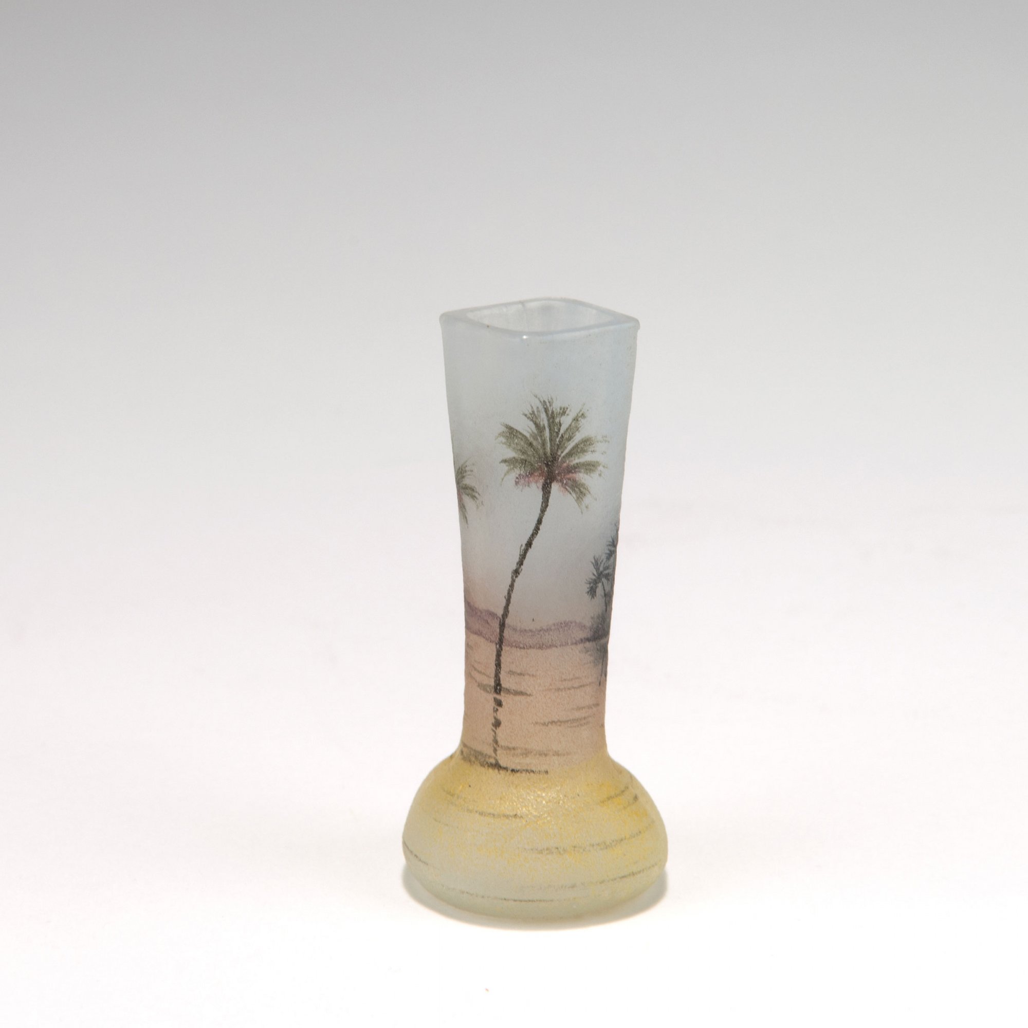 Schlanker Hals mit quadratischer Mündung. H. 5,5 cm. Überfangglas, farblos, milchig opaleszierende Pulvereinschlüsse. Geätzt und polychrom emailliert. Darstellung des mit Palmen besetzten Nilufers und Tempelarchitektur. Am Boden signiert: DAUM NANCY, Lothringer Kreuz, 545 (Schriftzug in Schwarzlot).