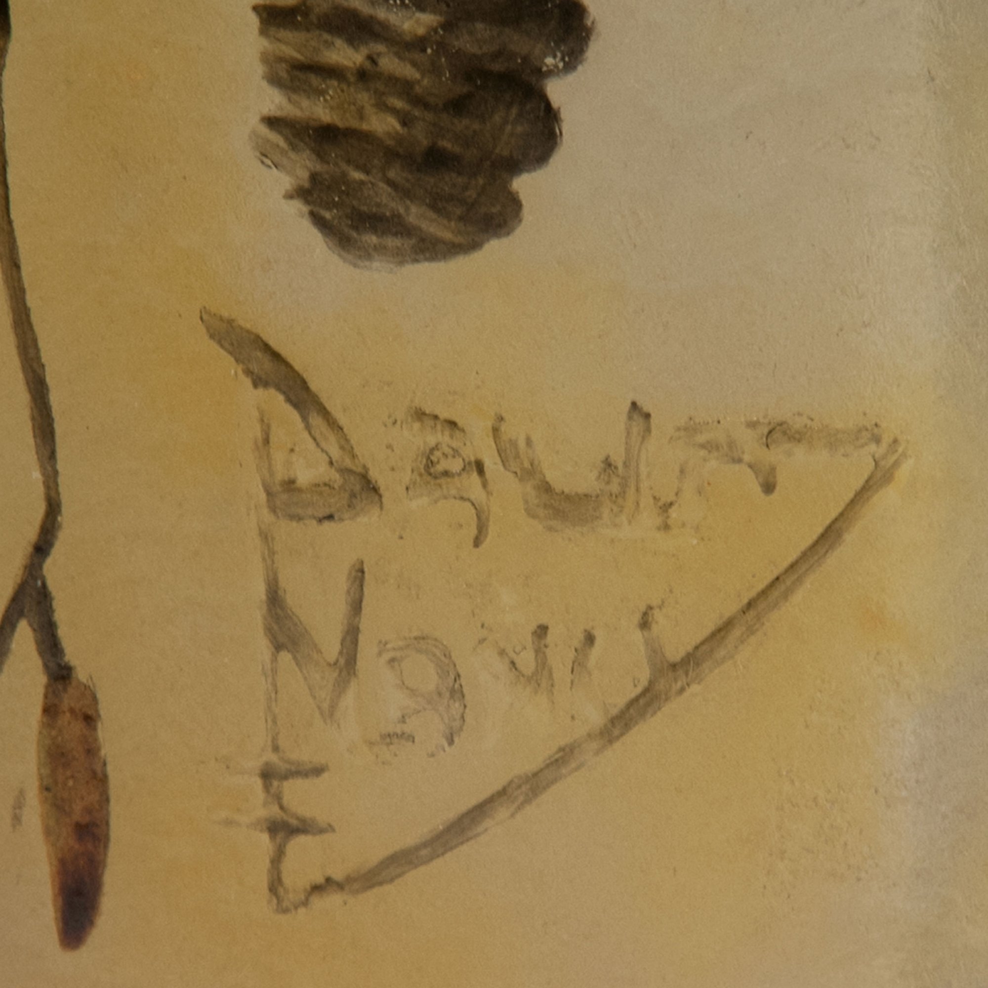 Rechteckiger Korpus. H. 11,8 cm. Überfangglas, farblos, gelbliche und rosafarbene Pulvereinschlüsse. Geätzter und mit Schwarzlot gehöhter Dekor. Motiv einer Auenlandschaft mit hängenden Erlenzweigen. Sign.: DAUM NANCY, Lothringer Kreuz (hochgeätzter Schriftzug, mit Schwarzlot gehöht).