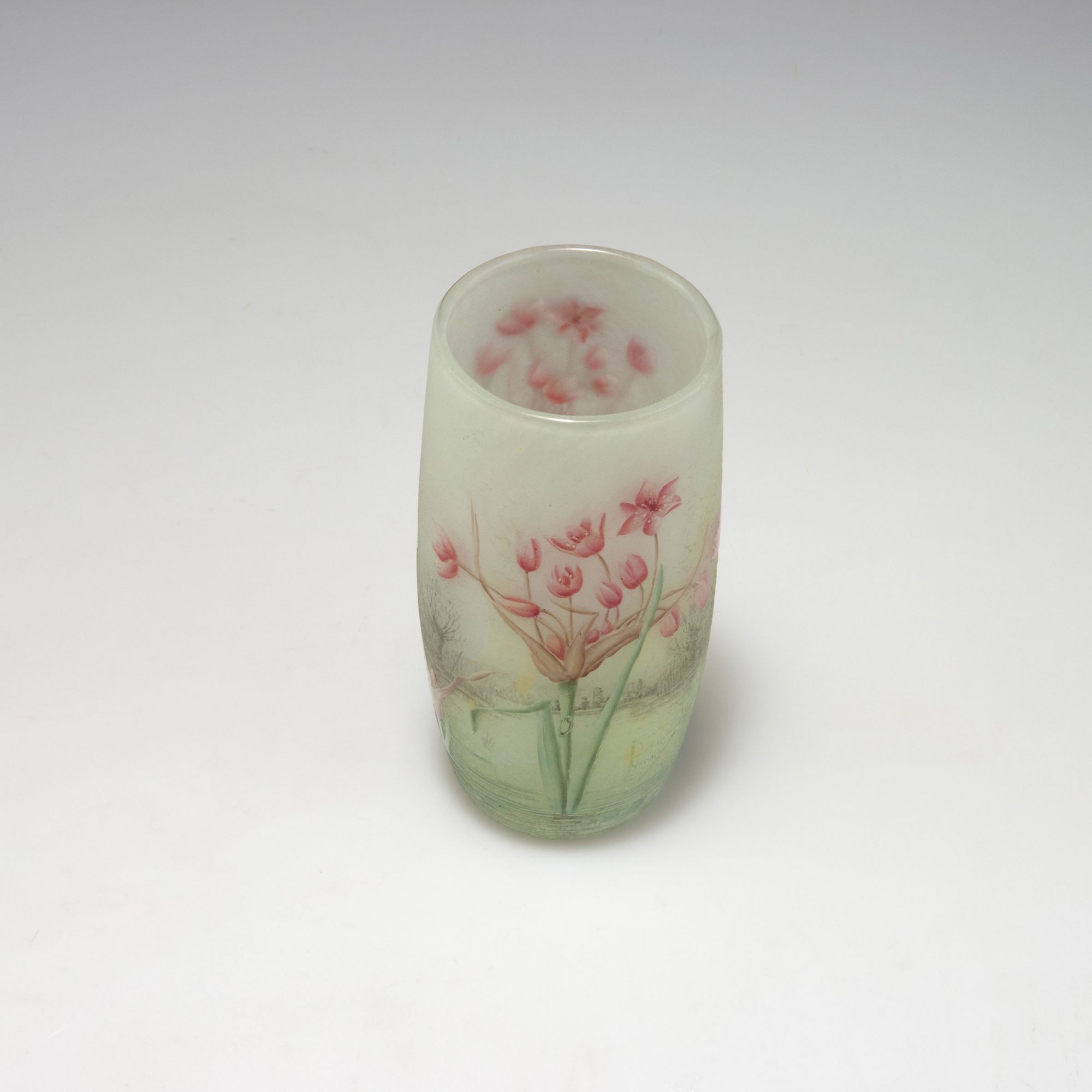 Schlanke Form. H. 12,8 cm. Überfangglas, farblos, milchigweiße und leicht grüne Pulvereinschlüsse, geätzter und polychrom emaillierter Dekor. Motiv einer Teichlandschaft mit blühenden Lilien, im Hintergrund eine Kulisse mit Weiden.