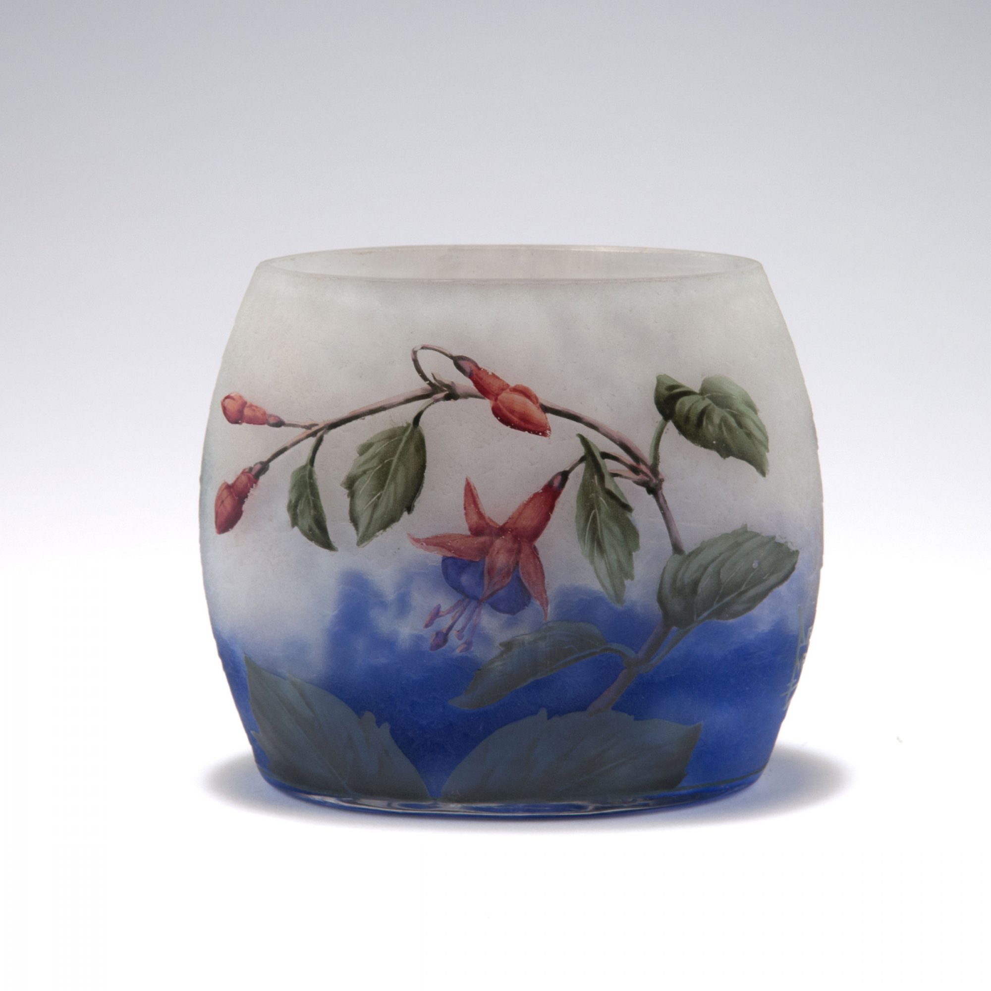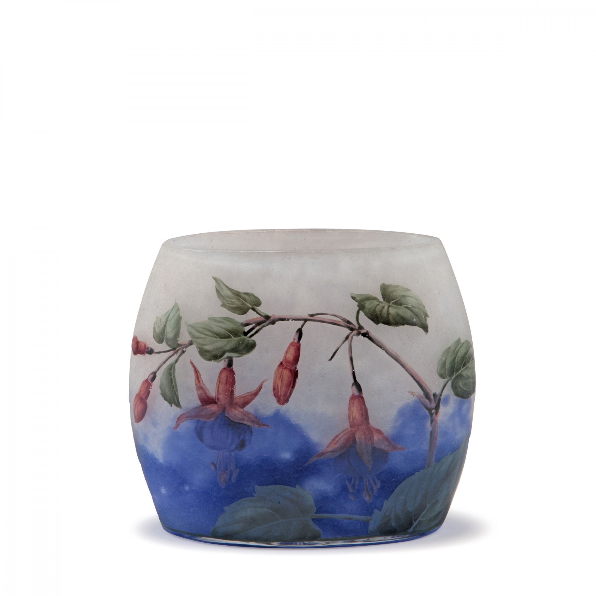 Leicht gewölbt über länglich ovalem Stand. H. 10,1 cm. Überfangglas, farblos, milchigweiße und tiefviolette Pulvereinschlüsse, eisglasartig geätzter Grund. Geätzter und fein polychrom bemalter Dekor, umlaufendes Motiv mit blühenden Fuchsien. An der Wandung sign.: Daum Nancy, Lothringer Kreuz (hochgeätzter Schriftzug).