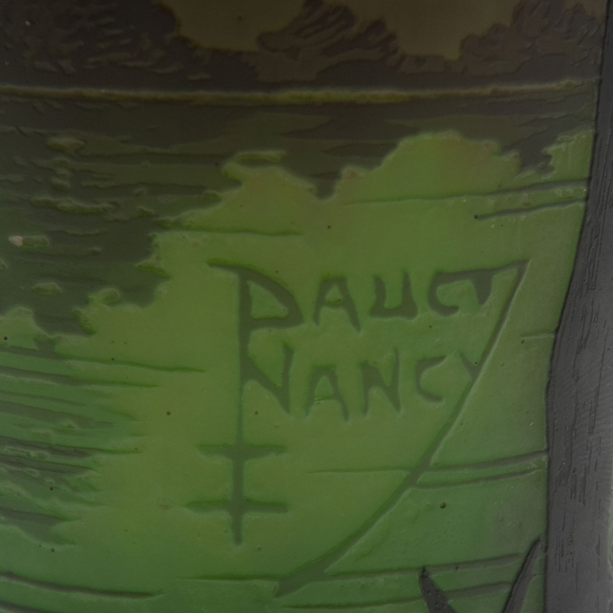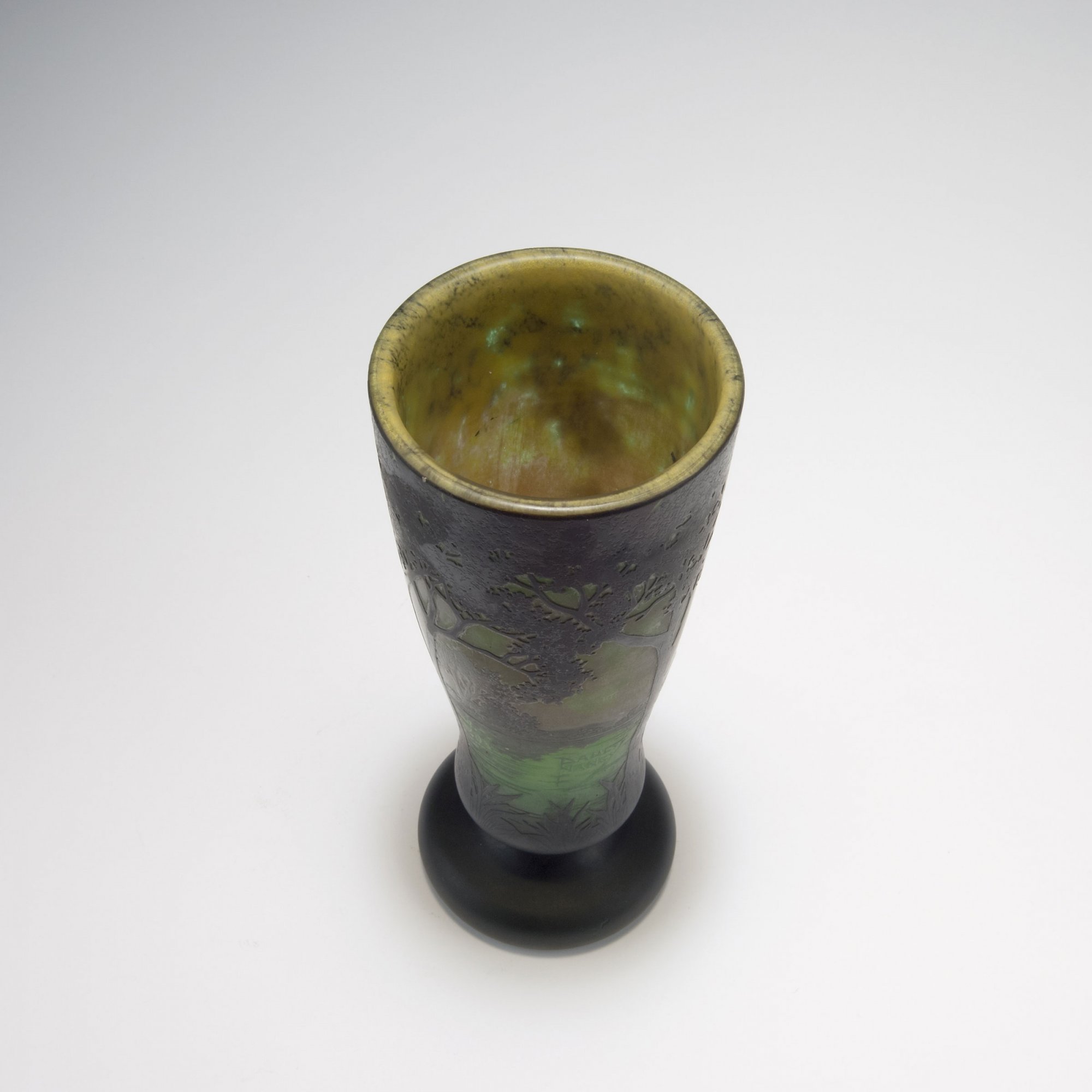 H. 23,6 cm. Überfangglas, farblos, grün und tiefviolett, gelbe und gelborange Pulvereinschlüsse. In mehreren Arbeitsgängen geätzter Dekor, Motiv einer abendlichen Seenlandschaft mit Baumkulisse. An der Wandung sign.: DAUM NANCY, Lothringer Kreuz (hochgeätzter Schiftzug).