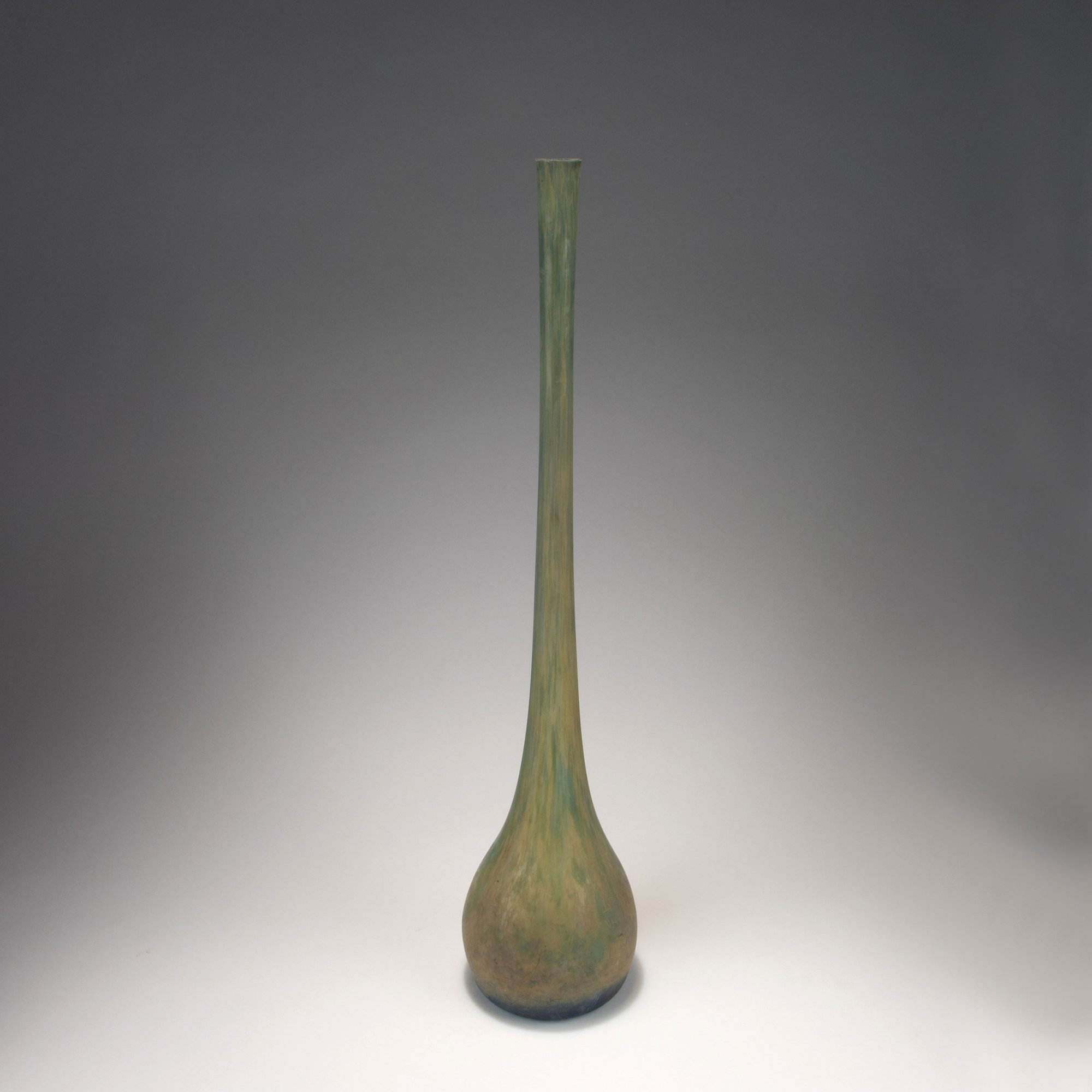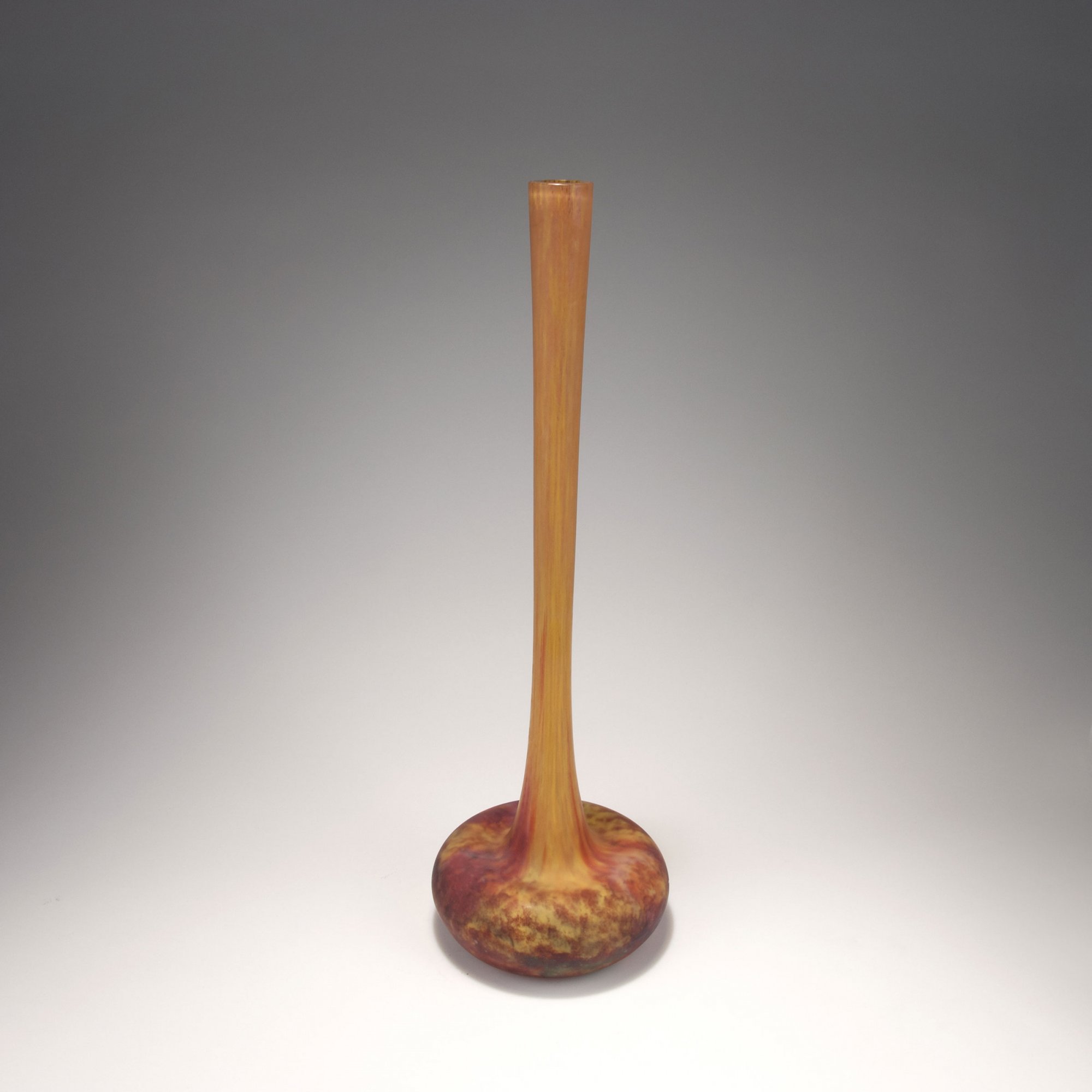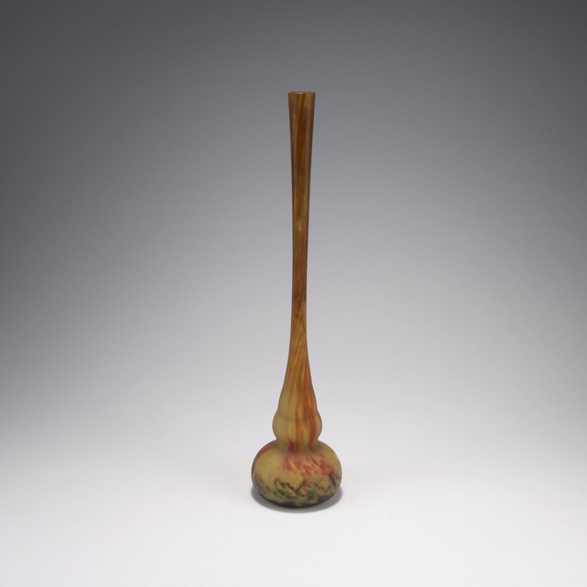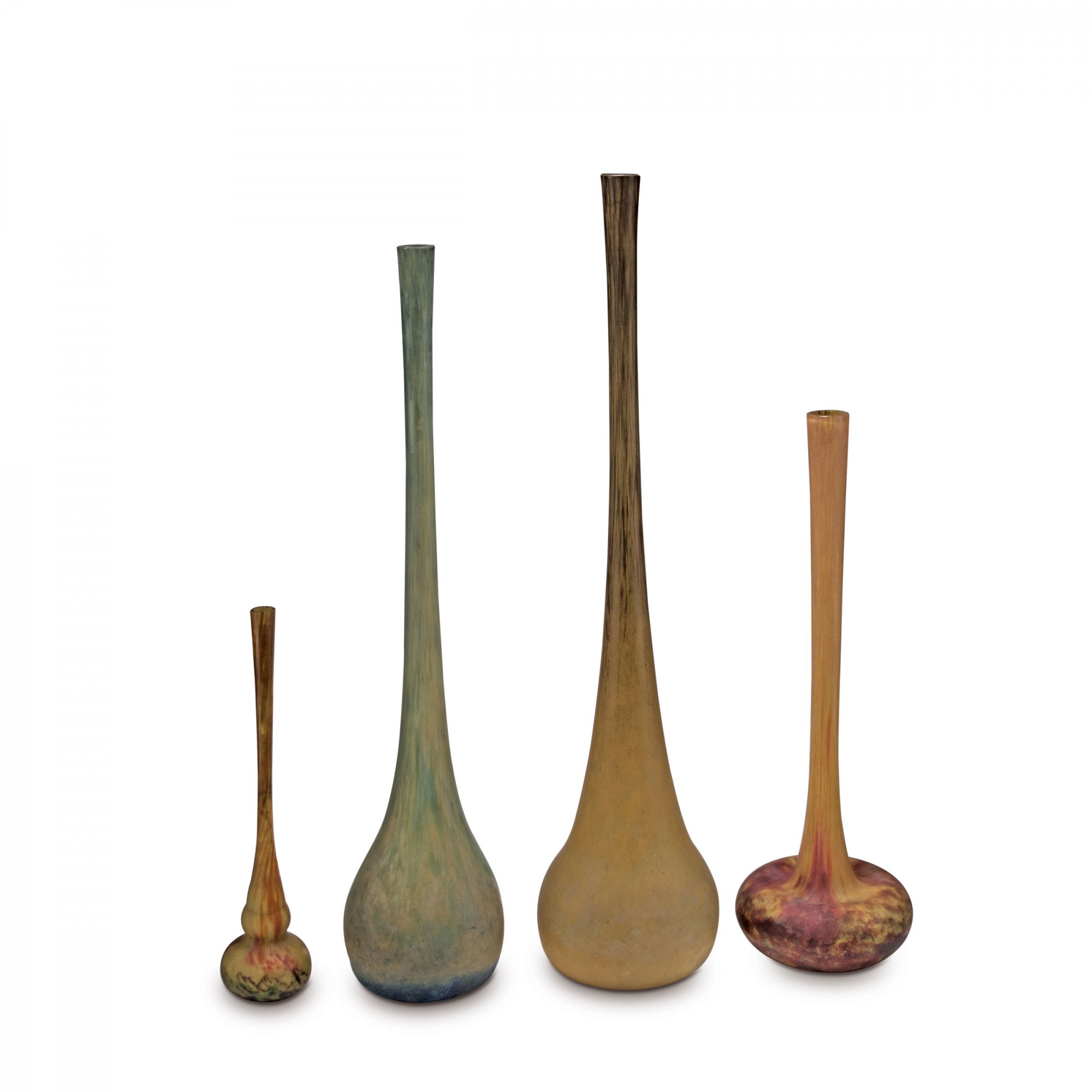 In unterschiedlichen Formen mit langen, schlanken Hälsen. H. 37 cm; 53,5 cm; 69,5 cm und 75,5 cm. Überfangglas, farblos, mit verschiedenfarbigen Pulvereinschlüssen, teils mit Aufschmelzungen (vitrifications), mattiert. An der Wandung sign.: DAUM NANCY, Lothringer Kreuz (gravierter bzw. säurepolierter Schriftzug).