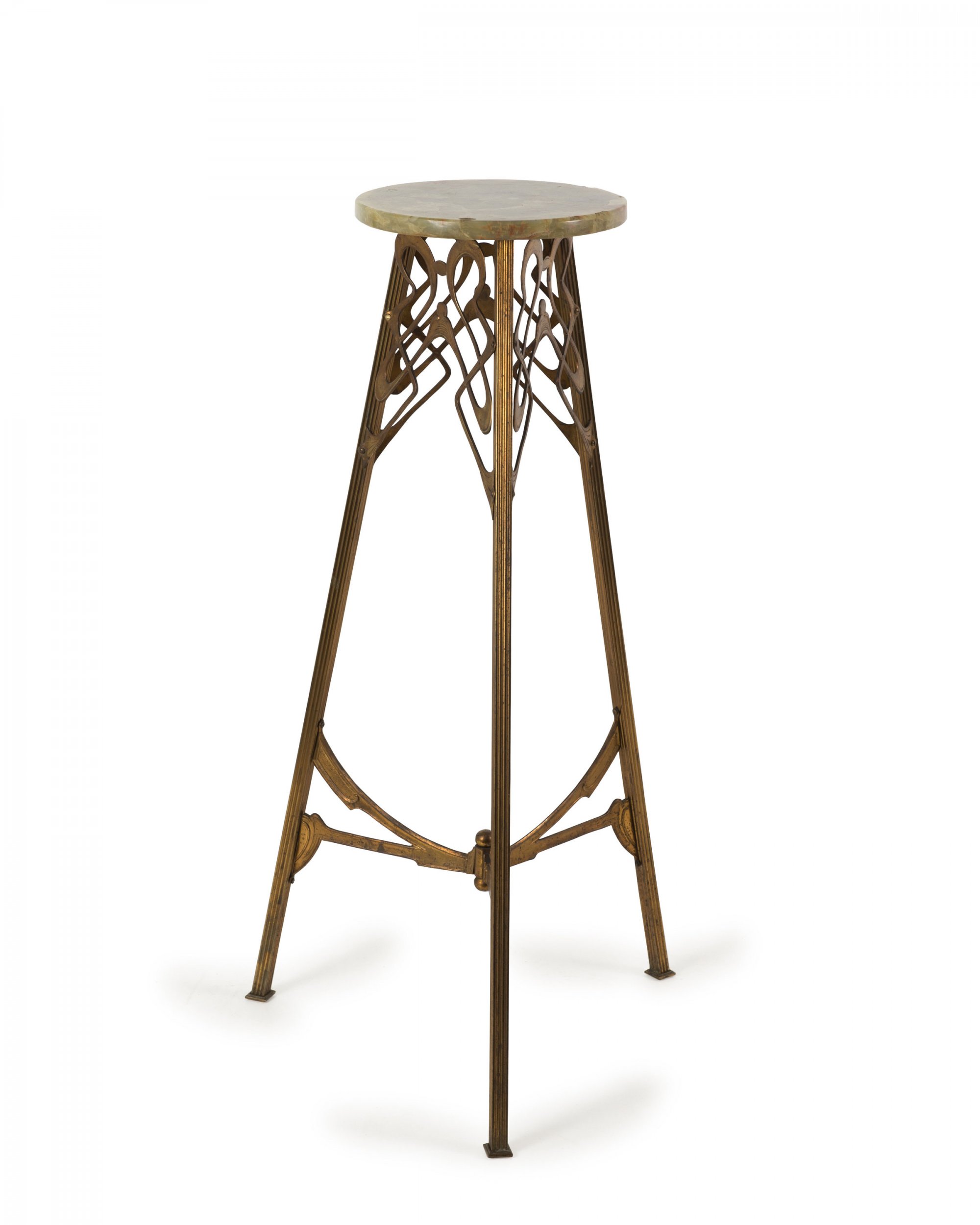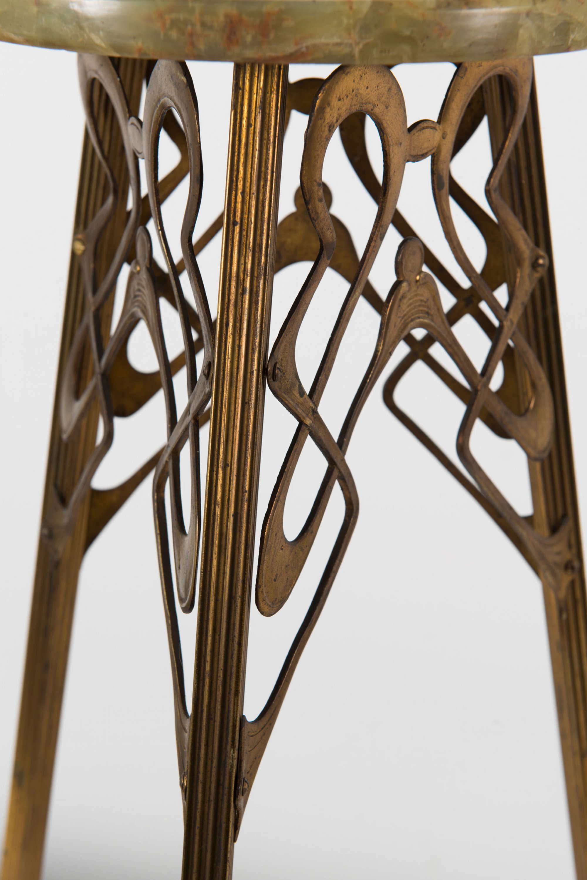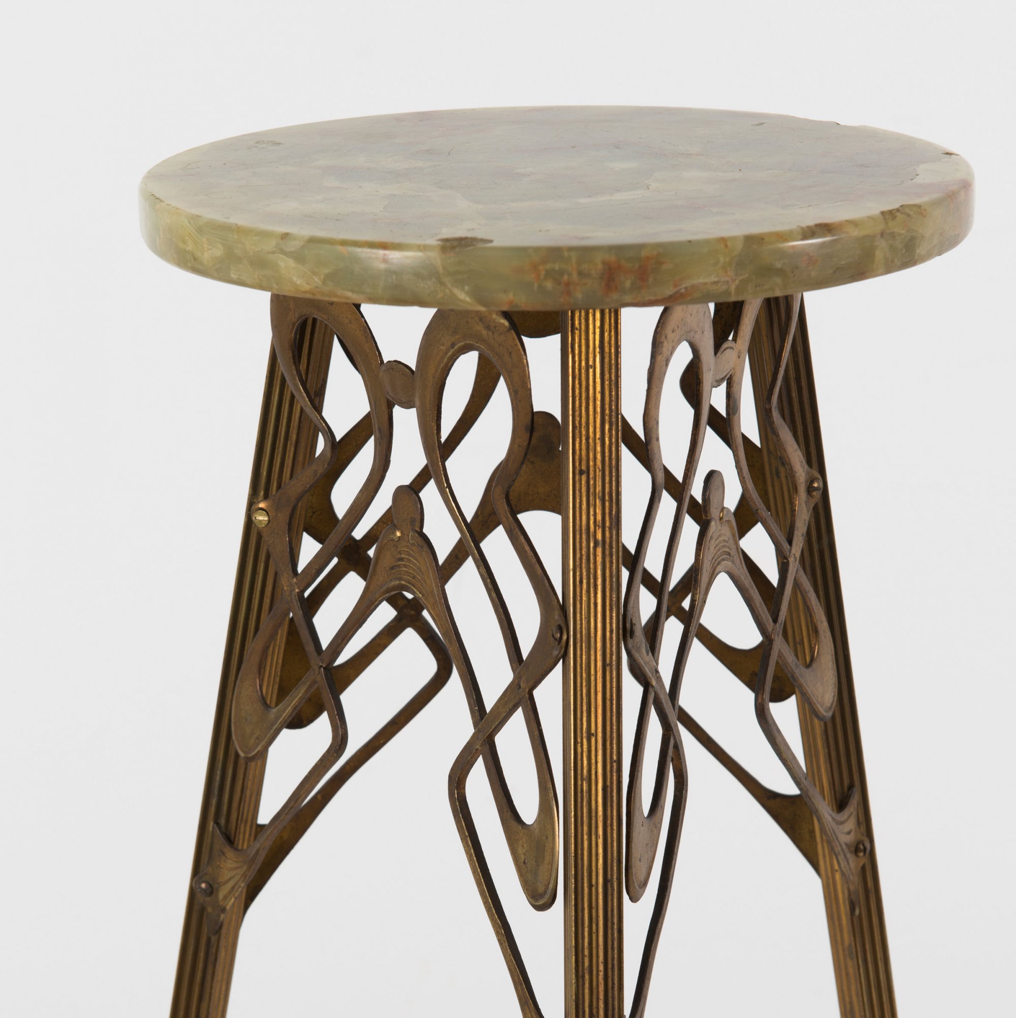 Dreibeinig, mit kreisrunder Platte. H. 79 cm. Messing mit floralen Ornamenten. Platte aus Onyx.