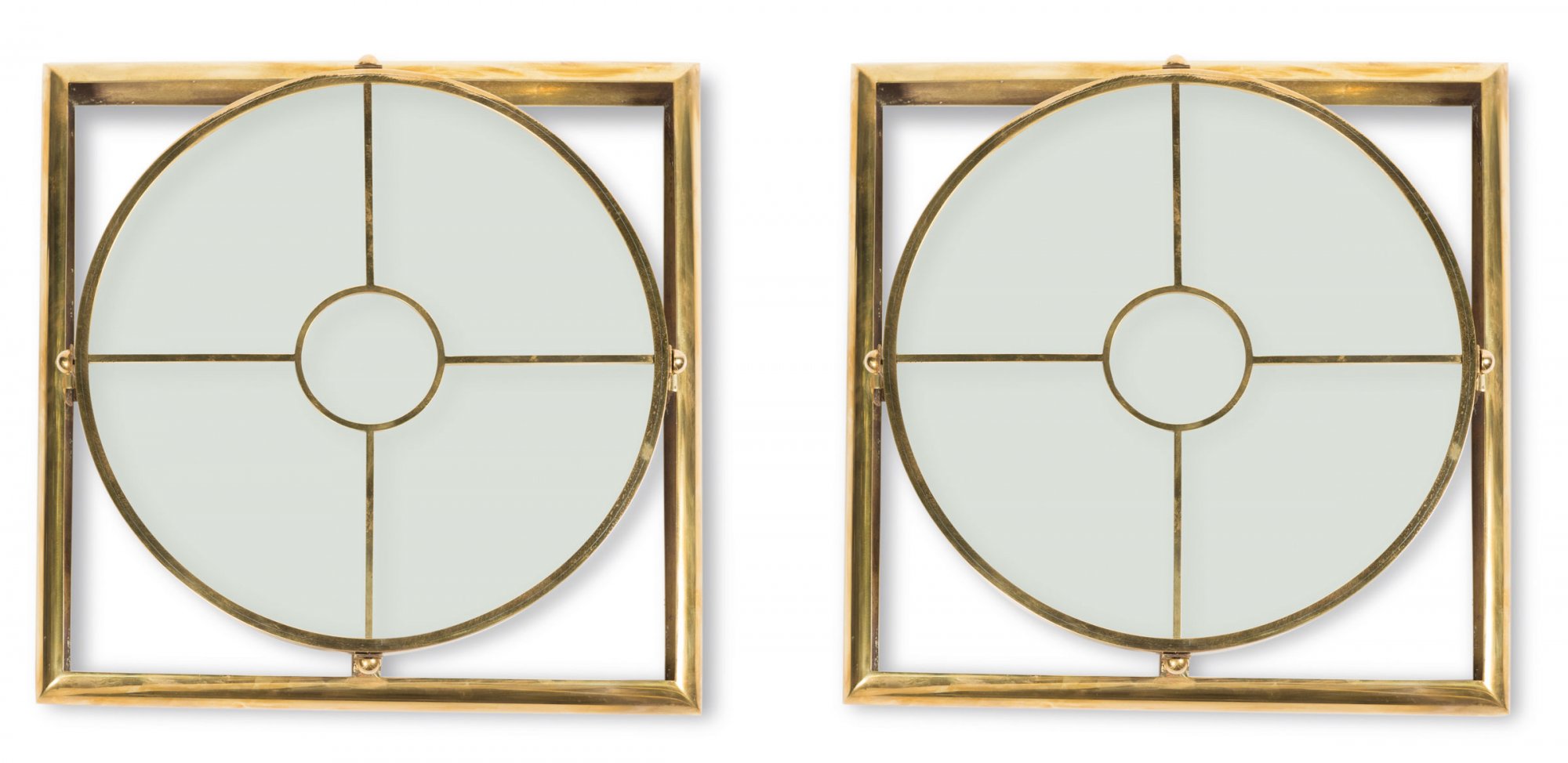 Quadratisch mit eingeschriebenen Kreisen und Vestrebung in der Art eines Fadenkreuzes. 48 x 48 cm. Messing, mattiertes Glas.