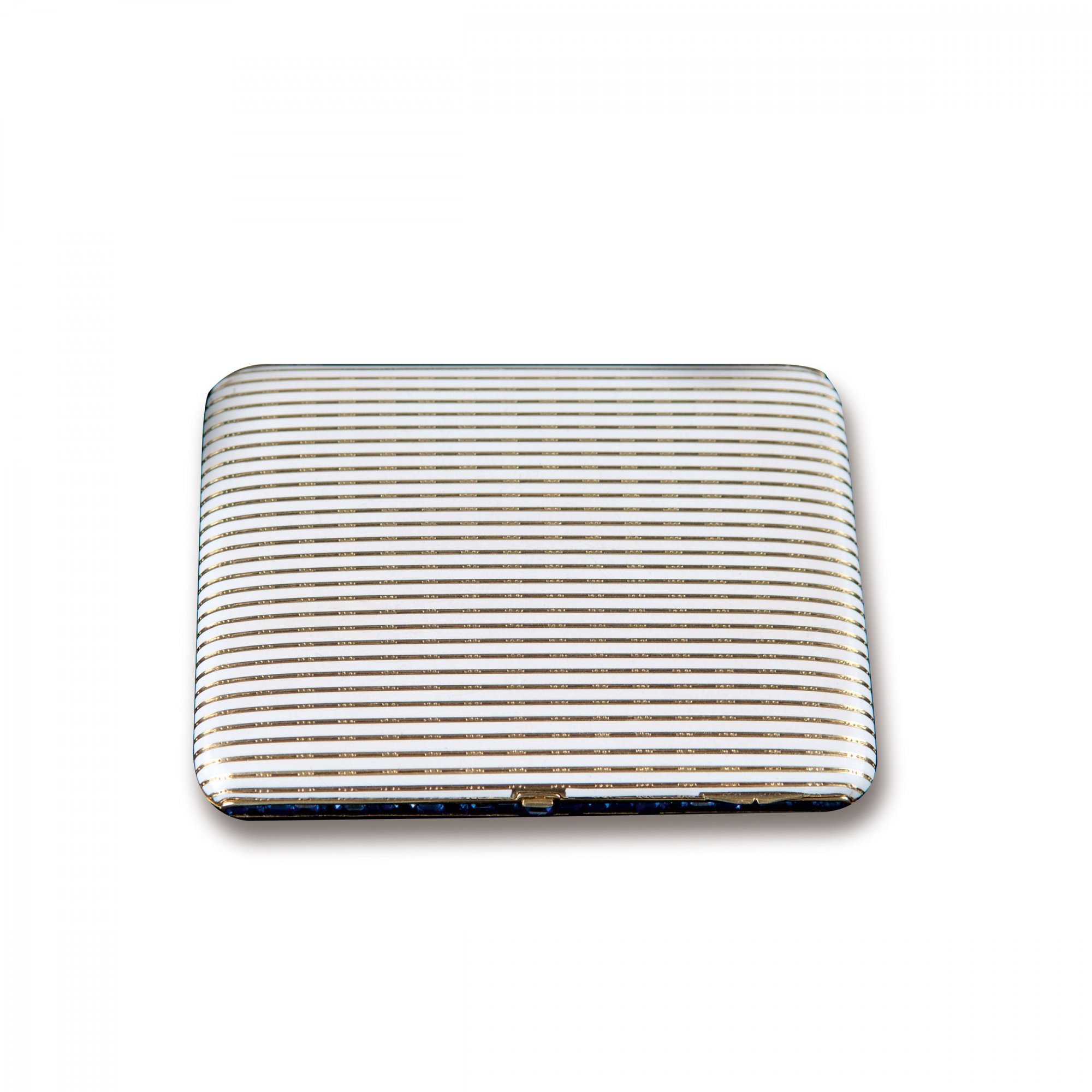 Rechteckige Form, abgerundete Kanten und abgeschrägte Ecken, scharniert. 6,8 x 8,5 cm. Gold, weißes Email, Streifendekor. Schließe mit 24 facettierten Saphiren verziert. Gest.: Werkstattpunze GS, Jahresbuchstabe für 1921, 18, 75, Londoner Importpunze, 55397, 750, geritzte Bez.