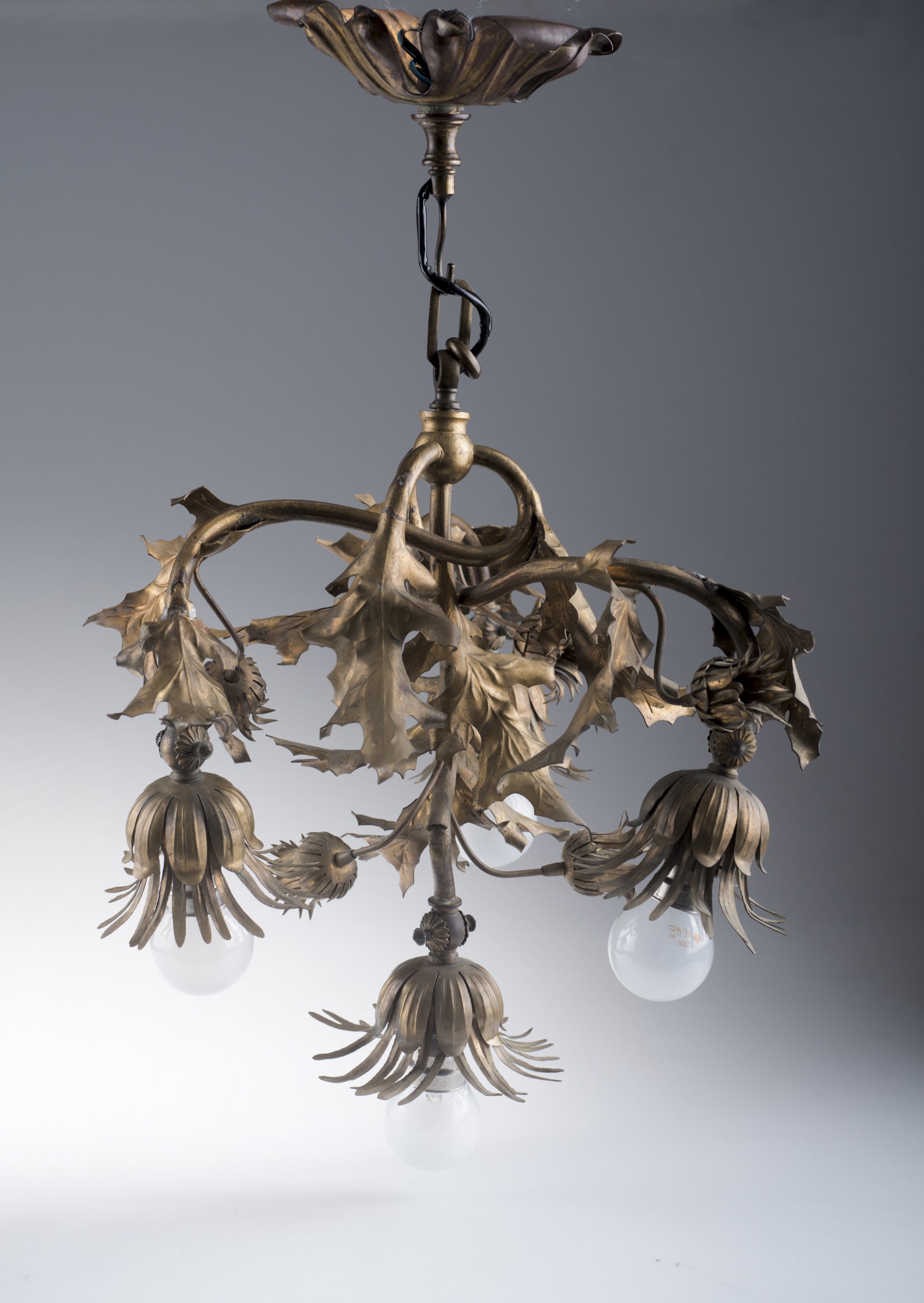 In Form einer hängenden Distelpflanze mit gewundenen Zweigen, vier großen und vier kleineren Blüten, die großen Blüten mit Fassungen für Glühbirnen eingerichtet, blattartige Deckenblende. H. 51 cm. Getriebenes Messingblech.