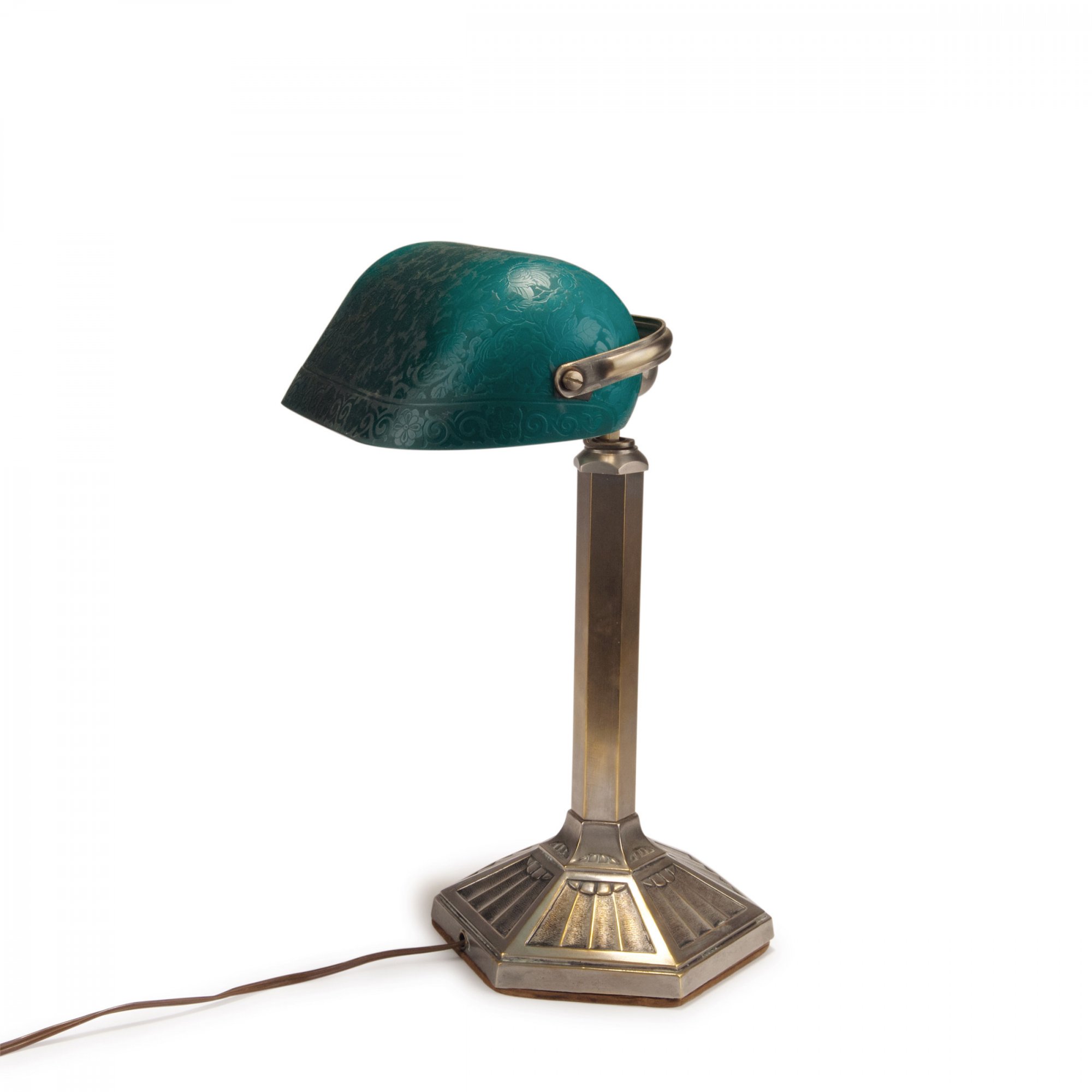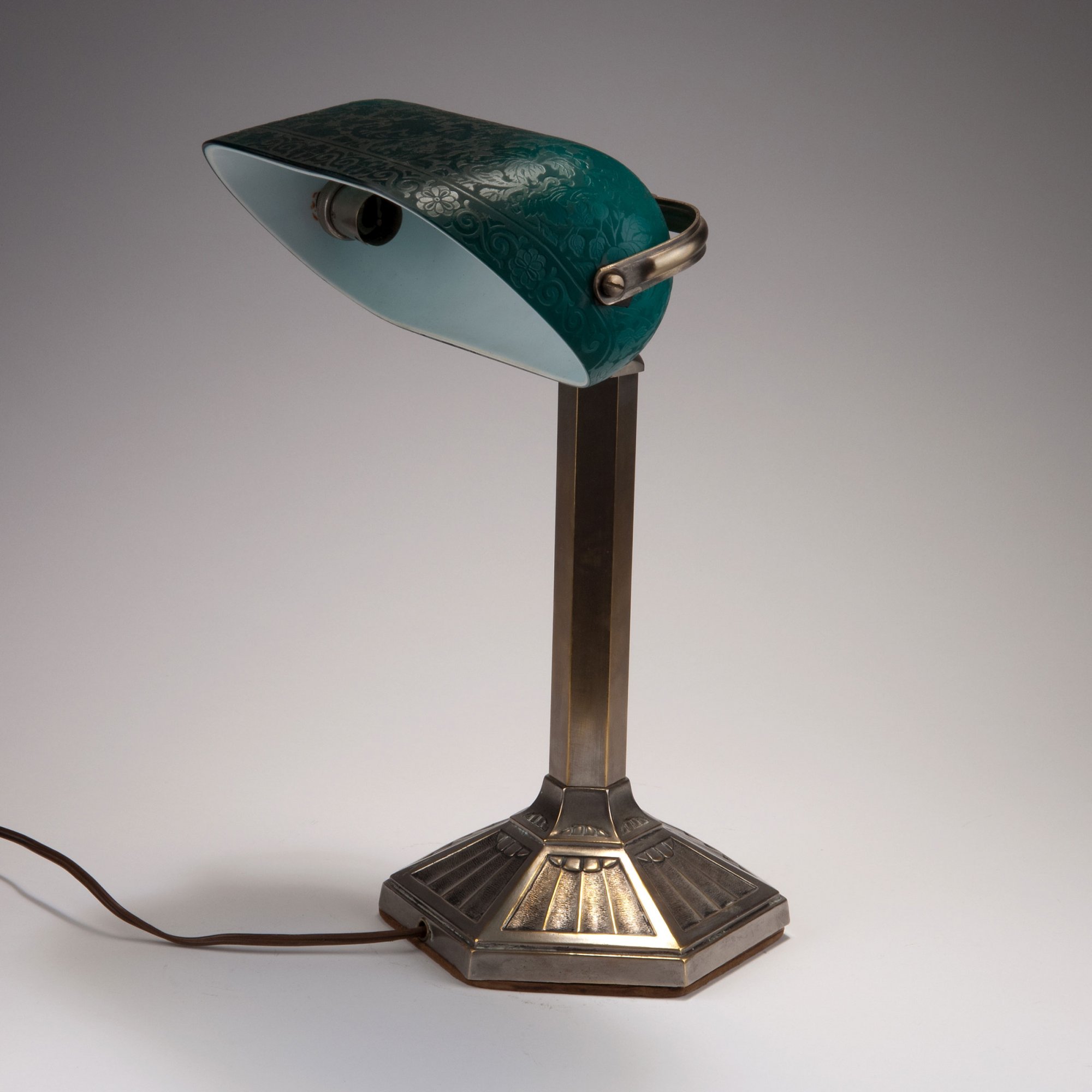 Dreh-, neig- und höhenverstellbarer Schirm mit sechskantigem Fuß und Schaft. H. 36-51 cm. Schirm aus überfangenem Pressglas, farblos, weiß und grün mit dichtem, geätzten Floraldekor. Versilberter Messingfuß.