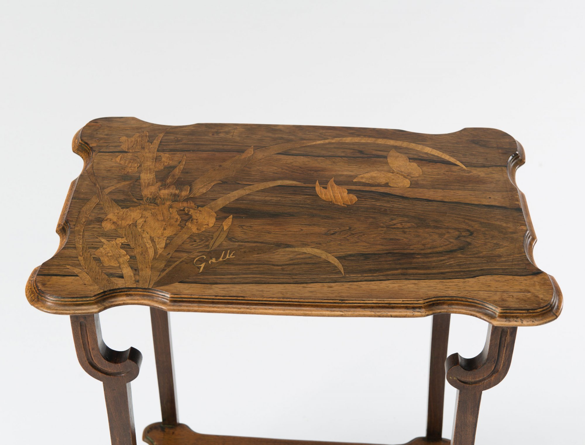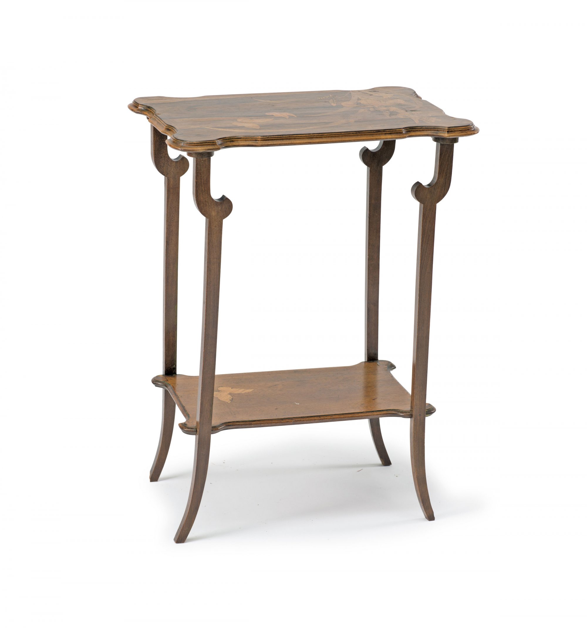Zweistufig, mit passig gewellltem Umriß, auf geschweiften Beinen, die obere Platte profilgerahmt. H. 74 cm, 55,5 x 37 cm. Nußbaum, mit unterschiedlichen Edelhölzern furniert. Intarsiendekor, Motive mit Landschaftsausschnitt mit Schwertlilien und fliegenden Schmetterlingen. Sign.: Gallé (intarsierter Schriftzug).