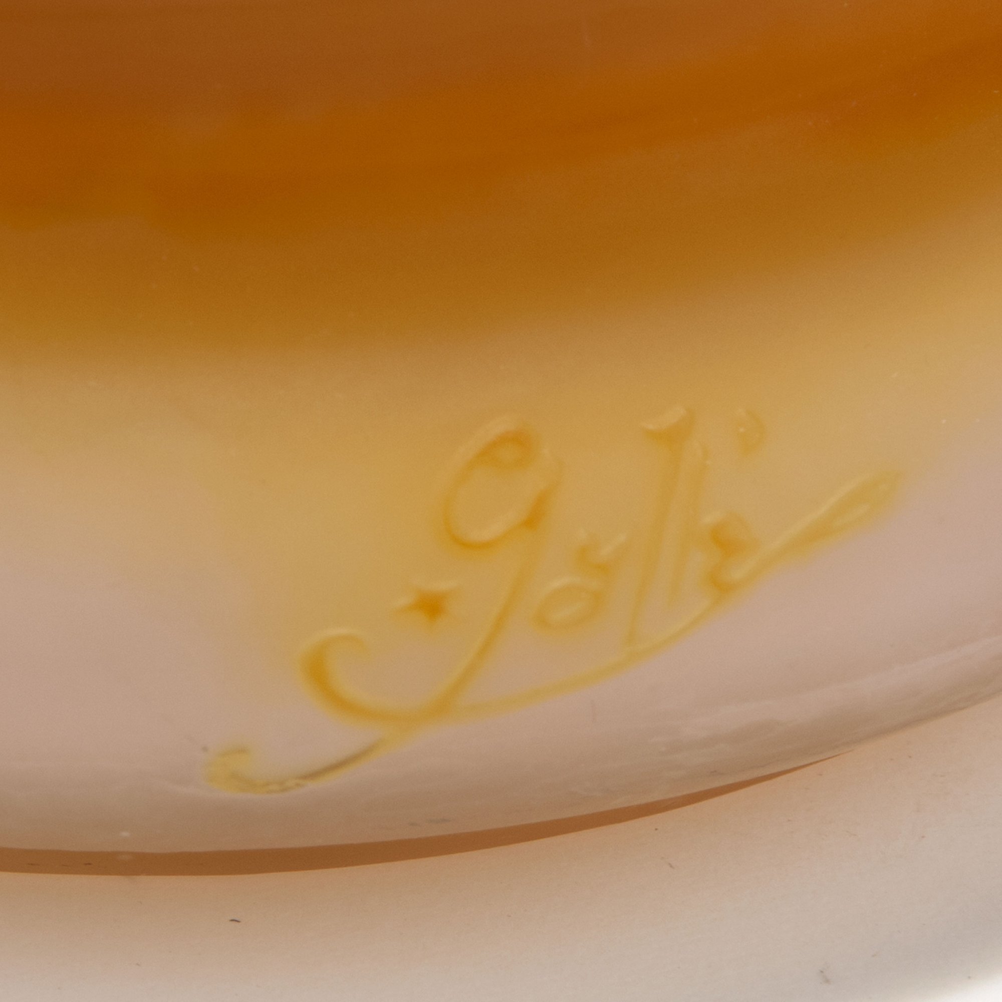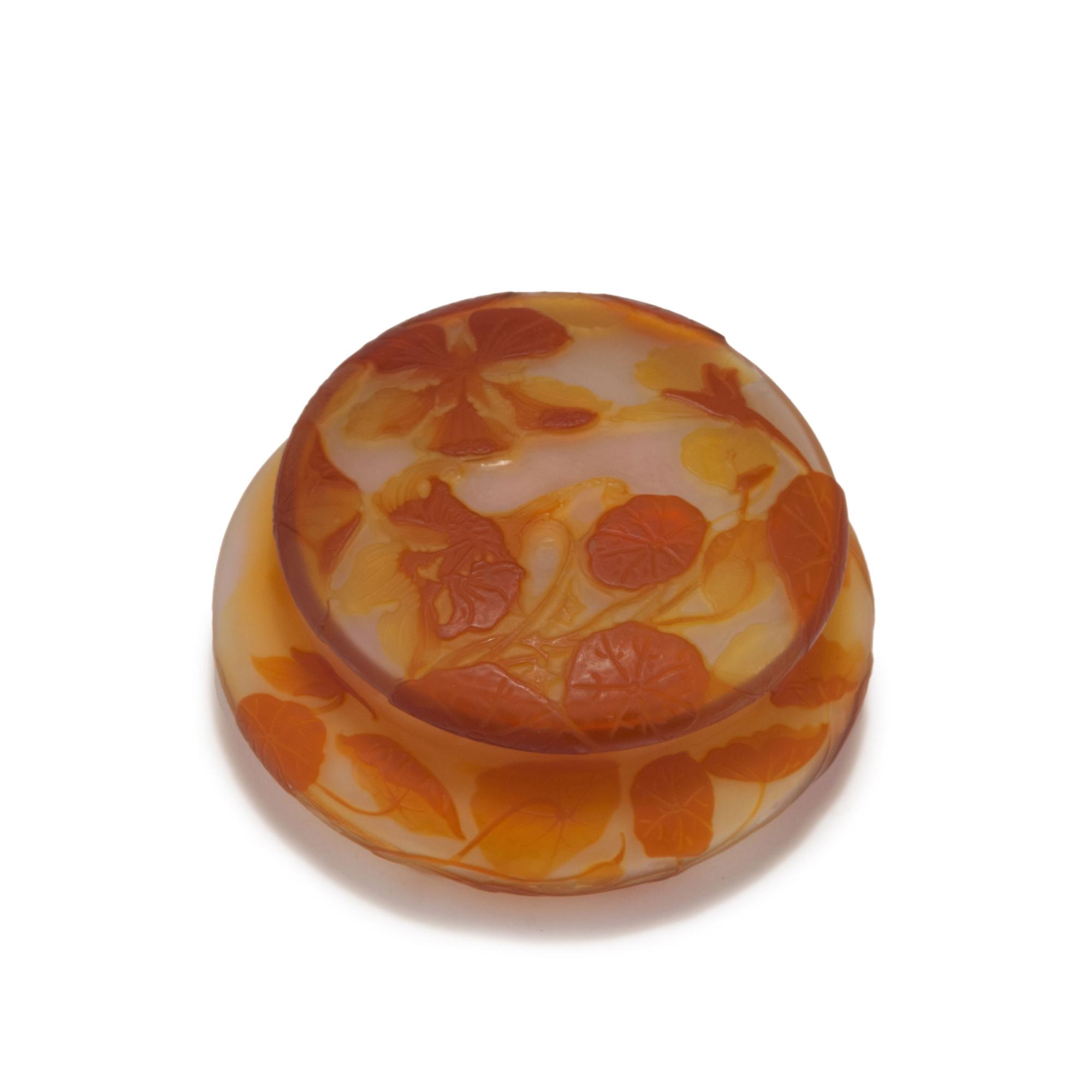 Rund, mit leicht gewölbtem Deckel. H. 6,9 cm, Dm. 14,5 cm. Überfangglas, farblos, bernsteinfarben und orangebraun. In mehreren Arbeitsgängen geätzter Dekor. Motiv mit Ranken der Kapuzinerkresse. Sign.: Gallé mit Stern (hochgeätzter Schriftzug).