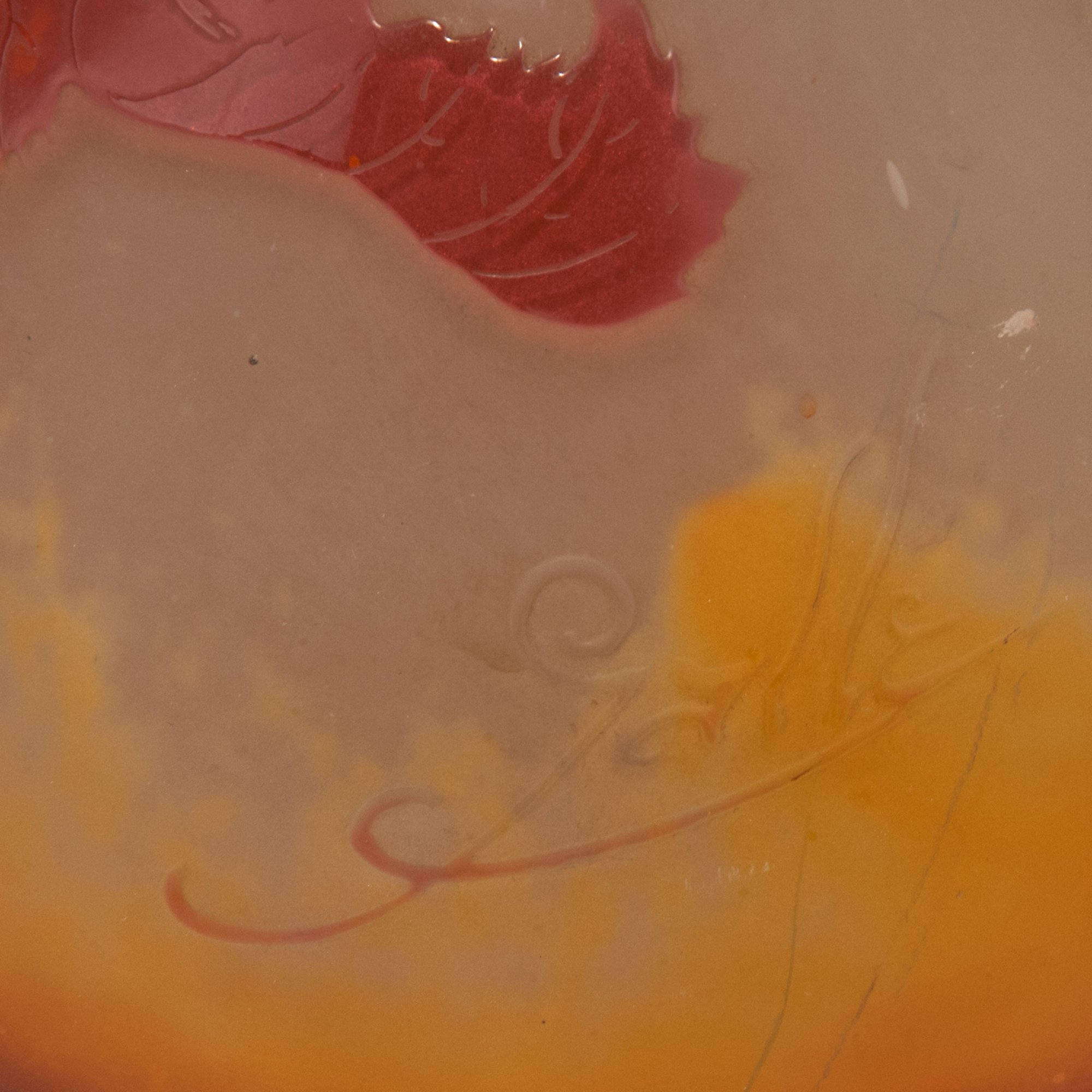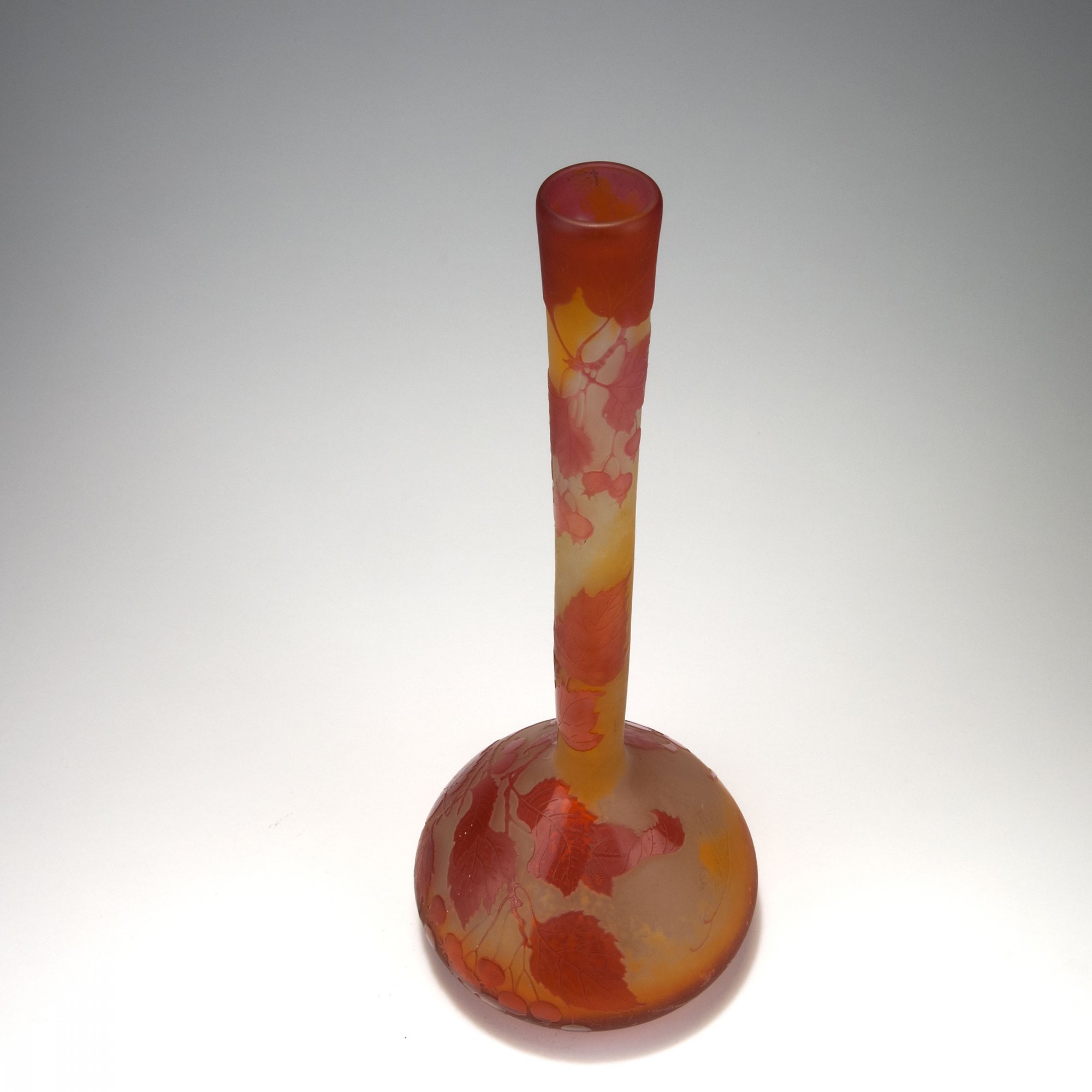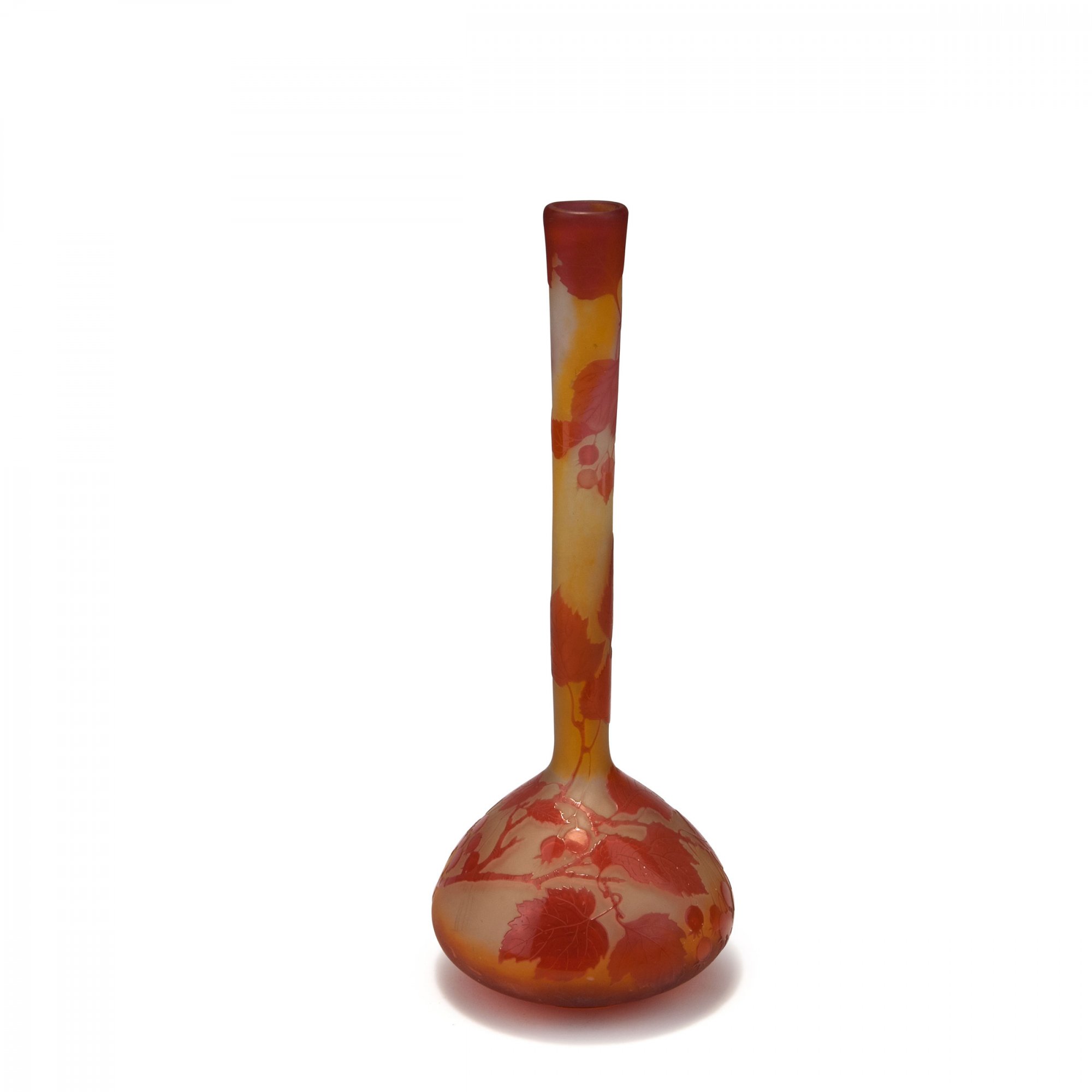 Sich stark vorwölbender Korpus, leicht trichterförmiger Hals. H. 40 cm. Überfangglas, hell bernsteinfarben, farblos und hell weinrot. In mehreren Arbeitsgängen geätzter Dekor, Motiv mit Johannisbeeren in abendlicher Stimmung. Sign.: Gallé (hochgeätzt).