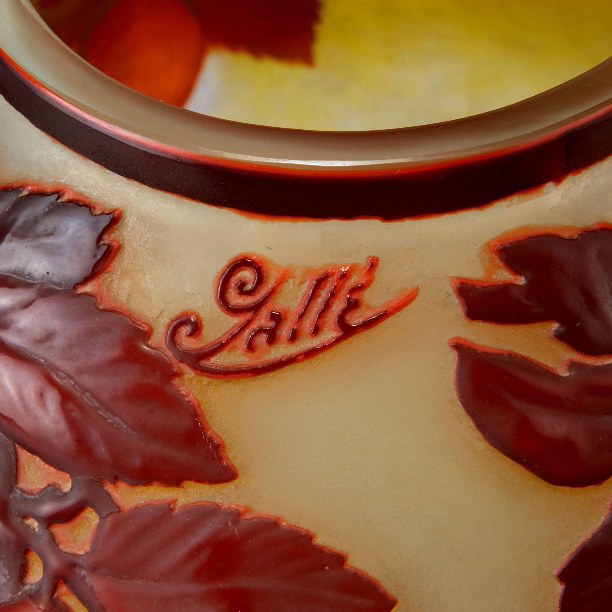 Die Soufflé-Technik bedeutete die letzte Steigerung der Glasarbeiten der Firma Gallé und wurde 1925 auf der Exposition Internationale des Arts Décoratifs in Paris vorgestellt. Vgl. Duncan/de Bartha, Glass by Gallé, London 1984, Nr. 302; Klesse/Mayr, Sammlung Funke-Kaiser, Kunstgewerbemuseum Köln, 1981, Nr. 422; Hilschenz-Mlynek/Ricke, Glassammlung Hentrich, Kunstmuseum Düsseldorf, 1985, Nr. 367, verwandte Vasen mit diesem Dekor.