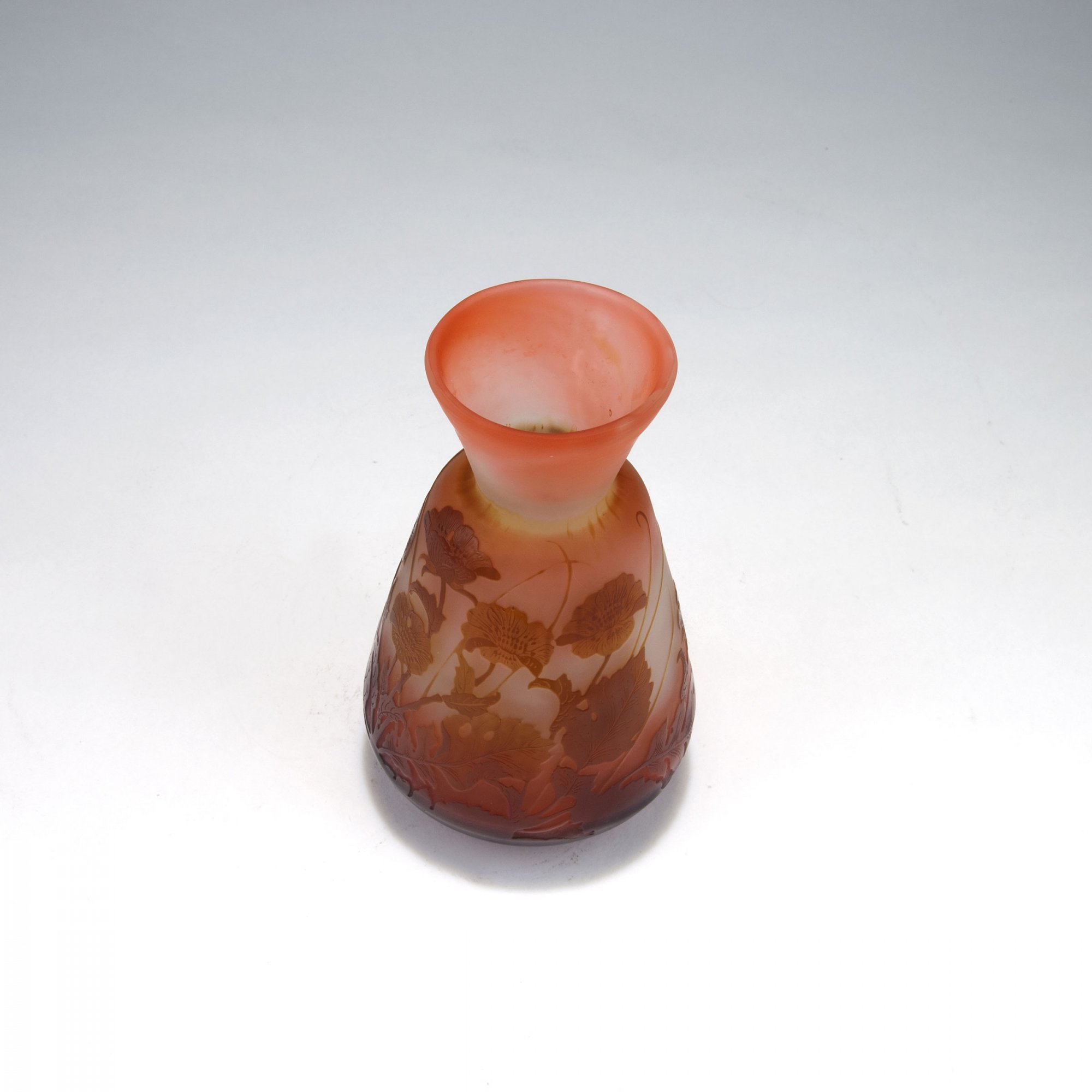 H. 15,8 cm. Überfangglas, farblos, milchigweiß, rosa und braun. In mehreren Arbeitsgängen geätztes Motiv mit Anemonen. Sign.: Gallé (hochgeätzter Schriftzug).