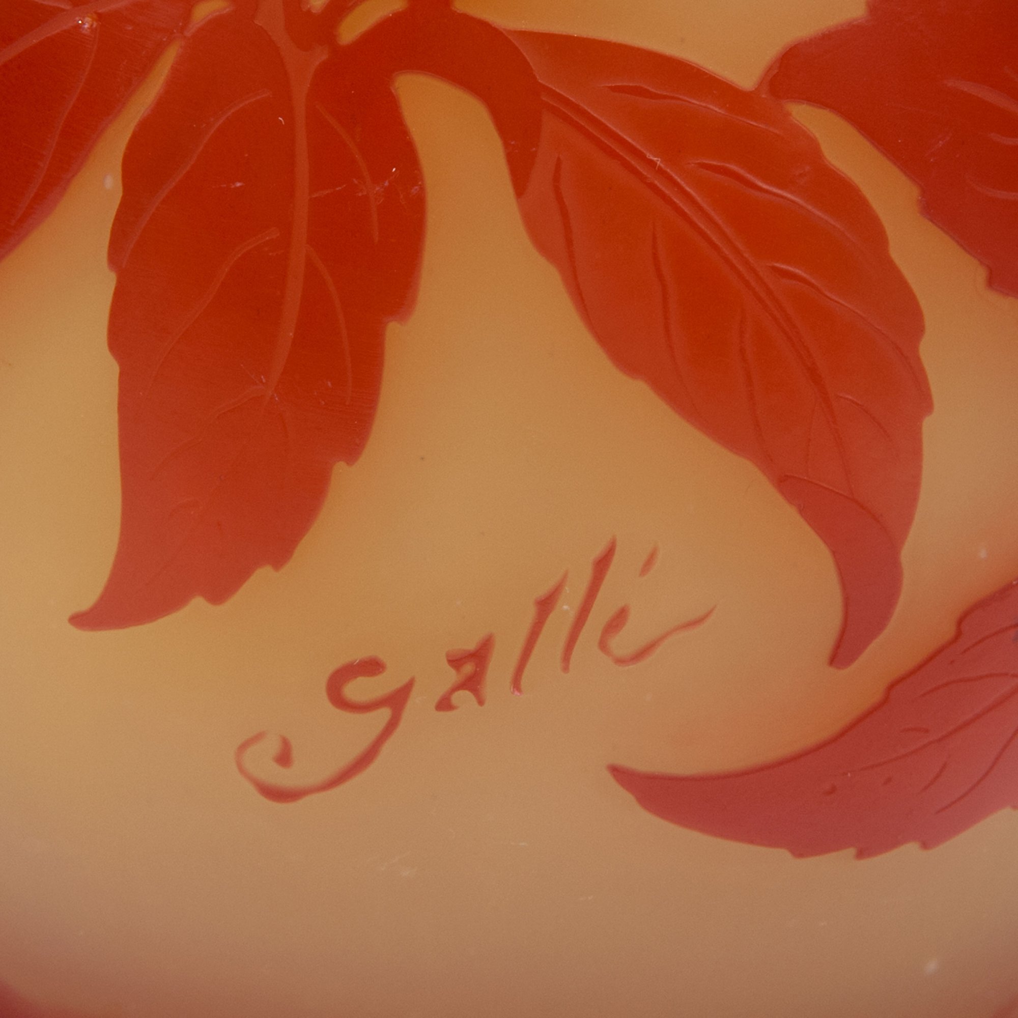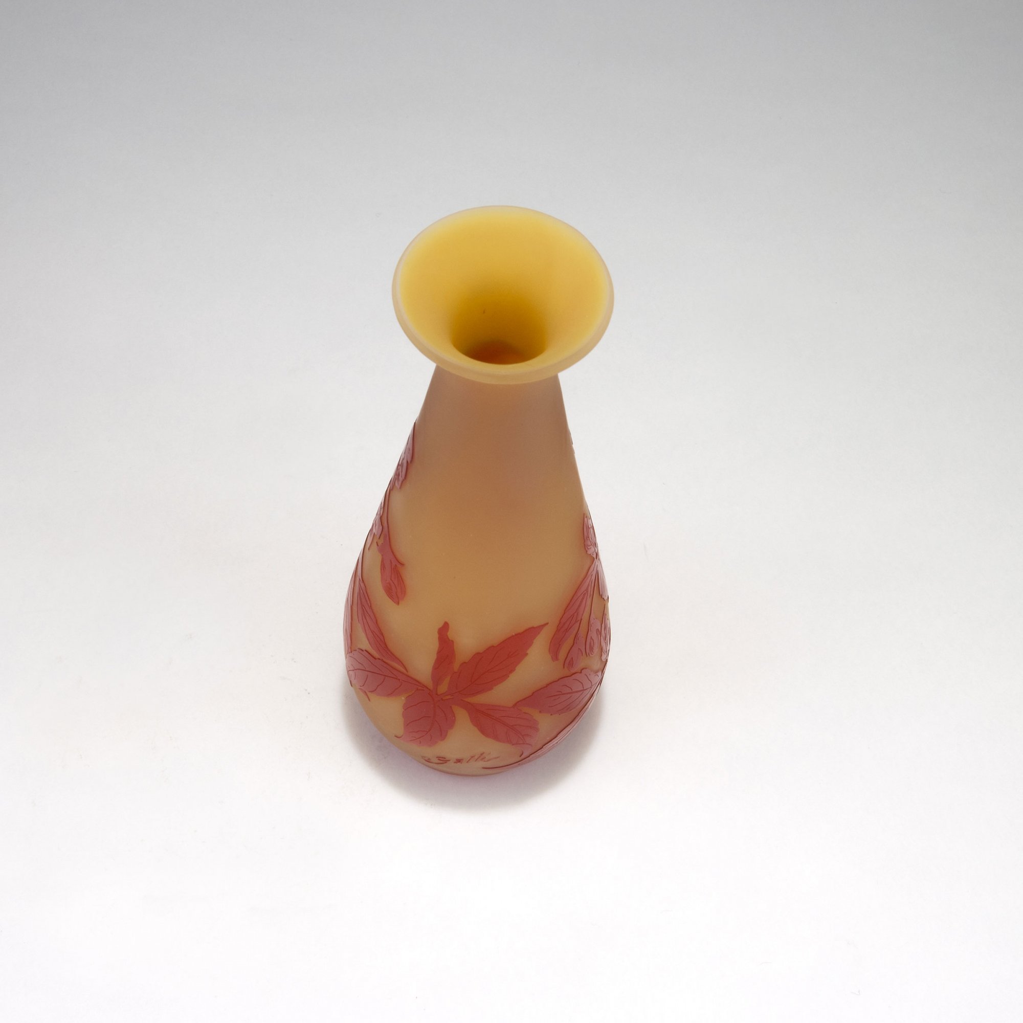 Keulenform mit Trompetenmündung. H. 20,6 cm. Überfangglas, hellbernsteinfarben, farblos und rot. In mehreren Arbeitsgängen geätzter Dekor, Motiv mit blühenden Apfelzweigen in abendlicher Stimmung. Sign.: Gallé (hochgeätzter Schriftzug).