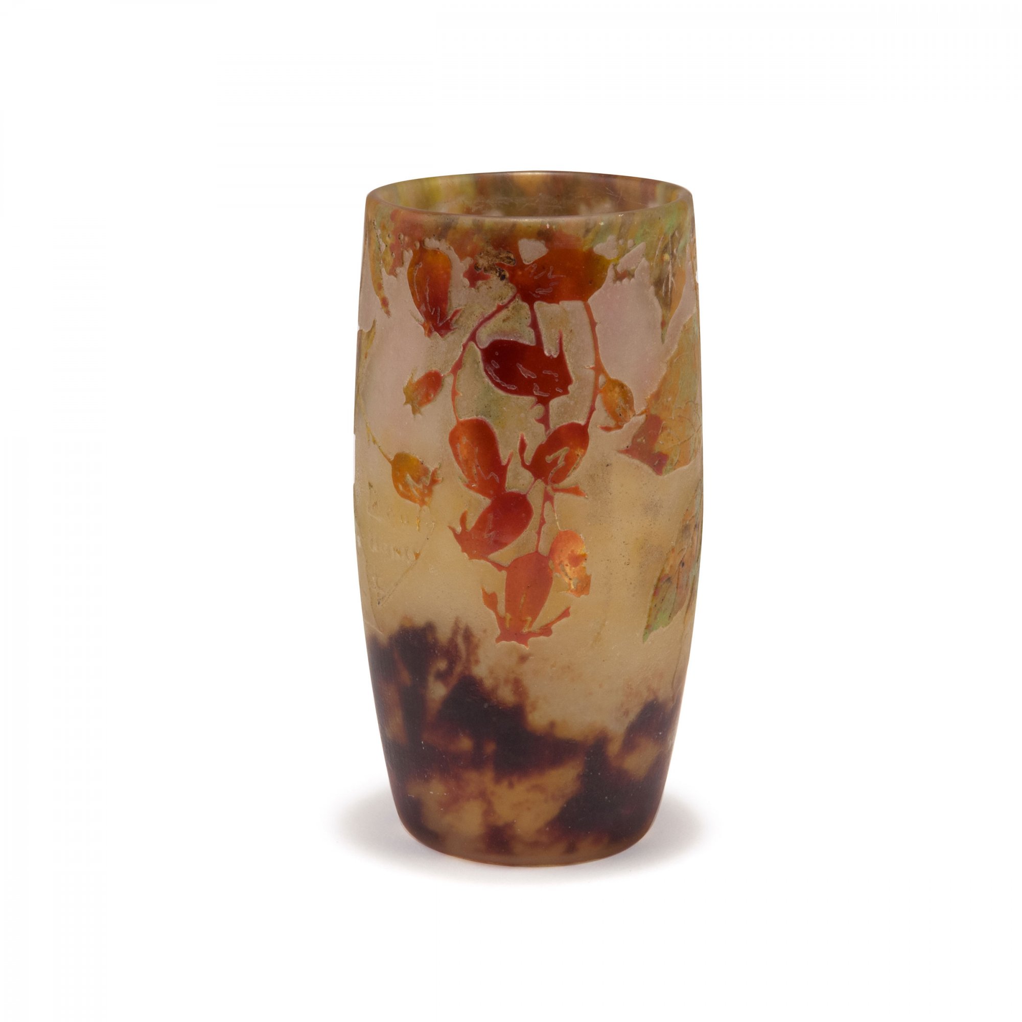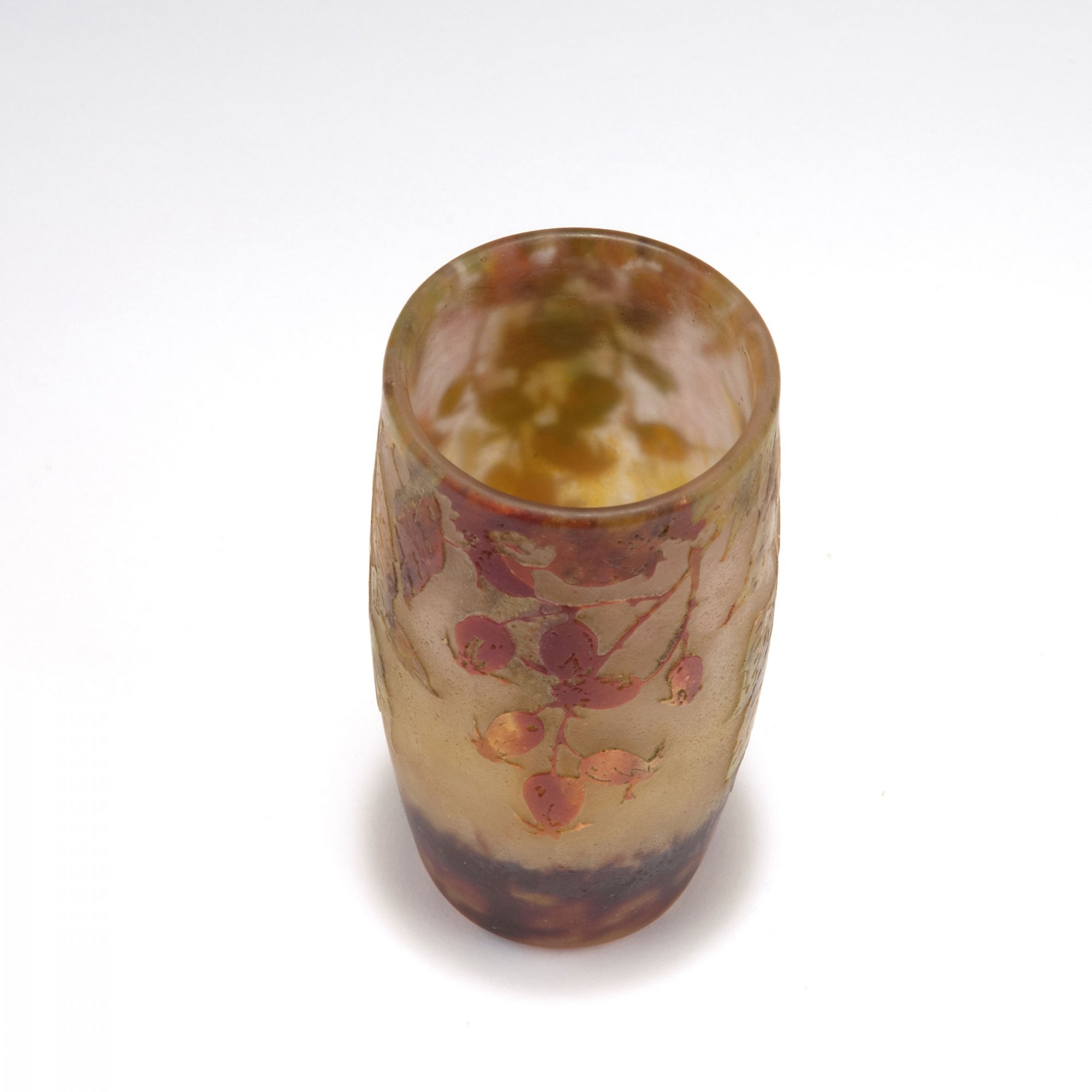 Tonnenform. H. 12 cm. Entwurf: Henri Bergé. Überfangglas, farblos, im unteren Bereich tiefviolette, im oberen Bereich milchig gelbliche Pulvereinschlüsse. Pulveraufschmelzungen (vitrifications) in grünlichen und bräunlichen Tönen. Geätzter Dekor. Motiv mit Zweigen der Hundsrose mit herbstlichem Blattwerk und Hagebutten über rauh ausgeätztem Grund, Binnenzeichnungen in Nadelätzung. Sign.: DAUM NANCY, Lothringer Kreuz (hochgeätzter Schriftzug).