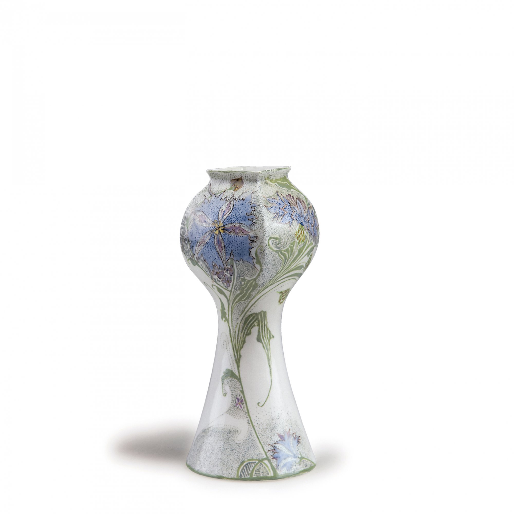 Über rundem Stand sich verjüngend, in gerippte Kugel übergehend, quadratische Mündung. H. 12 cm. Ausführung: Haagsche Plateelbakkerij Rozenburg, Den Haag. Eierschalenporzellan, weißer Scherben, polychrome Glasurmalerei. Bez.: Storchenmarke mit Krone den Haag, Jahreszeichen für 1903, Fenster 599, Künstlersignet JW.
