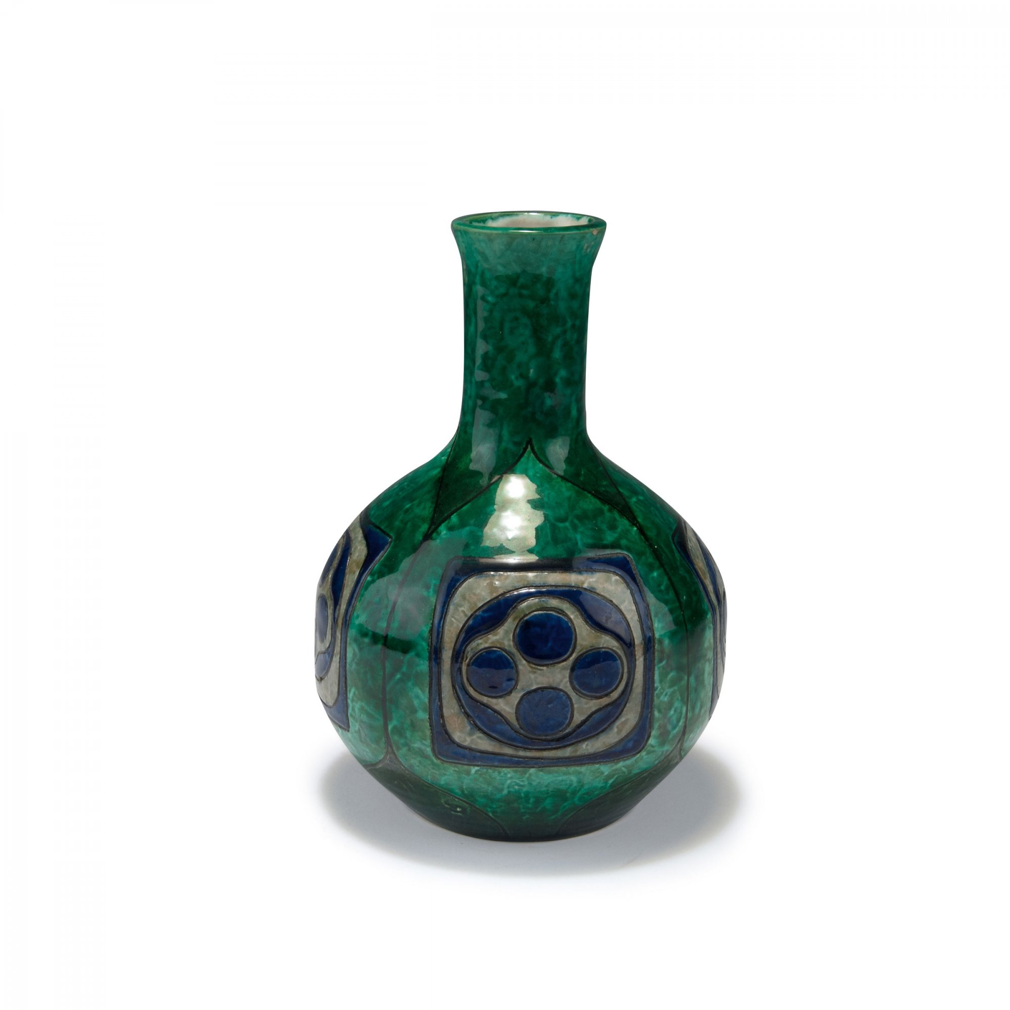 H. 19,4 cm. Steingutscherben, Ritzdekor. Grün, blau und grau glasiert. Bez.: Manufakturmarke (gemalt), 273, Z (schwarz).