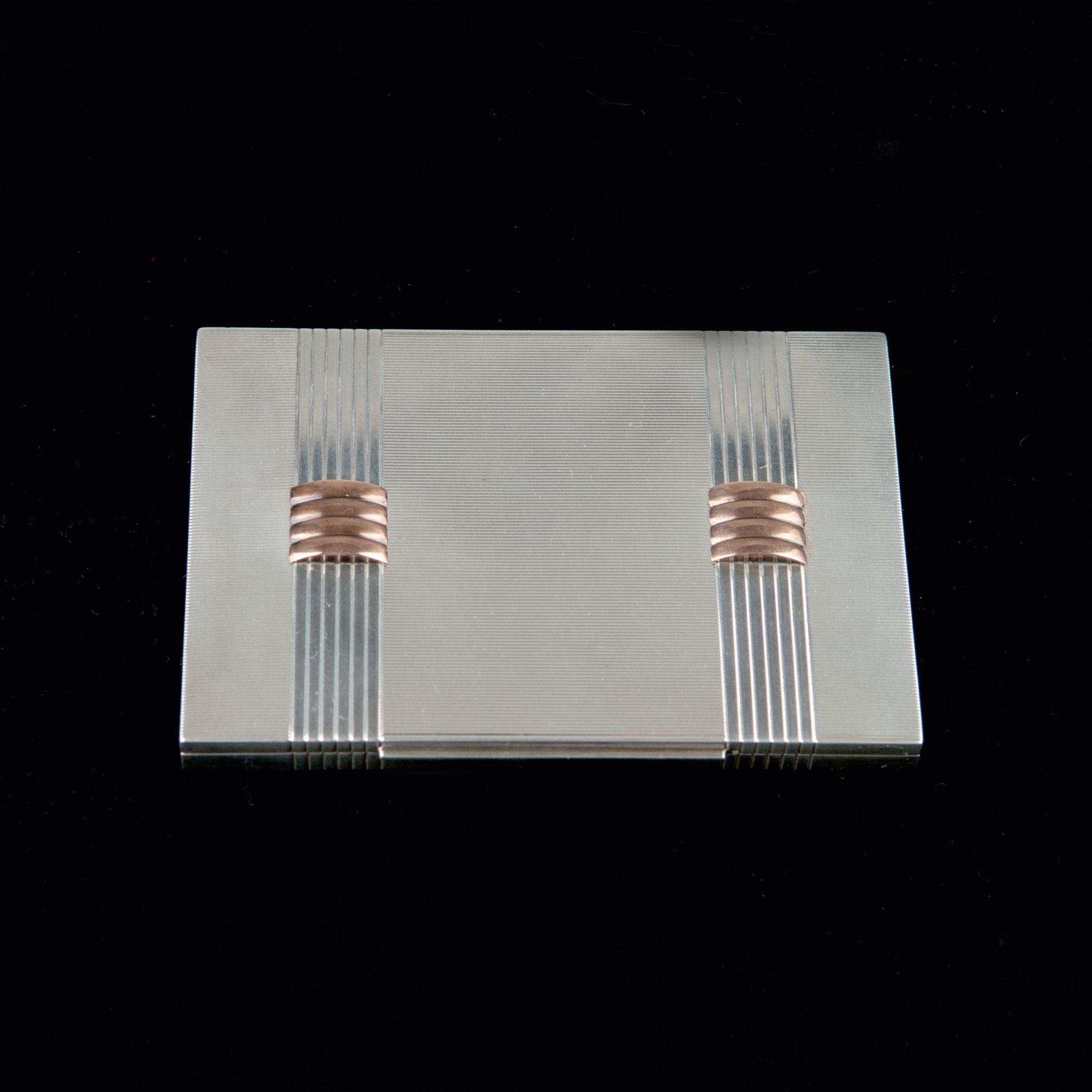H. 1,3 cm, 11,8 x 8,4 cm. Silber, partiell vergoldet. Gest.: 925, Werkstattmarke LK.