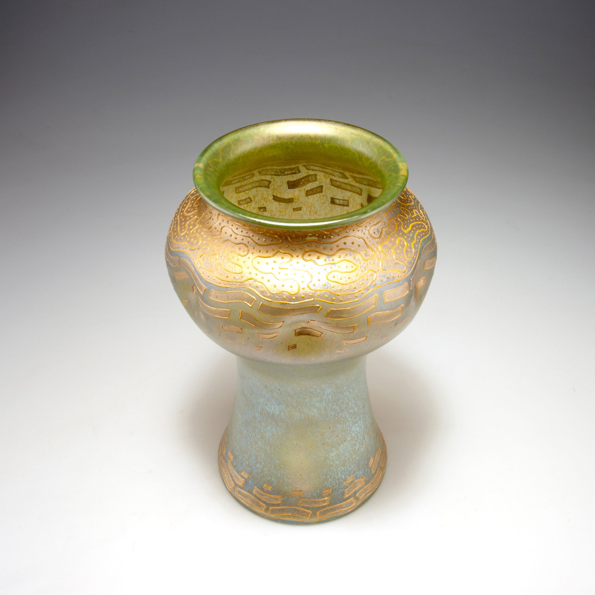 Balusterform mit sechsfach eingedrückter Schulter. H. 28,4 cm. Farbloses Glas, dichte, silbergelbe Kröselaufschmelzungen, perlmuttfarben mattlüstriert. Ornamentale Reliefgoldmalerei.