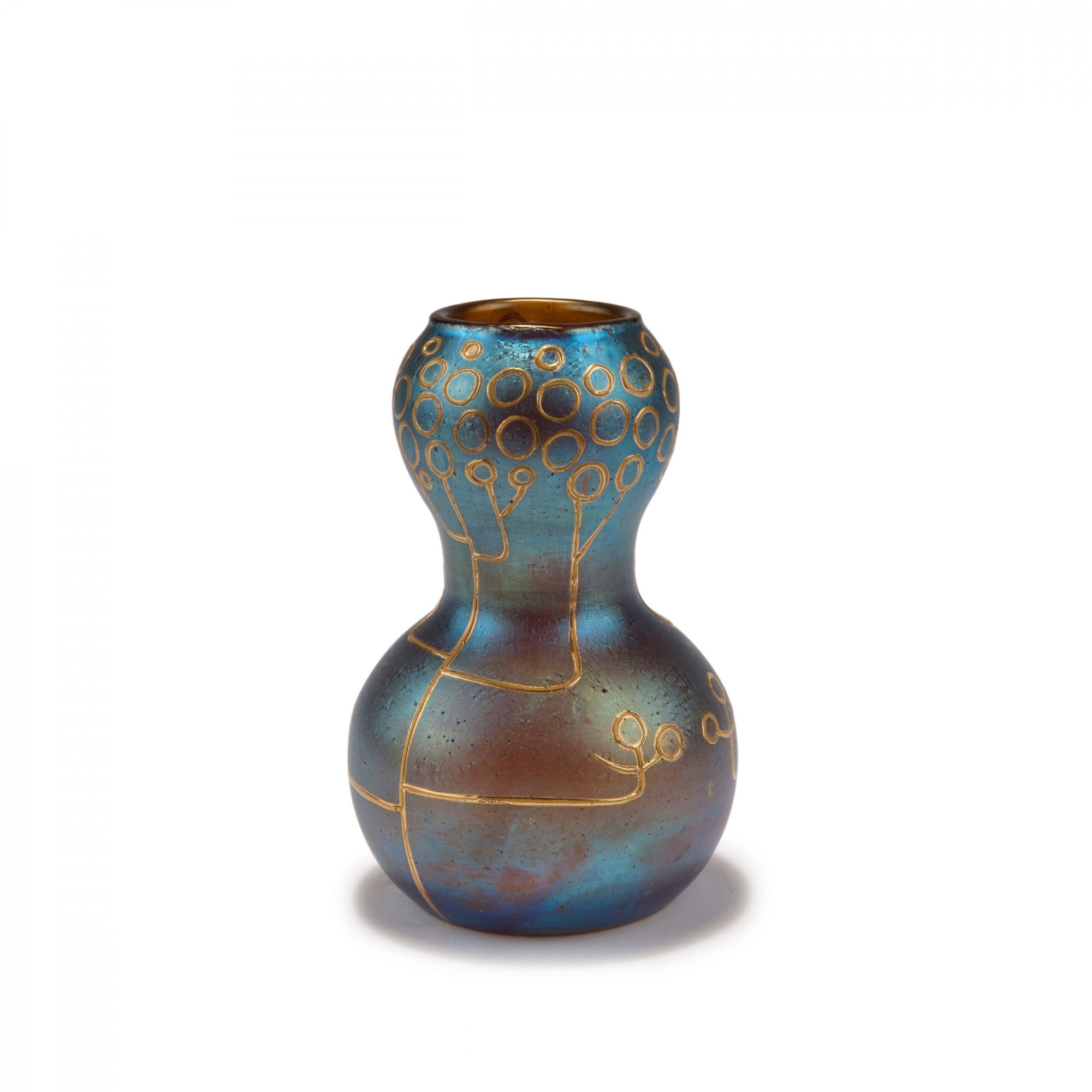 Doppelkürbisform. H. 12 cm. Farbloses Glas, dicht silbergelbe Kröselaufschmelzungen, candia Silberiris, perlmuttfarben mattlüstriert, Goldemailmalerei mit stilisierten Beeren.