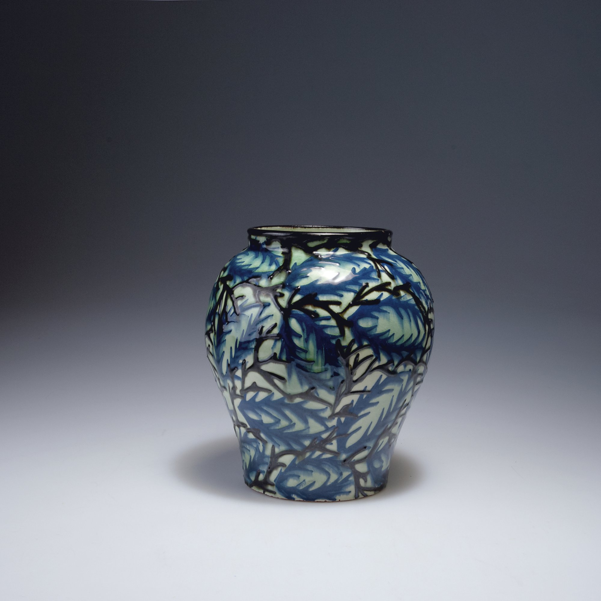 Balusterform mit geradem Hals. H. 21,1 cm. Ausführung: Großherzogl. Majolikamanufaktur, Karlsruhe. Majolikascherben, weiß engobiert, Schlickermalerei in Blau und Schwarz. Ranken. Bez.: Manufakturmarke, 1866, PROF. LÄUGER, MADE IN GERMANY (geprägt).