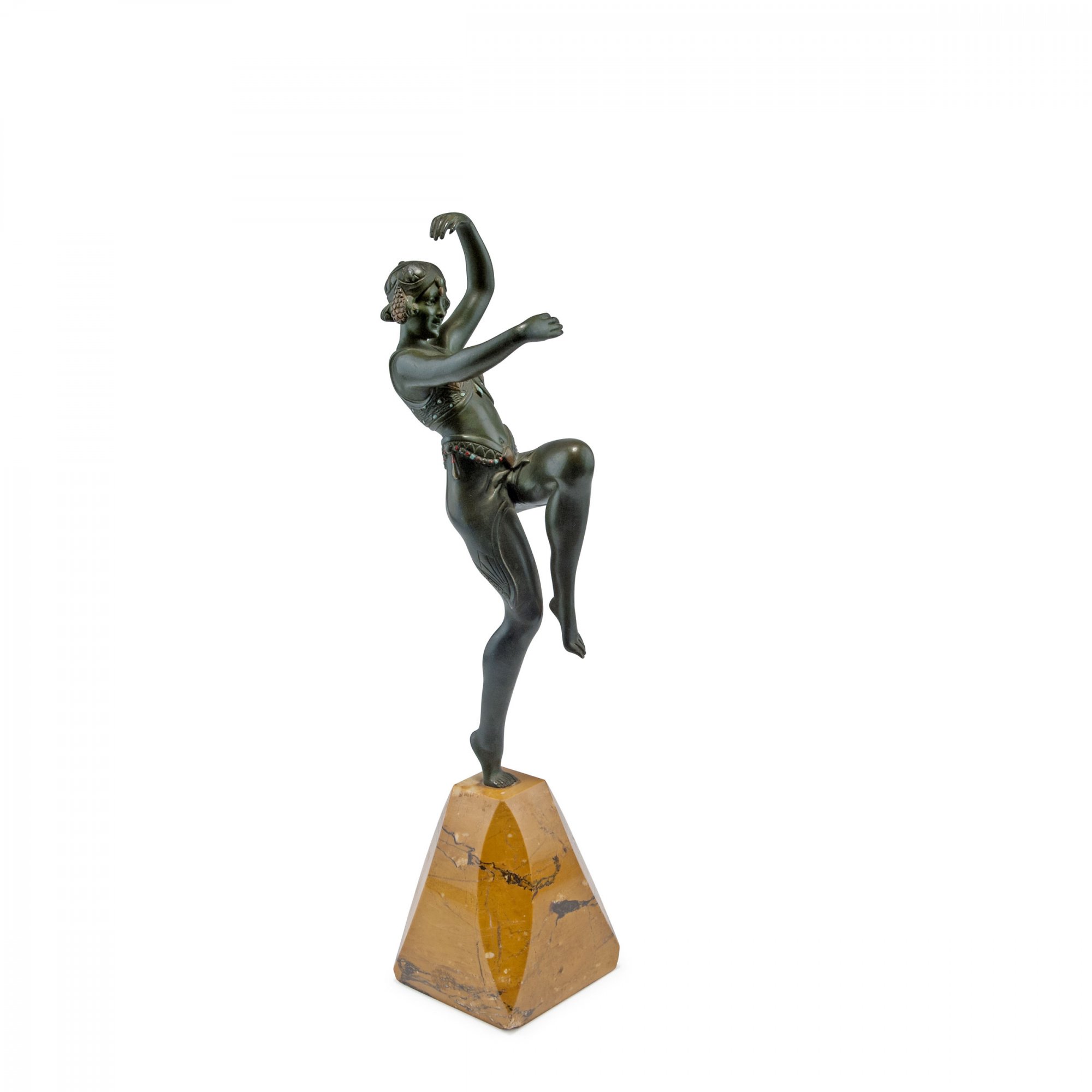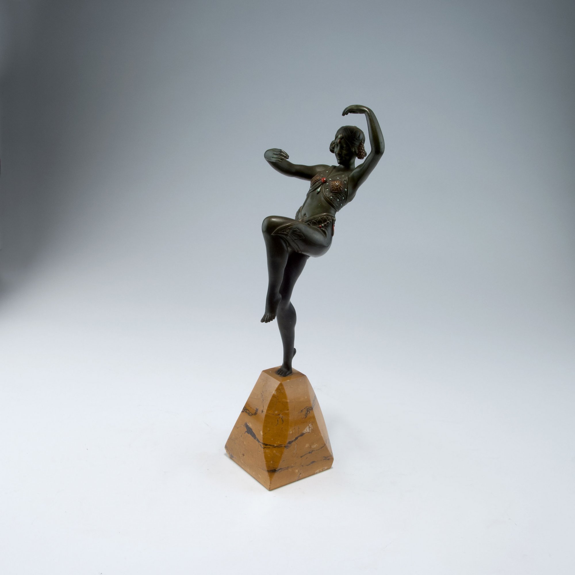 In Pose auf Marmorsockel. H. 39,6 cm (mit Sockel). Bronzeguss, grün und goldfarben patiniert sowie blau und rot emailiert. Signiert: S. LIPCHYTZ.