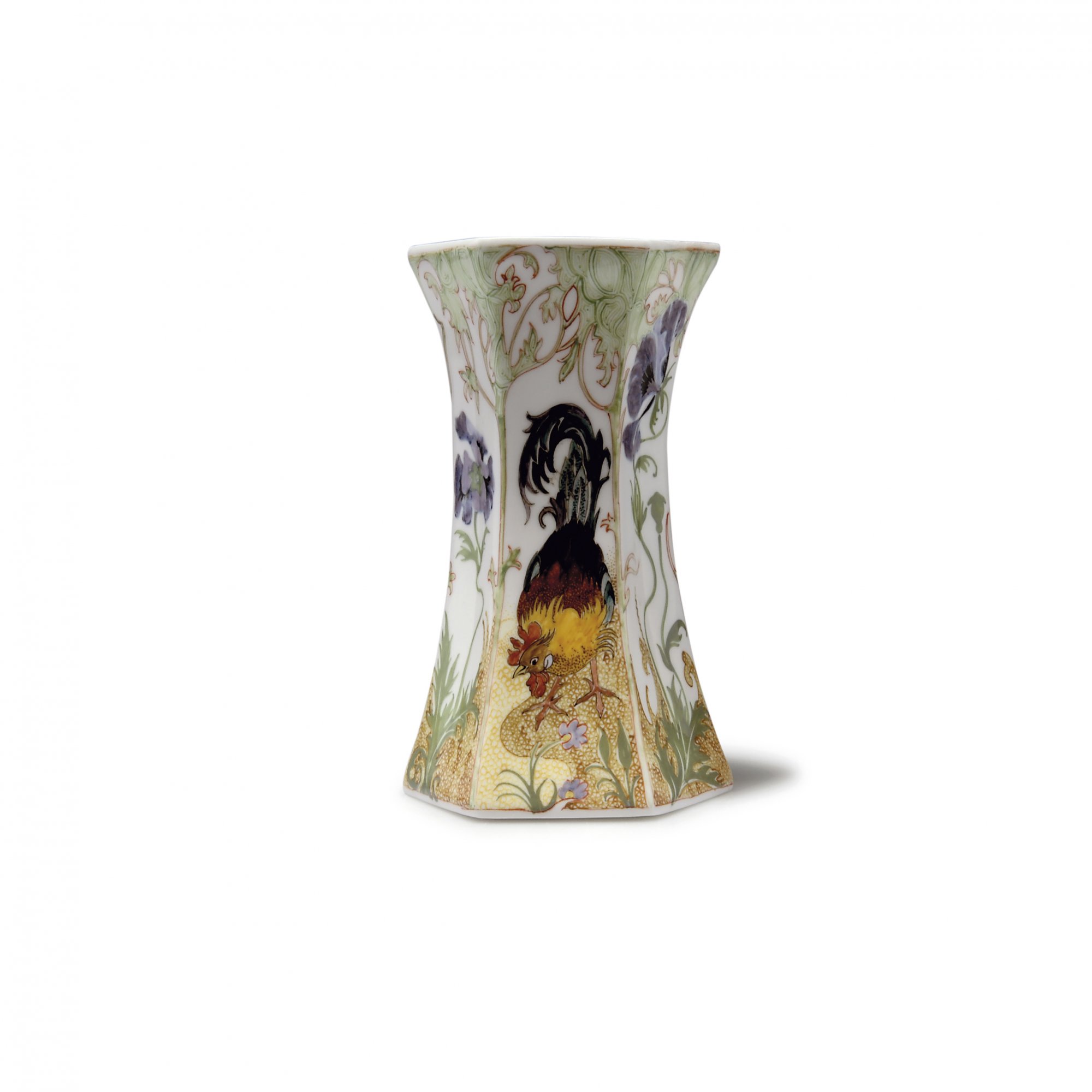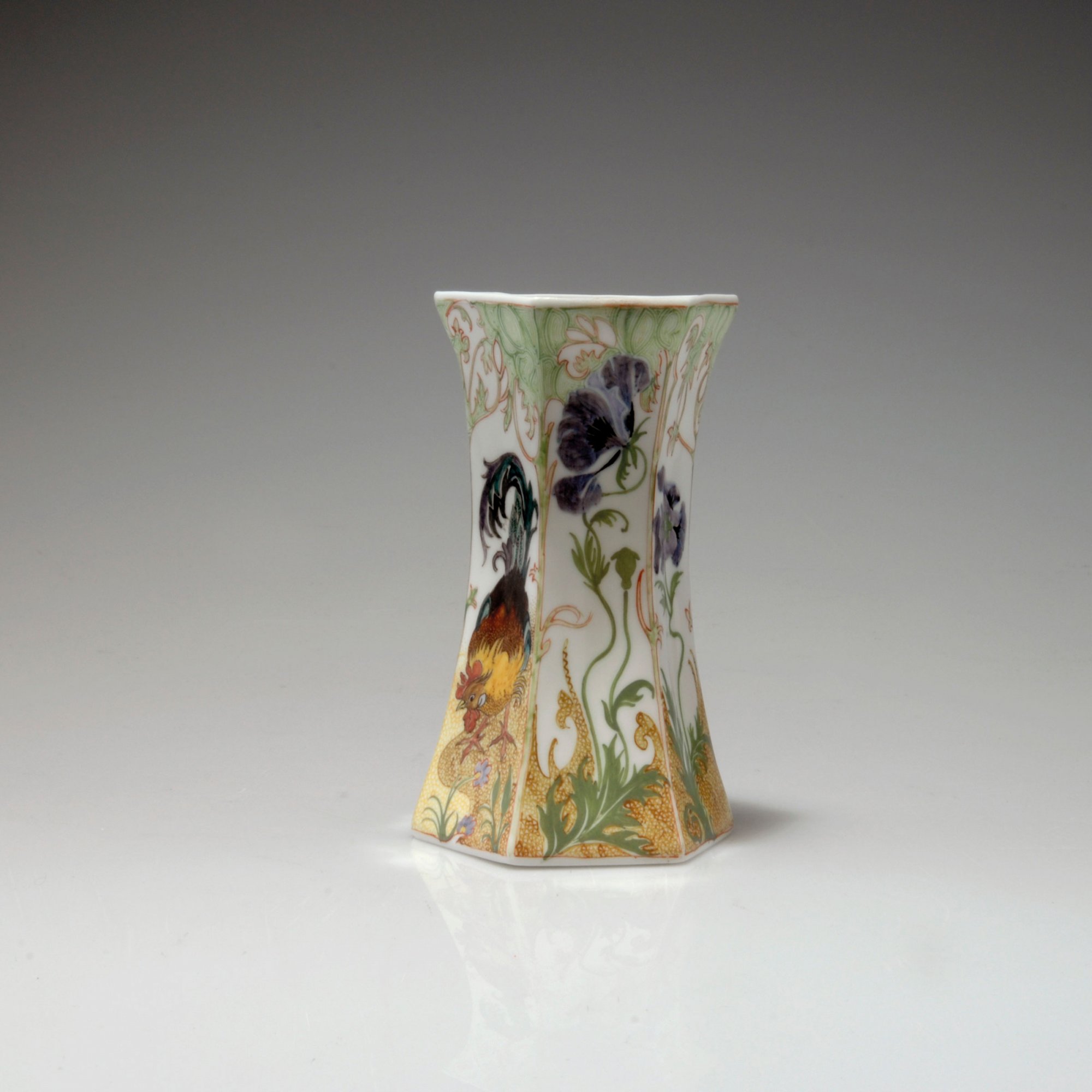 Auf sechseckigem Stand stark einschwingender, gekanteter Korpus mit ausgestellter, analoger Mündung. H. 12 cm. Ausführung: Haagsche Plateelbakkerij Rozenburg, Den Haag. Eierschalenporzellan, weißlicher Scherben. Polychrome Glasurmalerei, Motiv mit Hahn und violetten Mohnblumen. Bez.: Storchenmarke den Haag (schwarz gemalt), Jahreszeichen, Fenster, Auftragsnummer 254, Künstlersignet (schwarzer Schriftzug).