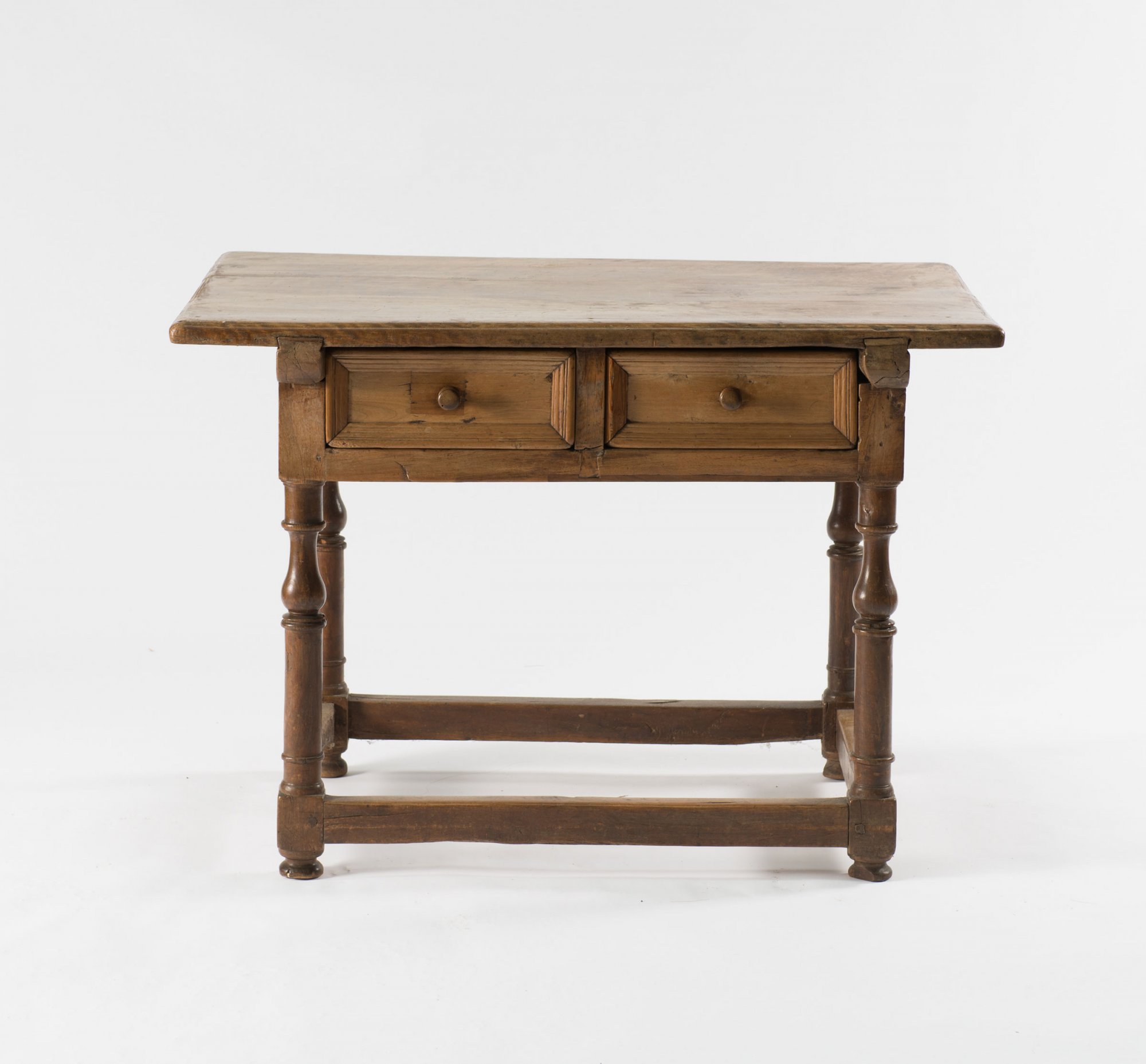 Balusterbeine mit Querstreben, zweischübige Zarge, überstehende Platte. H. 73,5 cm, 104,5 x 65,8 cm. Weichholz.